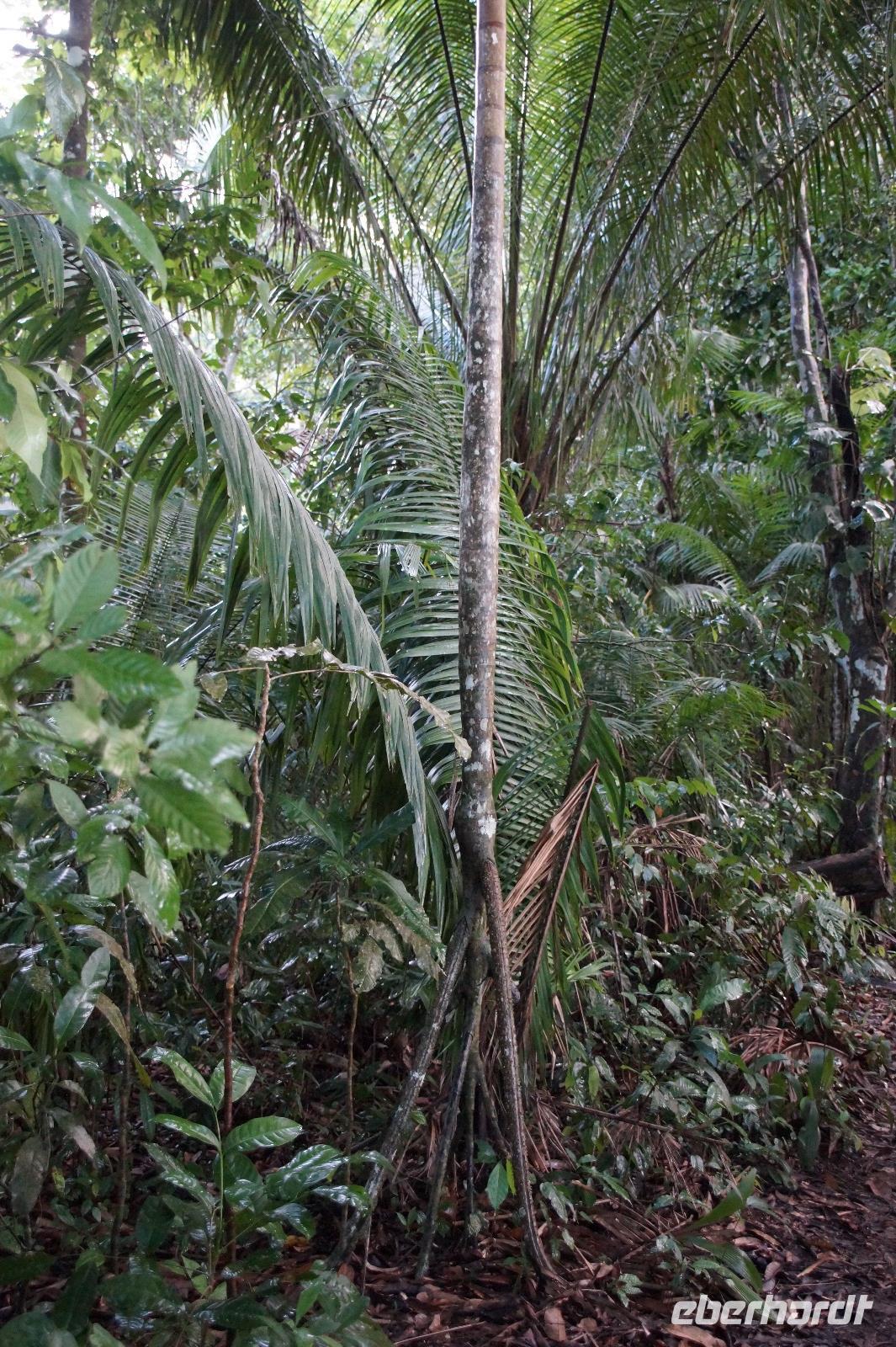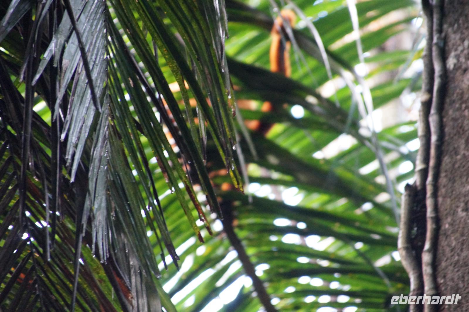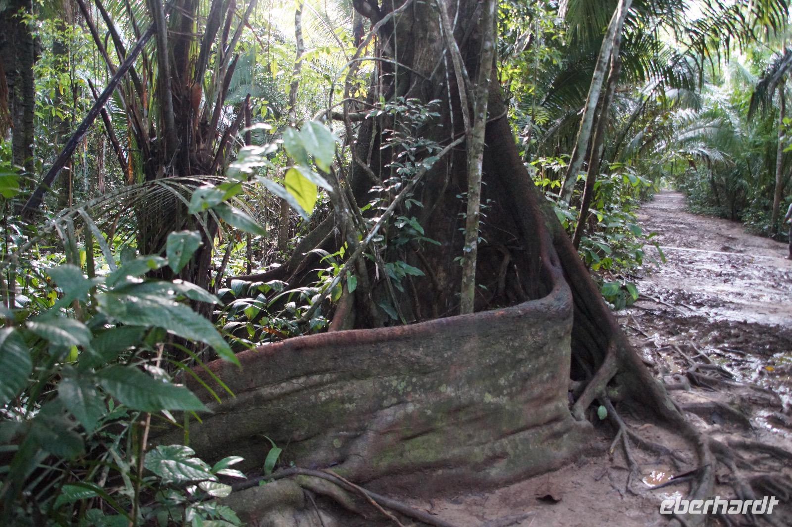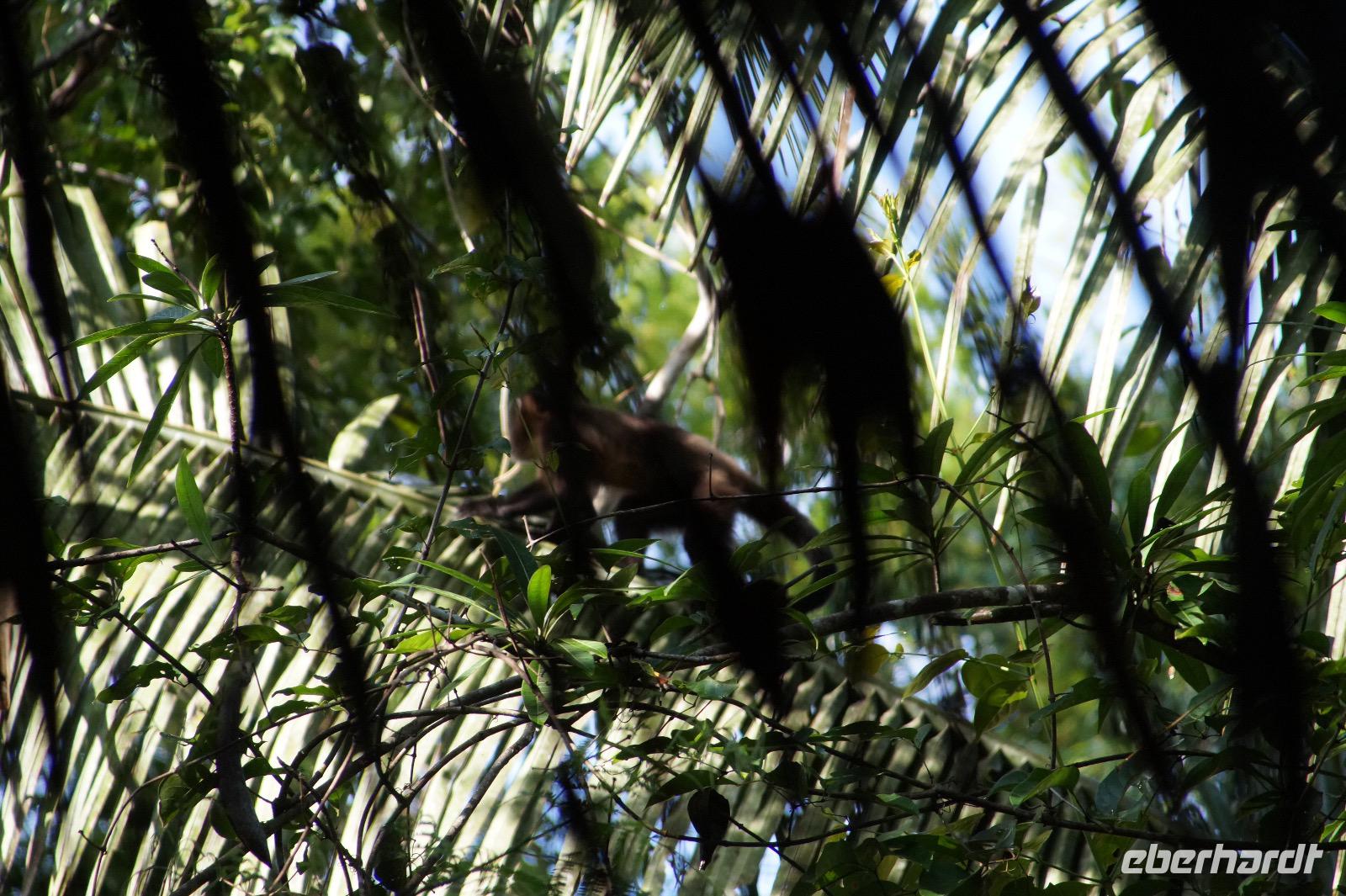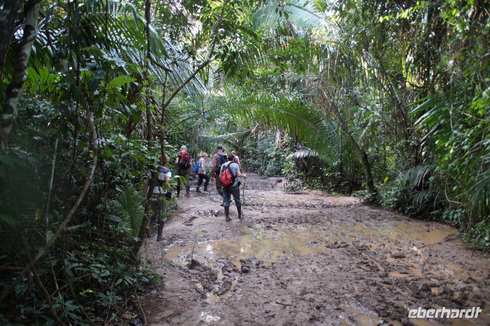 Als erstes Highlight sehen wir ein Kapuzineräffchen welches in den Baumkronen herumturnt. Ansonsten hören wir die Tiere eher, als dass wir sie sehen. Nur die Mücken kleben an uns, trotz ausdrücklicher Ausladung. Jedes Mal, wenn wir stehen bleiben, sei es, weil wir etwas sehen, sei es, weil wir im Matsch den besten Weg suchen, nutzen Sie ihre Gelegenheit.