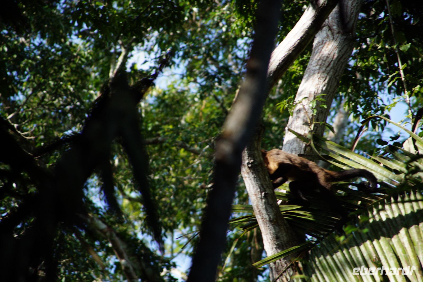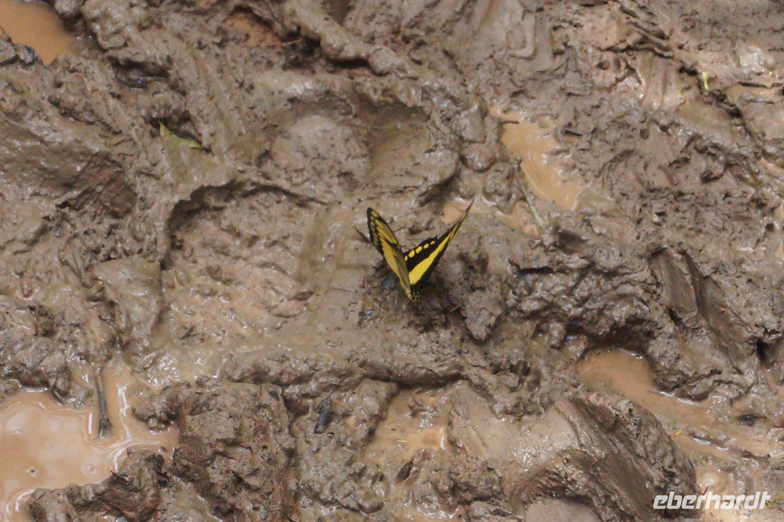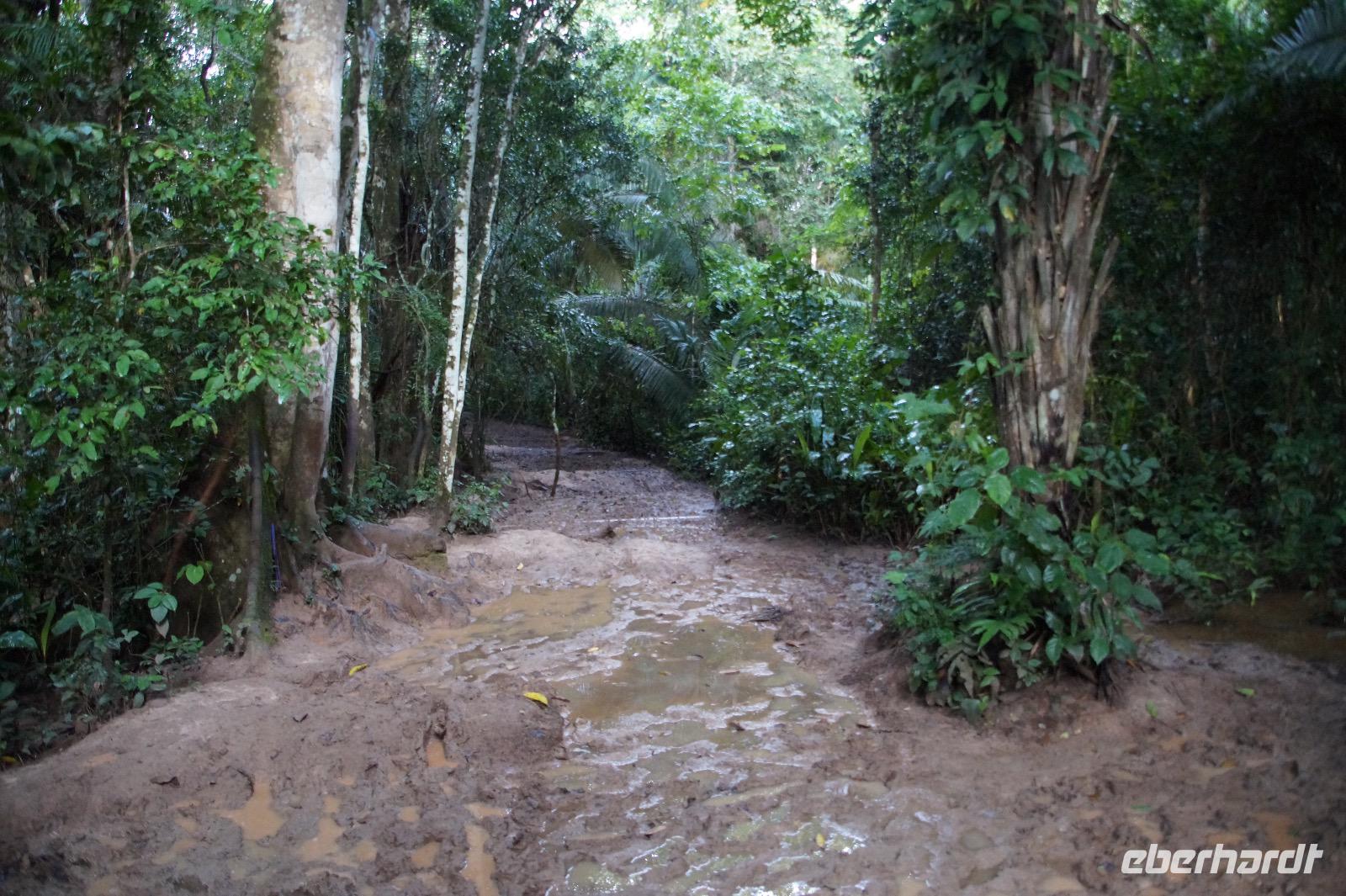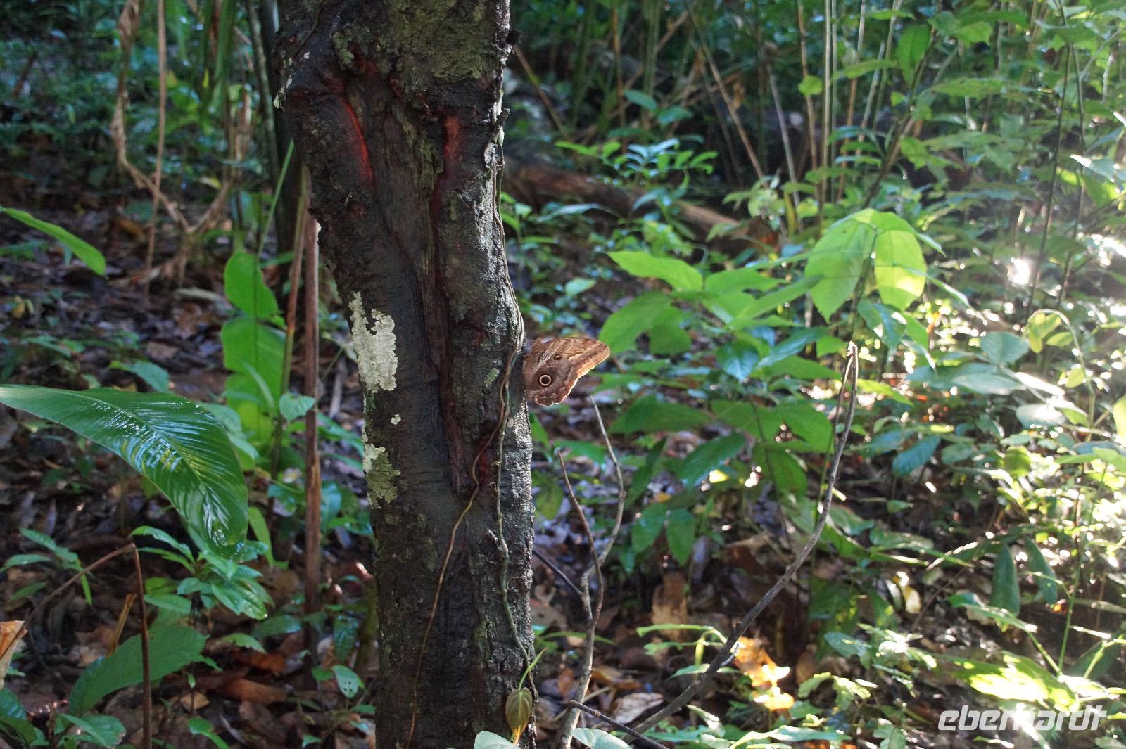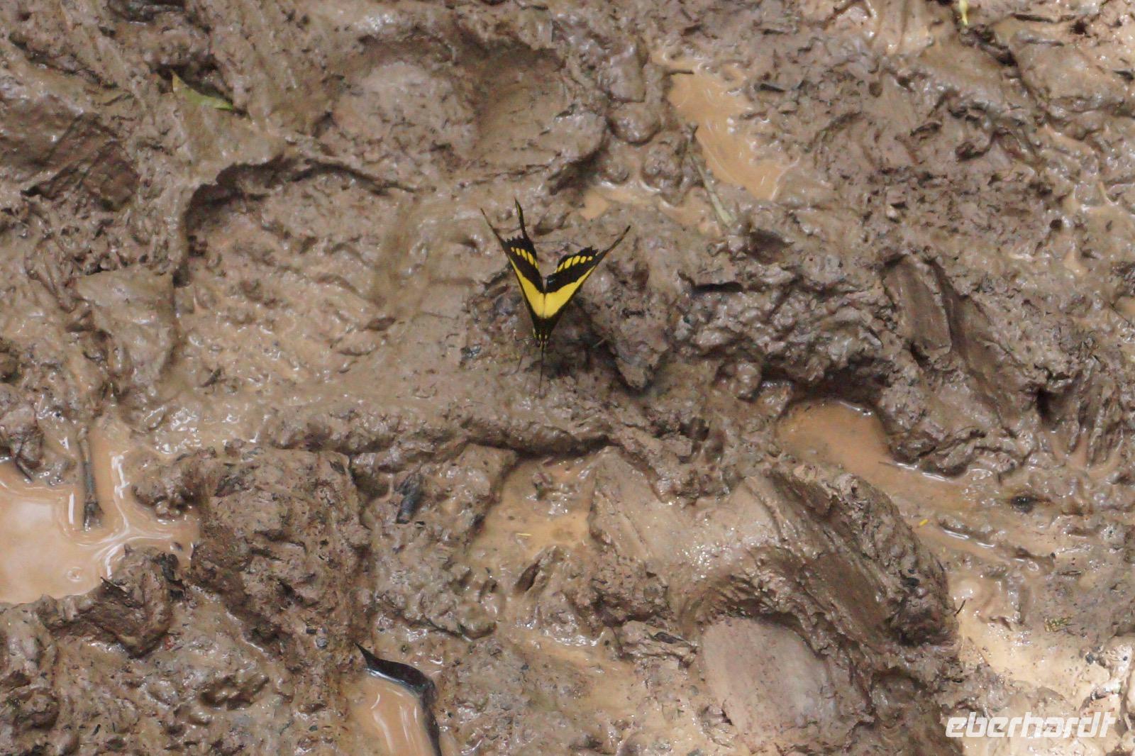Als erstes Highlight sehen wir ein Kapuzineräffchen welches in den Baumkronen herumturnt. Ansonsten hören wir die Tiere eher, als dass wir sie sehen. Nur die Mücken kleben an uns, trotz ausdrücklicher Ausladung. Jedes Mal, wenn wir stehen bleiben, sei es, weil wir etwas sehen, sei es, weil wir im Matsch den besten Weg suchen, nutzen Sie ihre Gelegenheit.