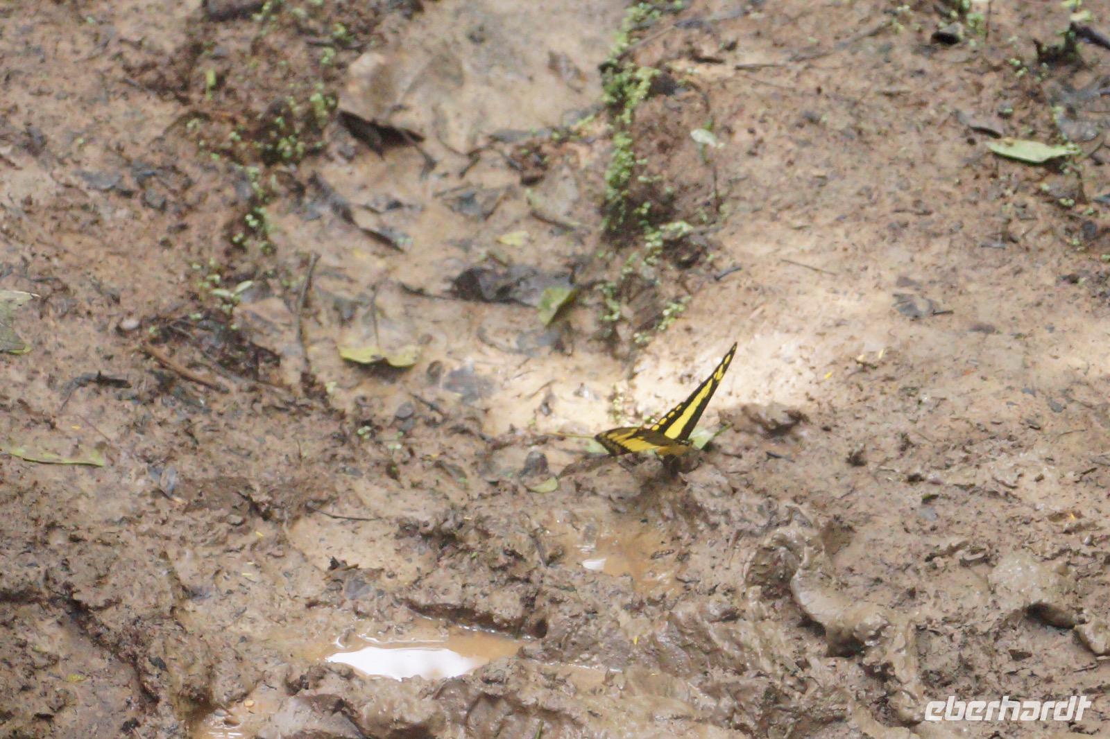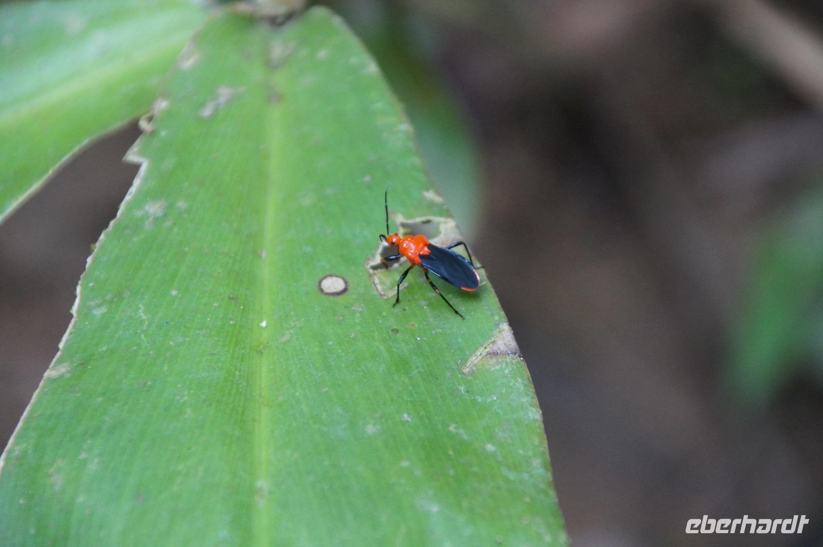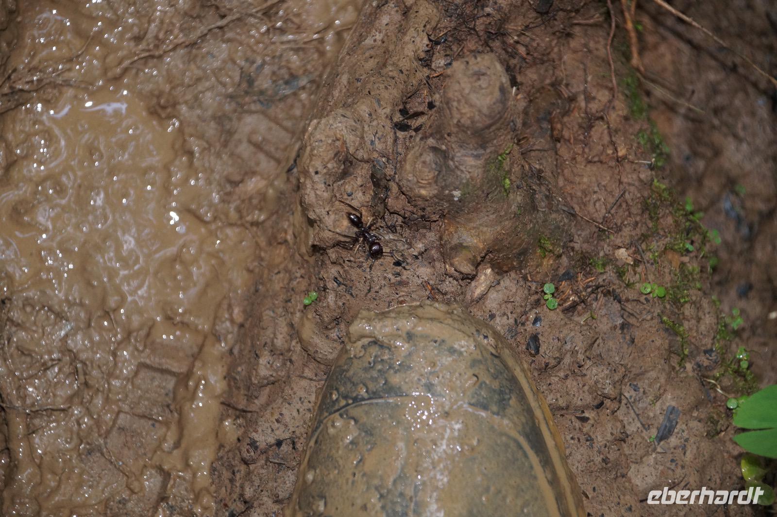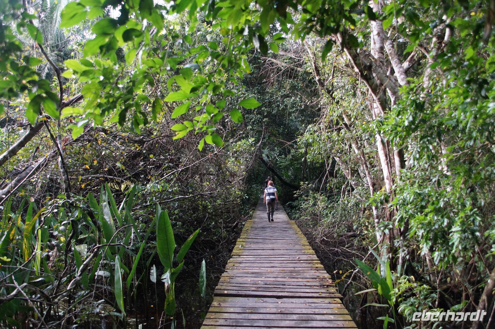 Als erstes Highlight sehen wir ein Kapuzineräffchen welches in den Baumkronen herumturnt. Ansonsten hören wir die Tiere eher, als dass wir sie sehen. Nur die Mücken kleben an uns, trotz ausdrücklicher Ausladung. Jedes Mal, wenn wir stehen bleiben, sei es, weil wir etwas sehen, sei es, weil wir im Matsch den besten Weg suchen, nutzen Sie ihre Gelegenheit.