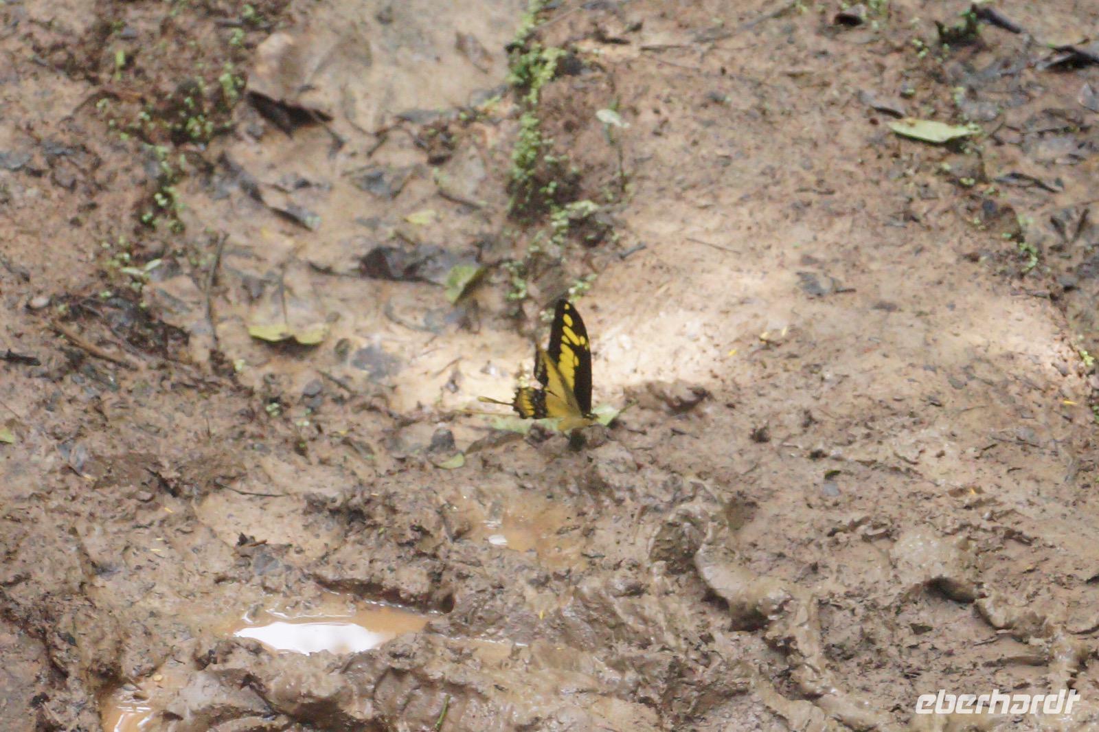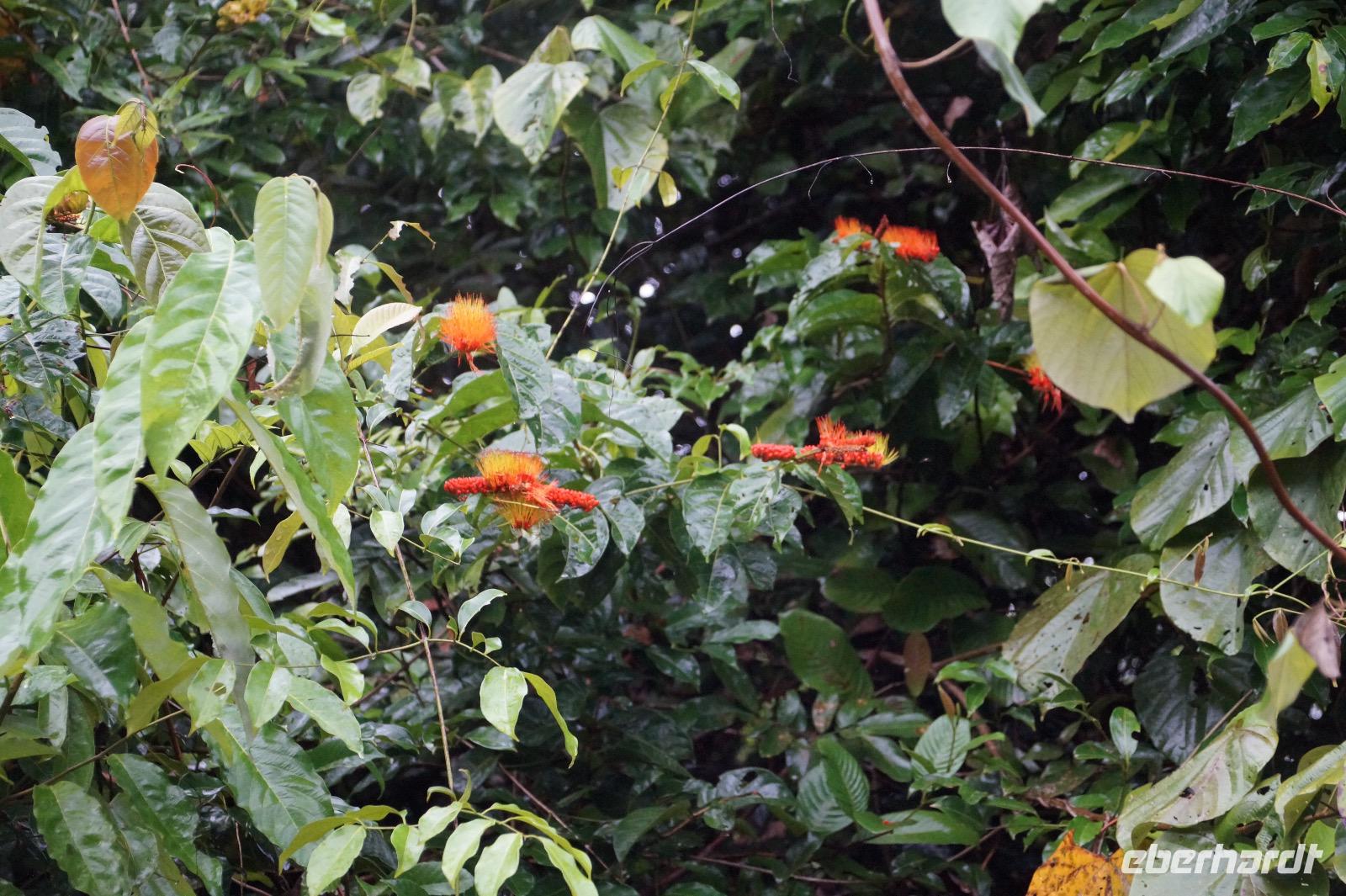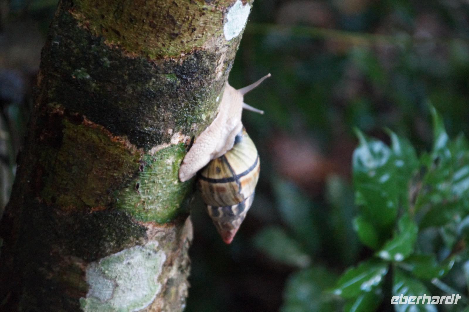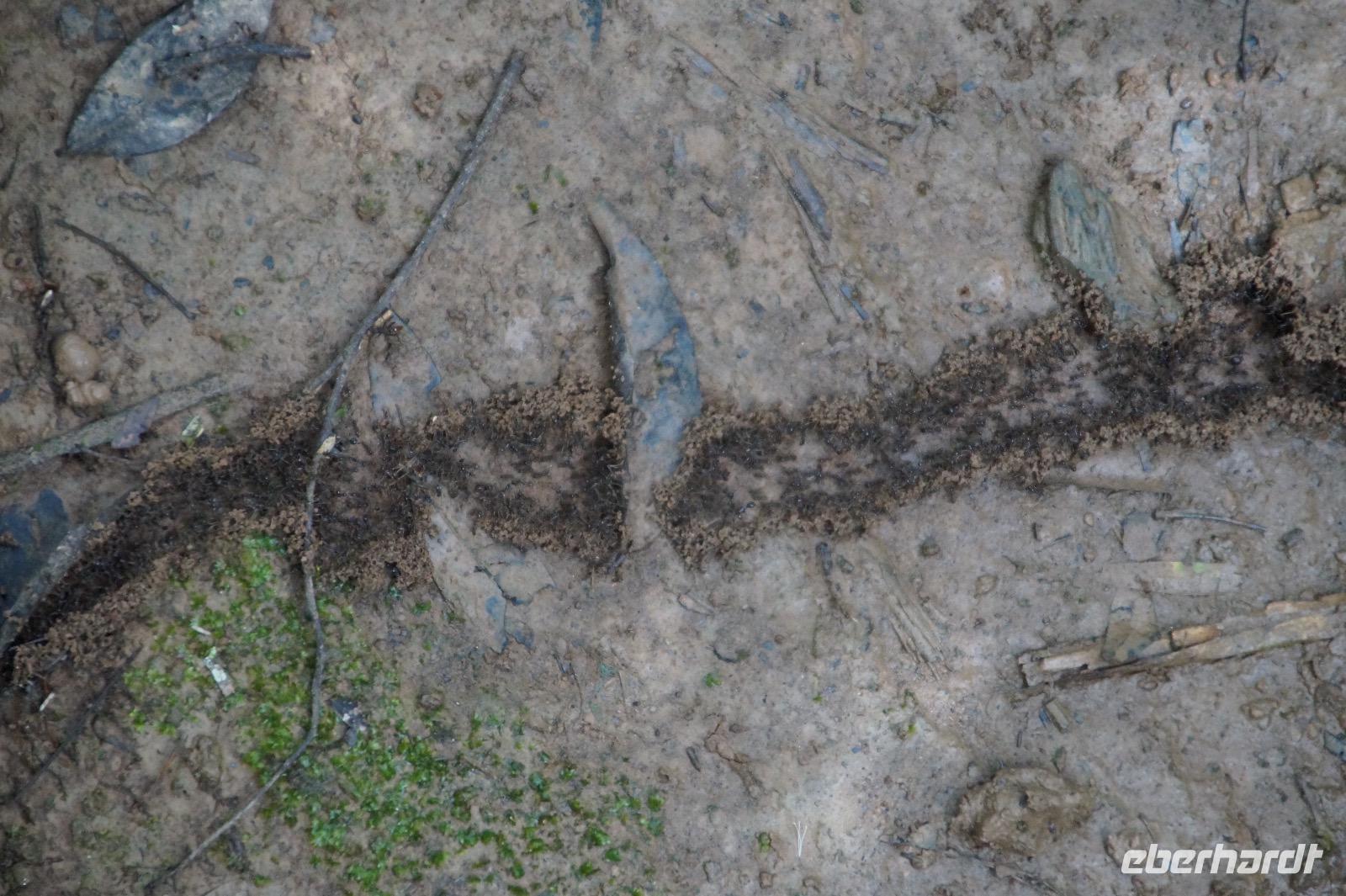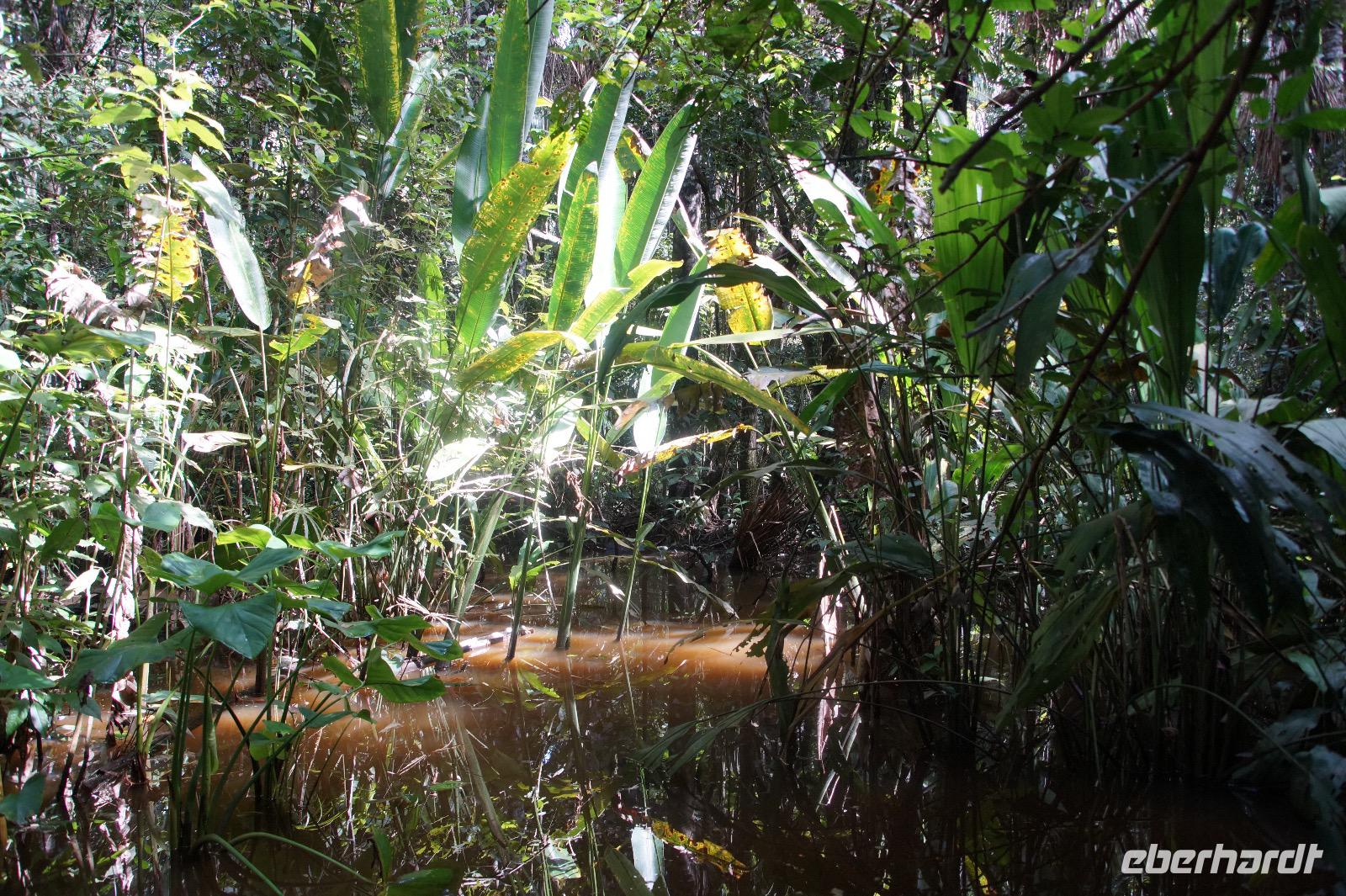 Als erstes Highlight sehen wir ein Kapuzineräffchen welches in den Baumkronen herumturnt. Ansonsten hören wir die Tiere eher, als dass wir sie sehen. Nur die Mücken kleben an uns, trotz ausdrücklicher Ausladung. Jedes Mal, wenn wir stehen bleiben, sei es, weil wir etwas sehen, sei es, weil wir im Matsch den besten Weg suchen, nutzen Sie ihre Gelegenheit.