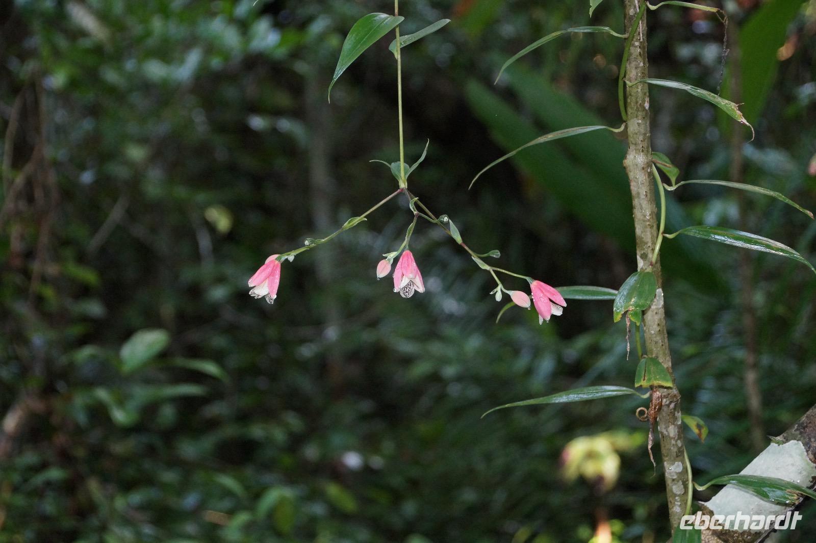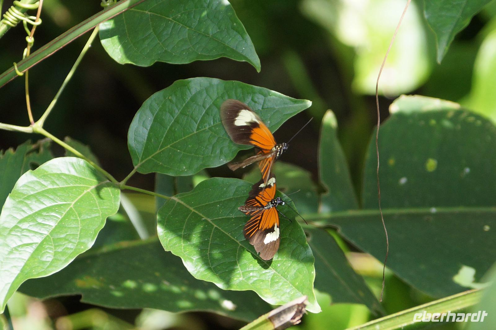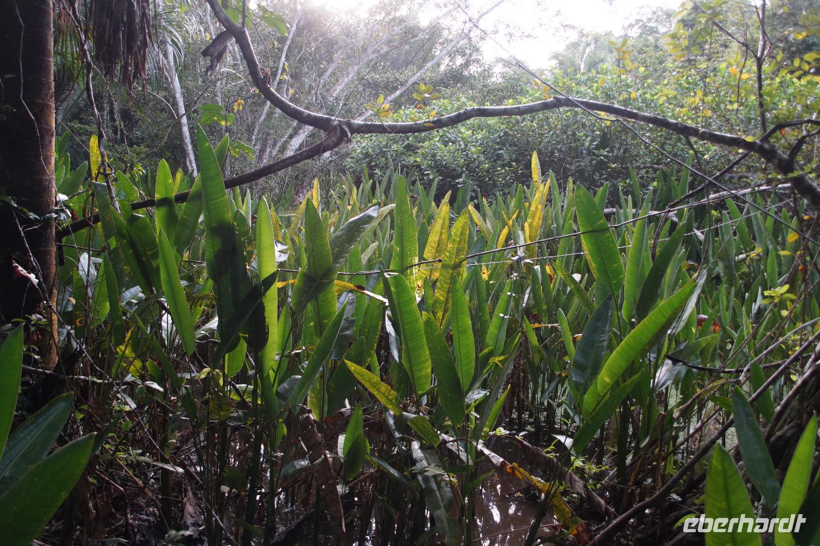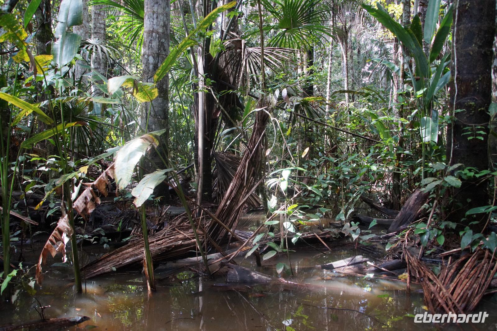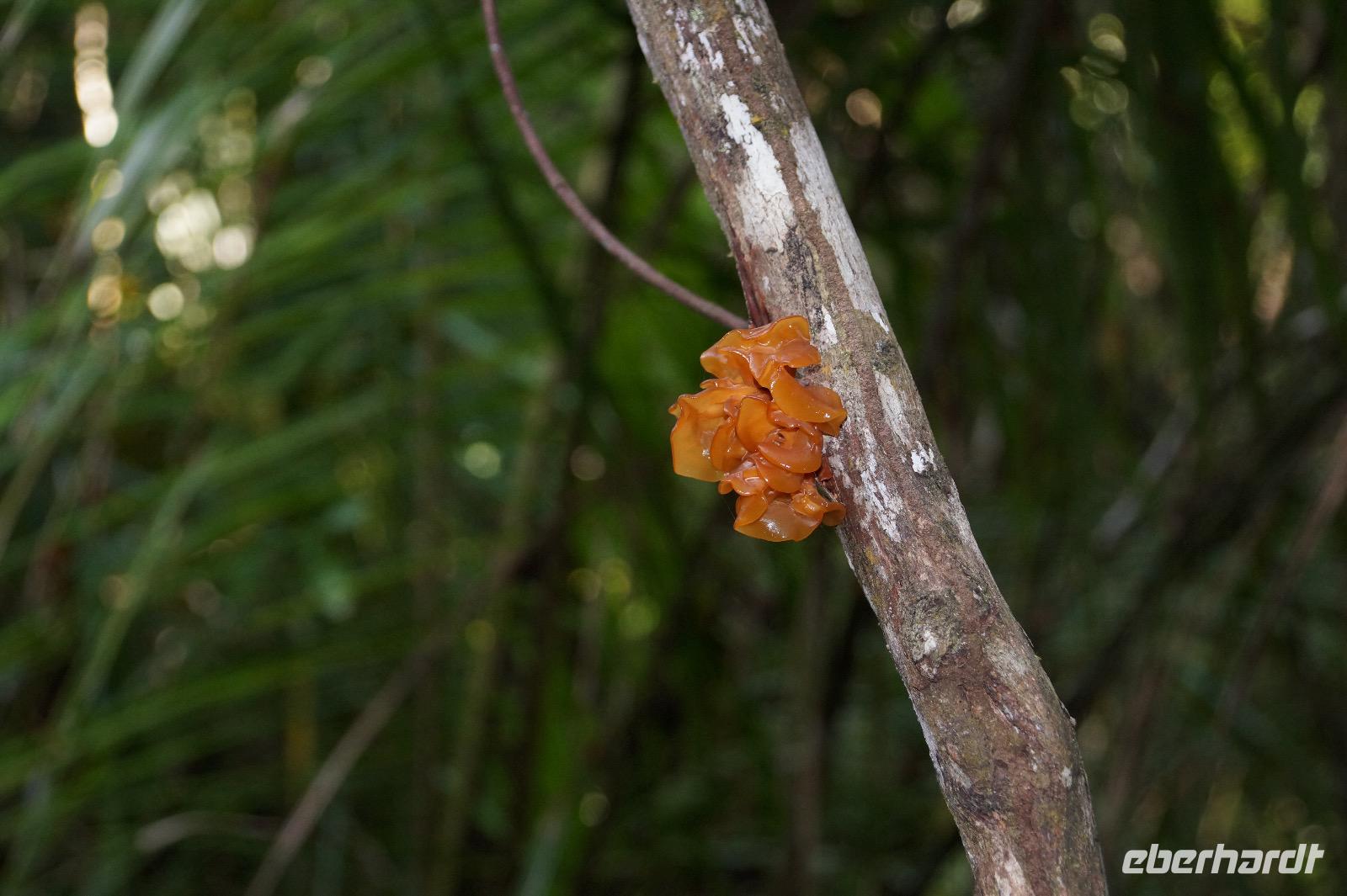 Als erstes Highlight sehen wir ein Kapuzineräffchen welches in den Baumkronen herumturnt. Ansonsten hören wir die Tiere eher, als dass wir sie sehen. Nur die Mücken kleben an uns, trotz ausdrücklicher Ausladung. Jedes Mal, wenn wir stehen bleiben, sei es, weil wir etwas sehen, sei es, weil wir im Matsch den besten Weg suchen, nutzen Sie ihre Gelegenheit.