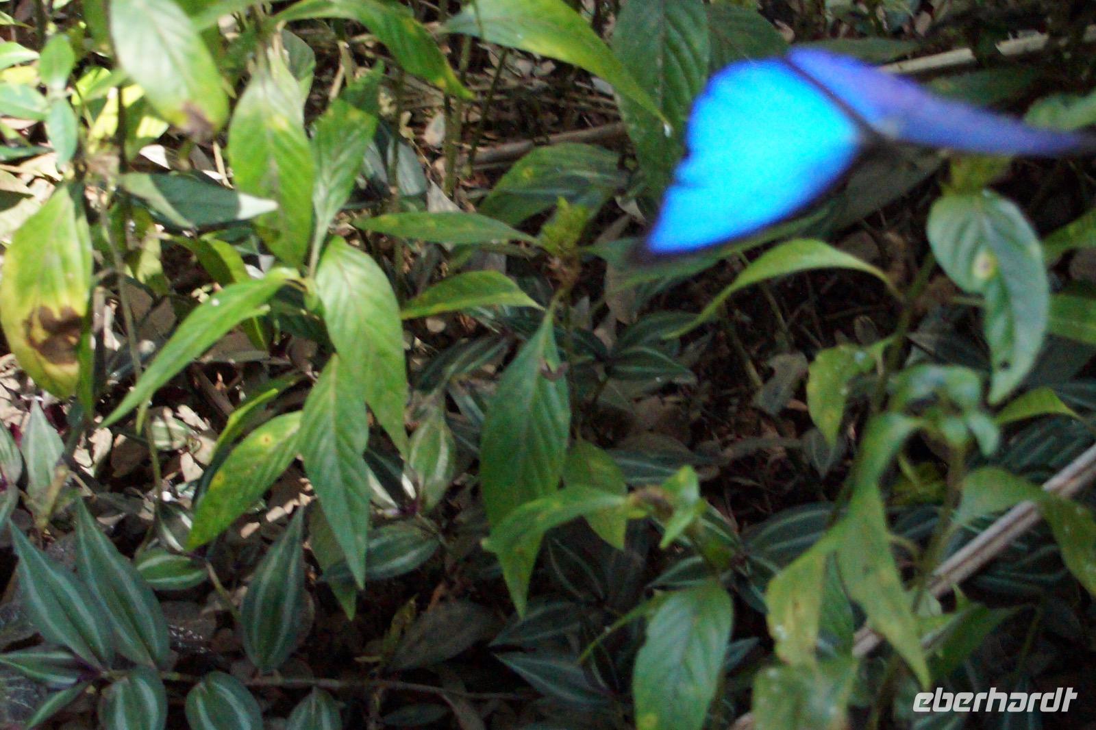 Wir kehren zurück nach Machu Picchu, von den anderen sehen wir nichts mehr. Unser nächstes Ziel ist die Inkabrücke. Ein schmaler Weg führt entlang des Steilhanges des eigentlichen Machu Picchu-Berges dorthin. Machu Picchu liegt eigentlich auf einen Bergrücken zwischen den Gipfeln Machu Picchu und Wayna (oder Huayna) Picchu und auf den meisten Fotos, die man von Machu Picchu kennt, v.a. auf den emblematischen Fotos, liegt der namensgebende Berg im Rücken des Betrachters, wohingegen der Gipfel des Huayna Picchu - sofern nicht vernebelt oder wolkenverhangen - auf allen Fotos zu sehen ist. Wir sind jetzt also auf dem schmalen Steig am Rande des Steilhangs, der zur Inka-Brücke führt. Hin und wieder beobachten wir Vögel oder auch Schmetterlinge, besonders einer, der seine Fressfeinde verwirrt, indem er je nach Flügelschlag blau oder gelb aussieht, fasziniert uns. Aber er ist zu schnell oder weit weg, um ihn auf das Fotopapier zu bannen. Eine Einheimische raunt mir zu, das sei der Machu Picchu-Morpho. Bei der Internetrecherche später finde ich viele Schmetterlinge der Gattung Morpho, diesen speziellen aber nicht.