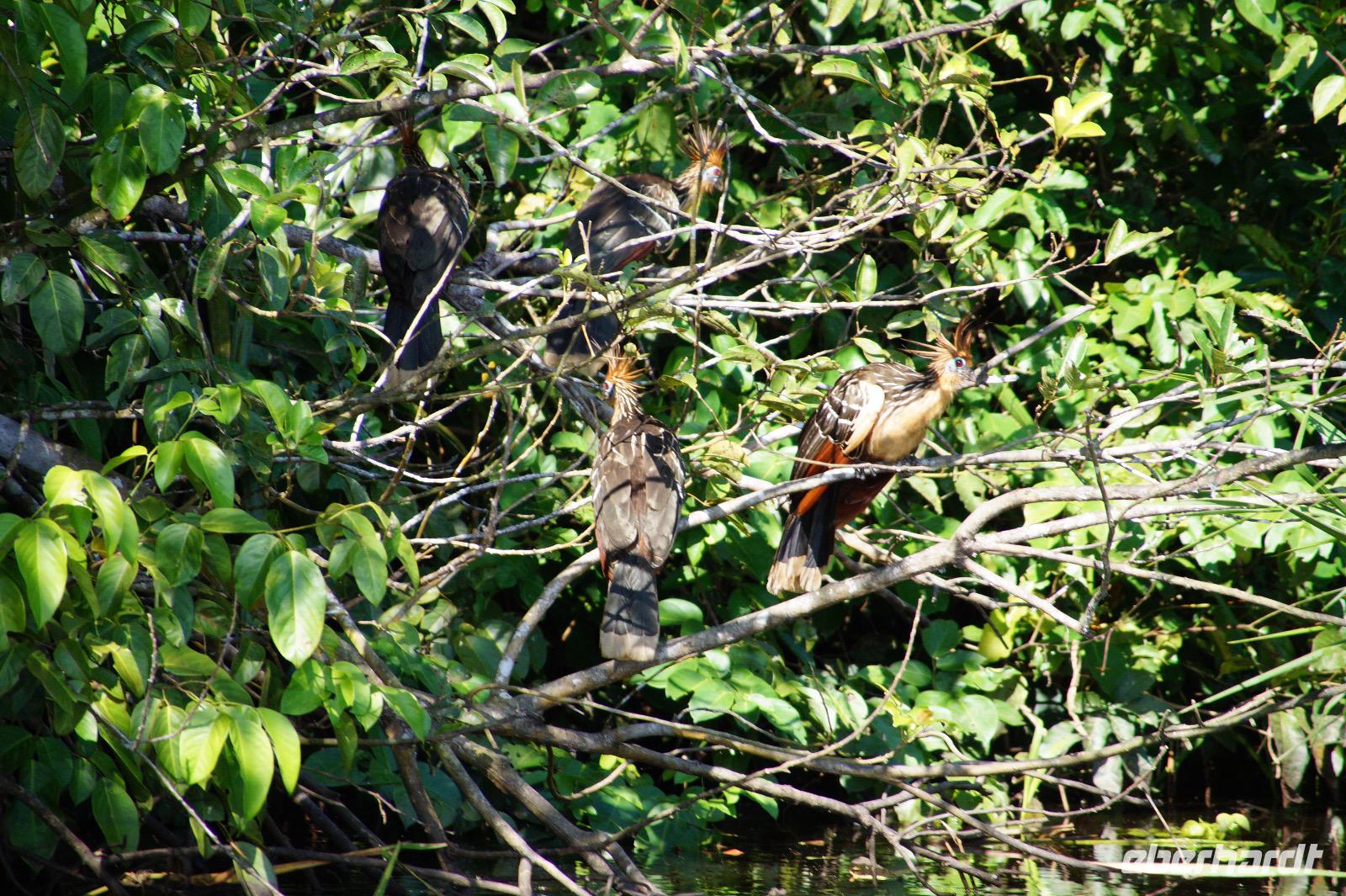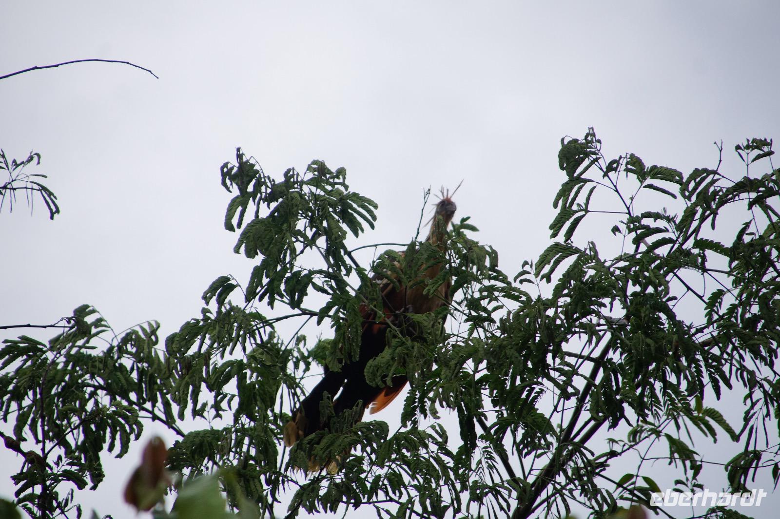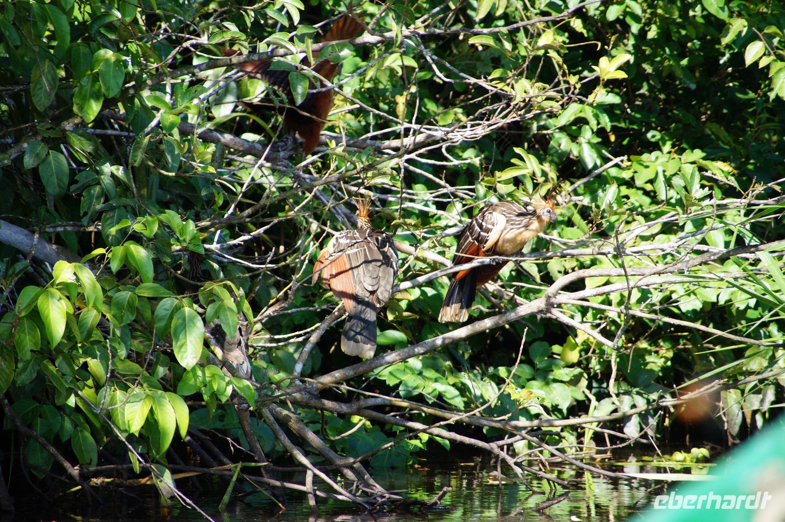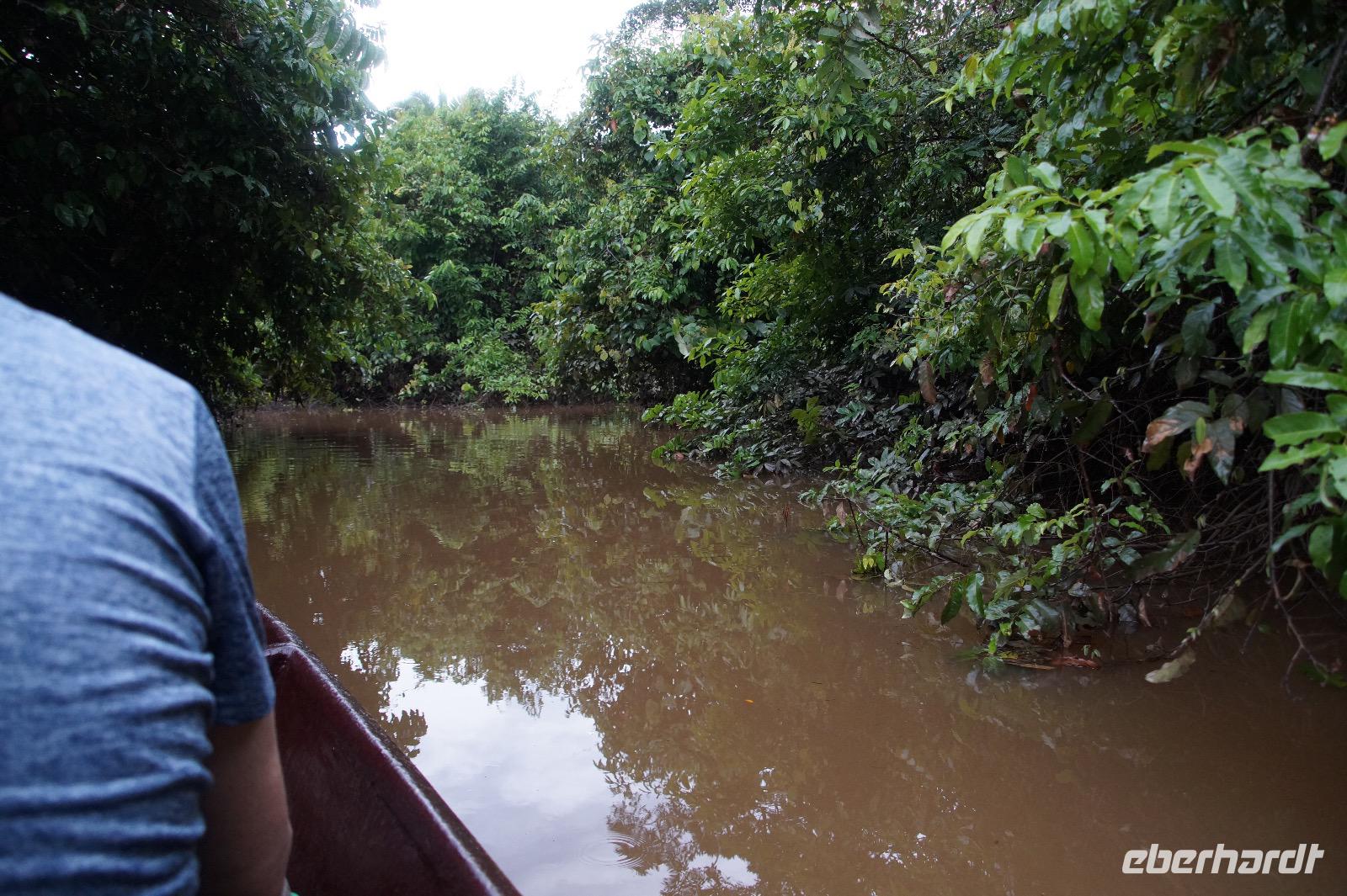 Irgendwann kommen wir im am Sandoval-See an. Mirko schöpft ein Boot aus, während wir unsere Stiefel vom Schlamm befreien. Vom See ist zunächst nicht viel zu sehen, wir fahren mit einem Boot durch den Wald. Wir sehen die Augen eines schwarzen Kaimans und ein weiteres Kapuzineräffchen. Mehr oder weniger plötzlich öffnet sich der Wald und wir befahren den offenen See. Einige Vögel und Schmetterlinge zeigen sich, der Königsfischer, der grüne Ibis und der Hoatzin, letzterer ein Vogel, der keine Fressfeinde hat, weil er so stinkt (wir allerdings haben seinen Geruch nicht wahrnehmen müssen).
