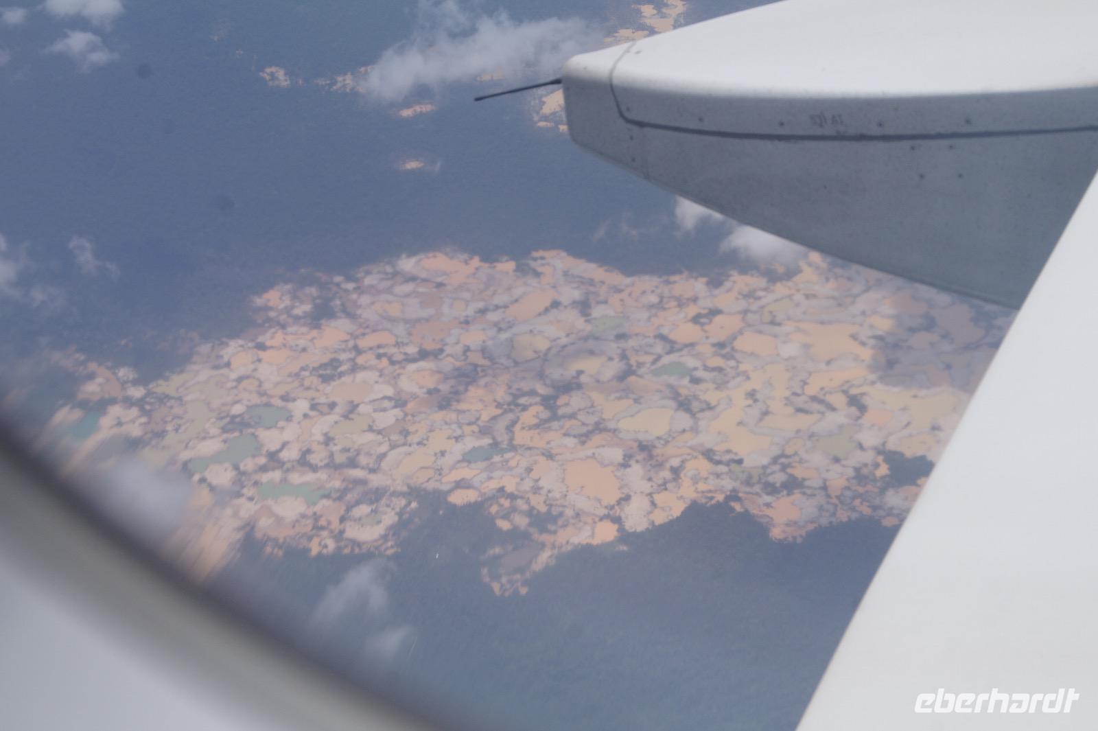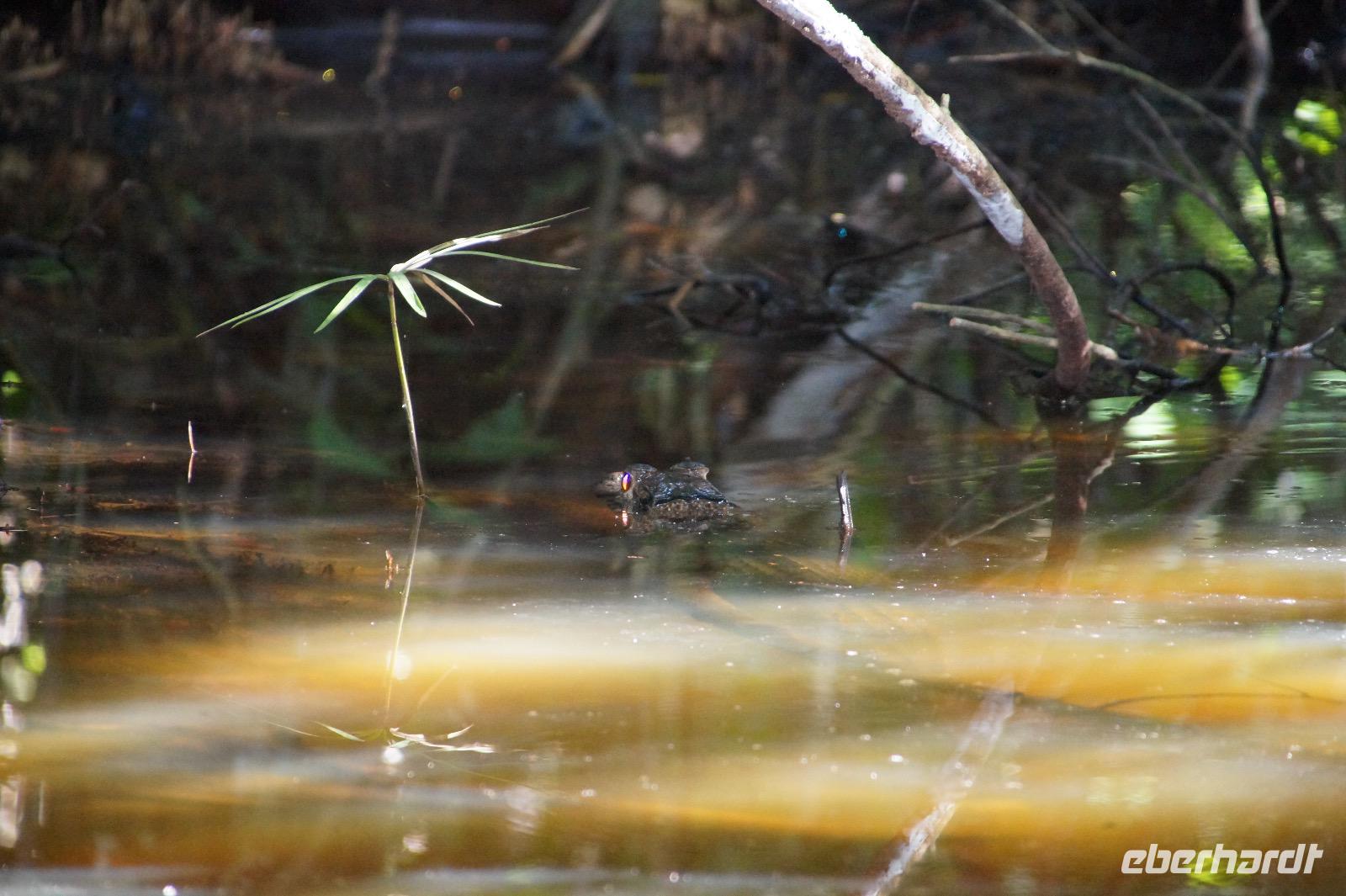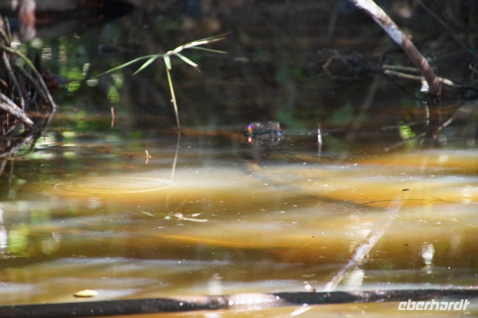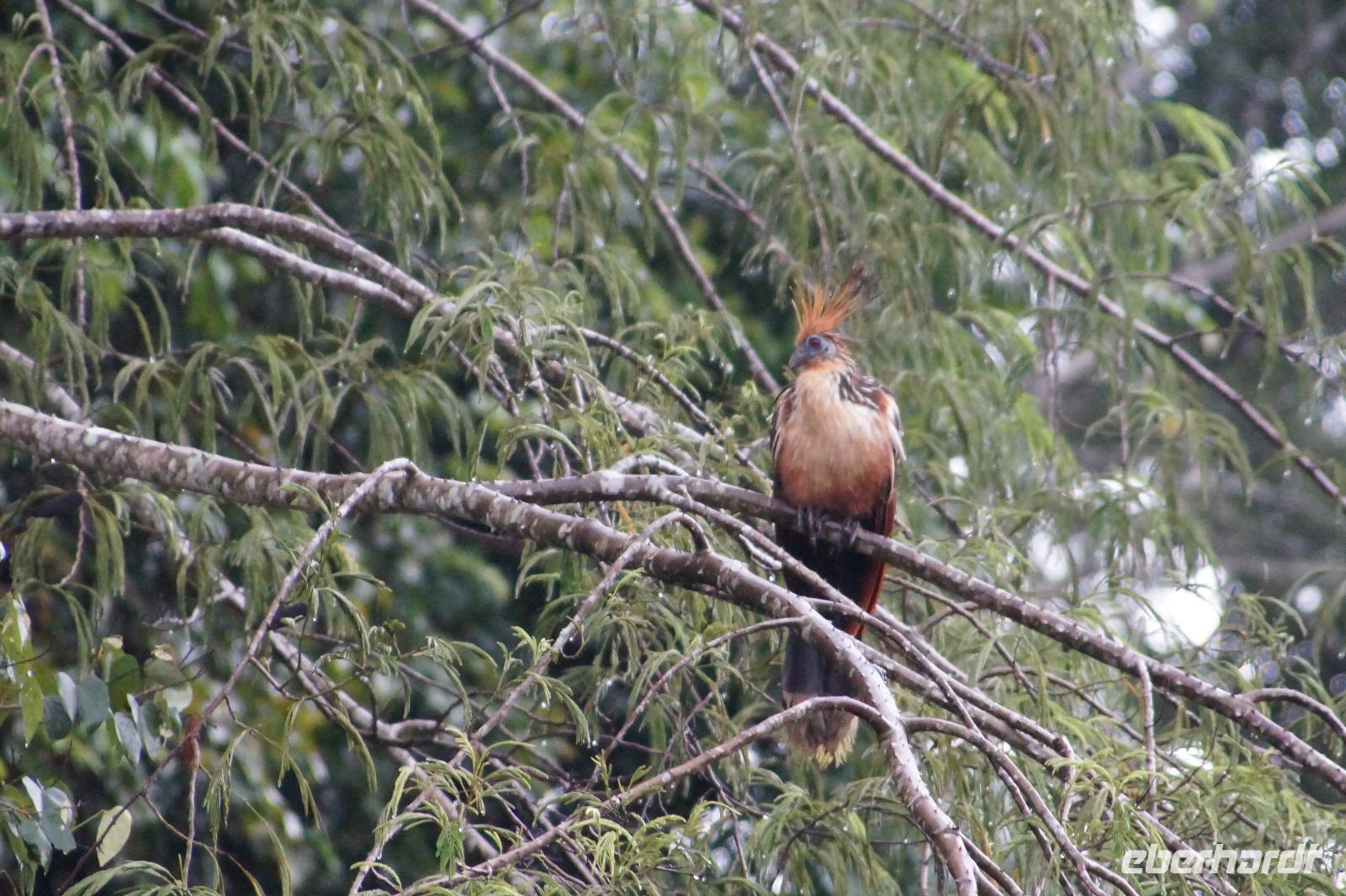 Irgendwann kommen wir im am Sandoval-See an. Mirko schöpft ein Boot aus, während wir unsere Stiefel vom Schlamm befreien. Vom See ist zunächst nicht viel zu sehen, wir fahren mit einem Boot durch den Wald. Wir sehen die Augen eines schwarzen Kaimans und ein weiteres Kapuzineräffchen. Mehr oder weniger plötzlich öffnet sich der Wald und wir befahren den offenen See. Einige Vögel und Schmetterlinge zeigen sich, der Königsfischer, der grüne Ibis und der Hoatzin, letzterer ein Vogel, der keine Fressfeinde hat, weil er so stinkt (wir allerdings haben seinen Geruch nicht wahrnehmen müssen).