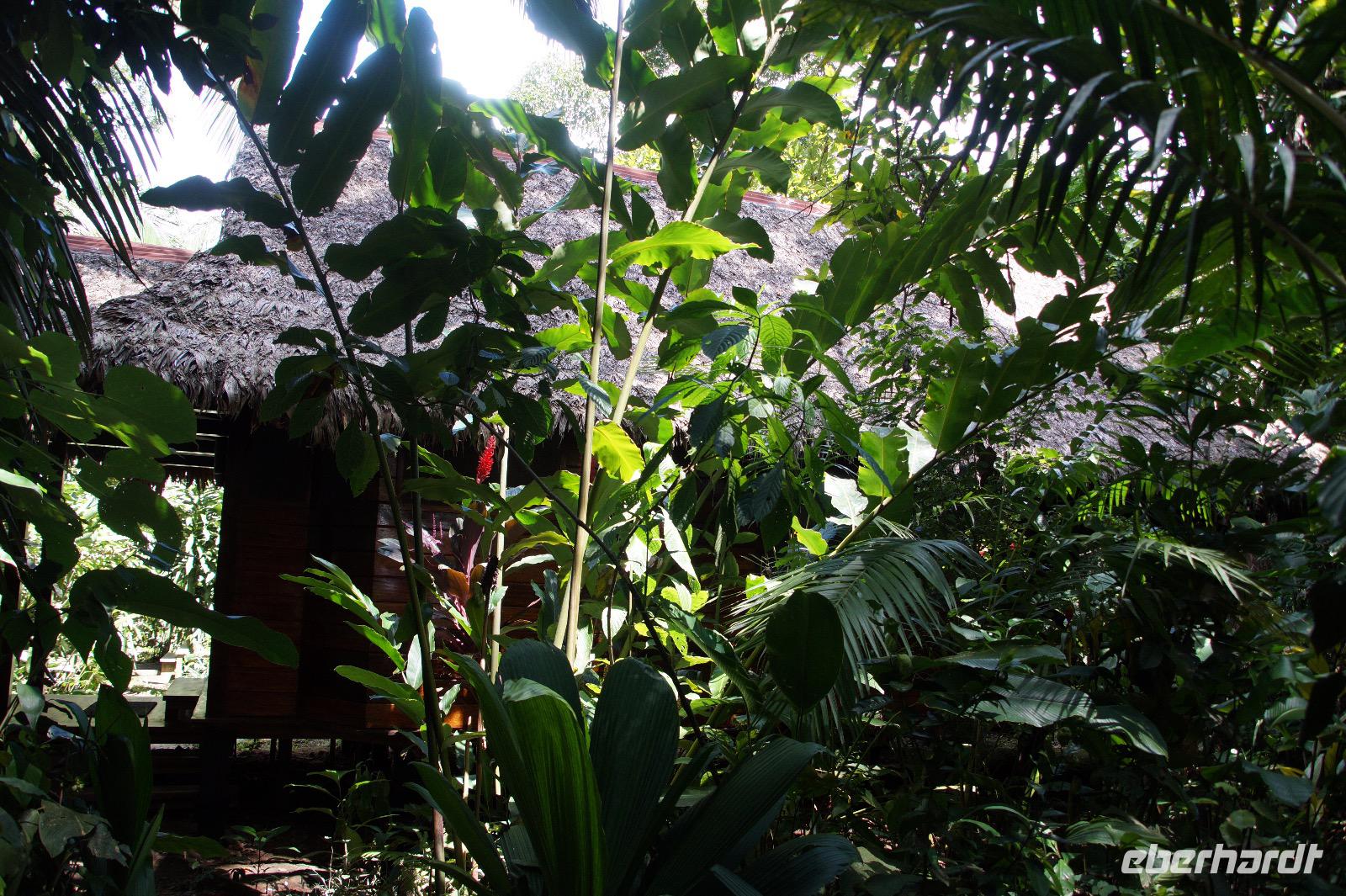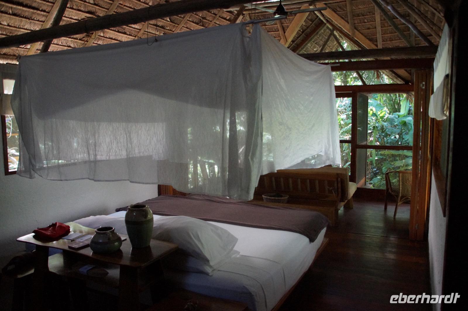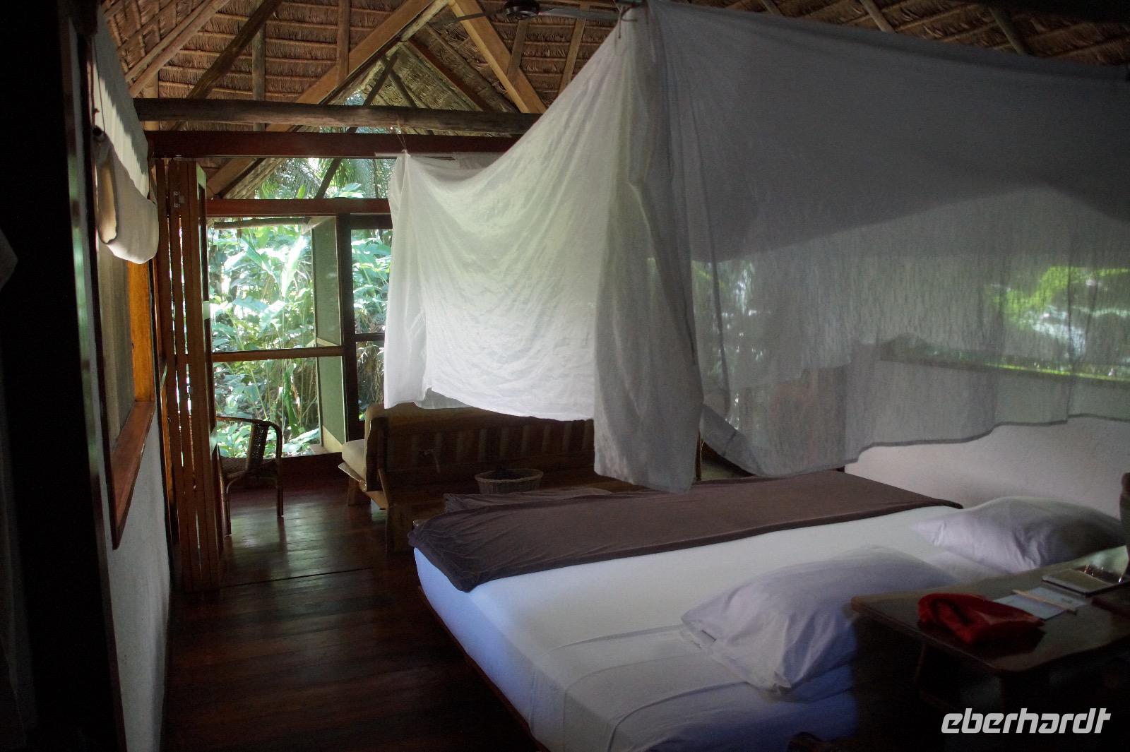Unsere palmwedelgedeckten Hütten haben nach hinten raus offene Wände und keine Fenster, nur Fliegengitter: wir schlafen im Wald und müssen dennoch auf keinen Luxus verzichten.
