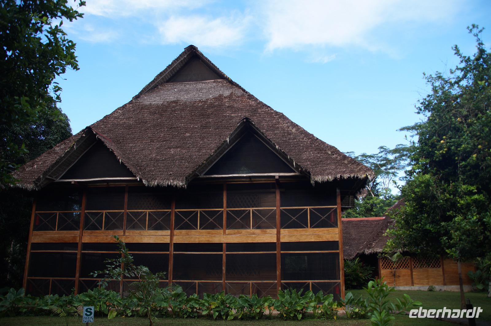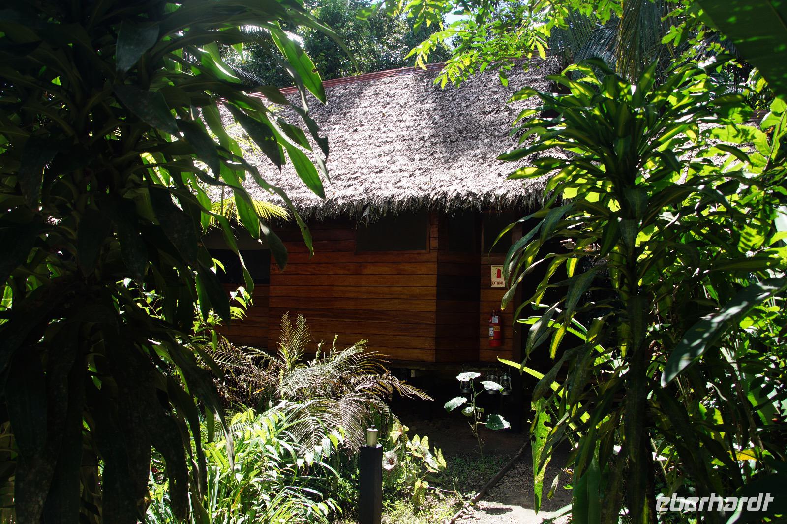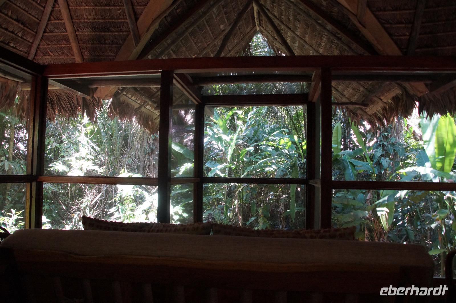 Unsere palmwedelgedeckten Hütten haben nach hinten raus offene Wände und keine Fenster, nur Fliegengitter: wir schlafen im Wald und müssen dennoch auf keinen Luxus verzichten.