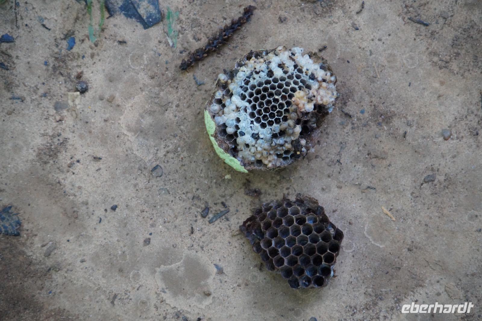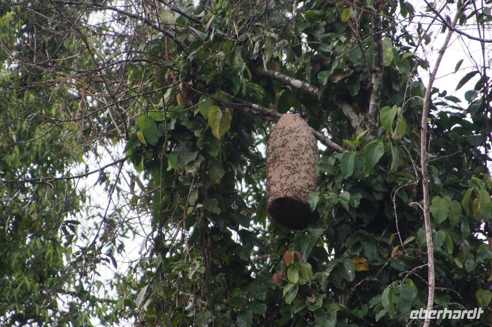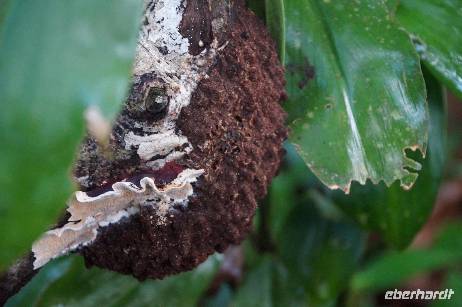 Als nächstes halten wir an einem Baumtermitennest. Sollten wir mal im Wald verloren gehen, sollten wir uns von den proteinreichen Termiten ernähren, das würde unser Leben sichern. Termiten schmeckten wie Minze meint Mirko. Nur zwei von uns trauen sich, die kaum zwei Millimeter großen Tierchen zu probieren, wir beide finden, dass sie eher nach Pfeffer schmecken. „Heißt ja auch Pfefferminz", witzelt jemand. Ich probiere zur Sicherheit noch eine zweite Termite.