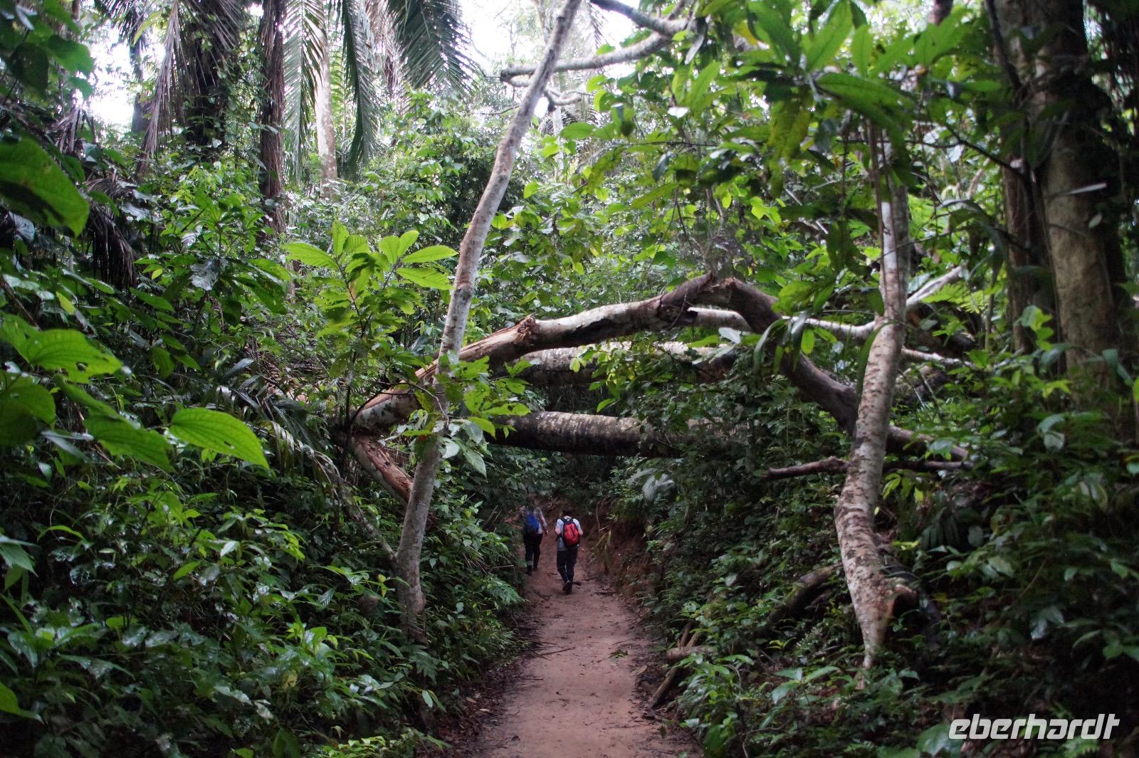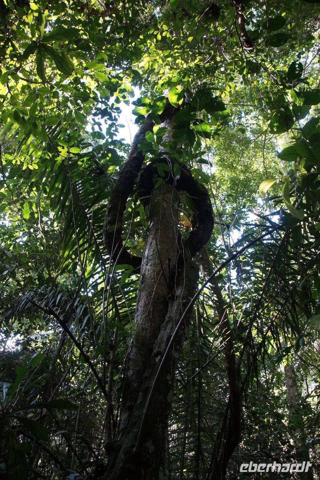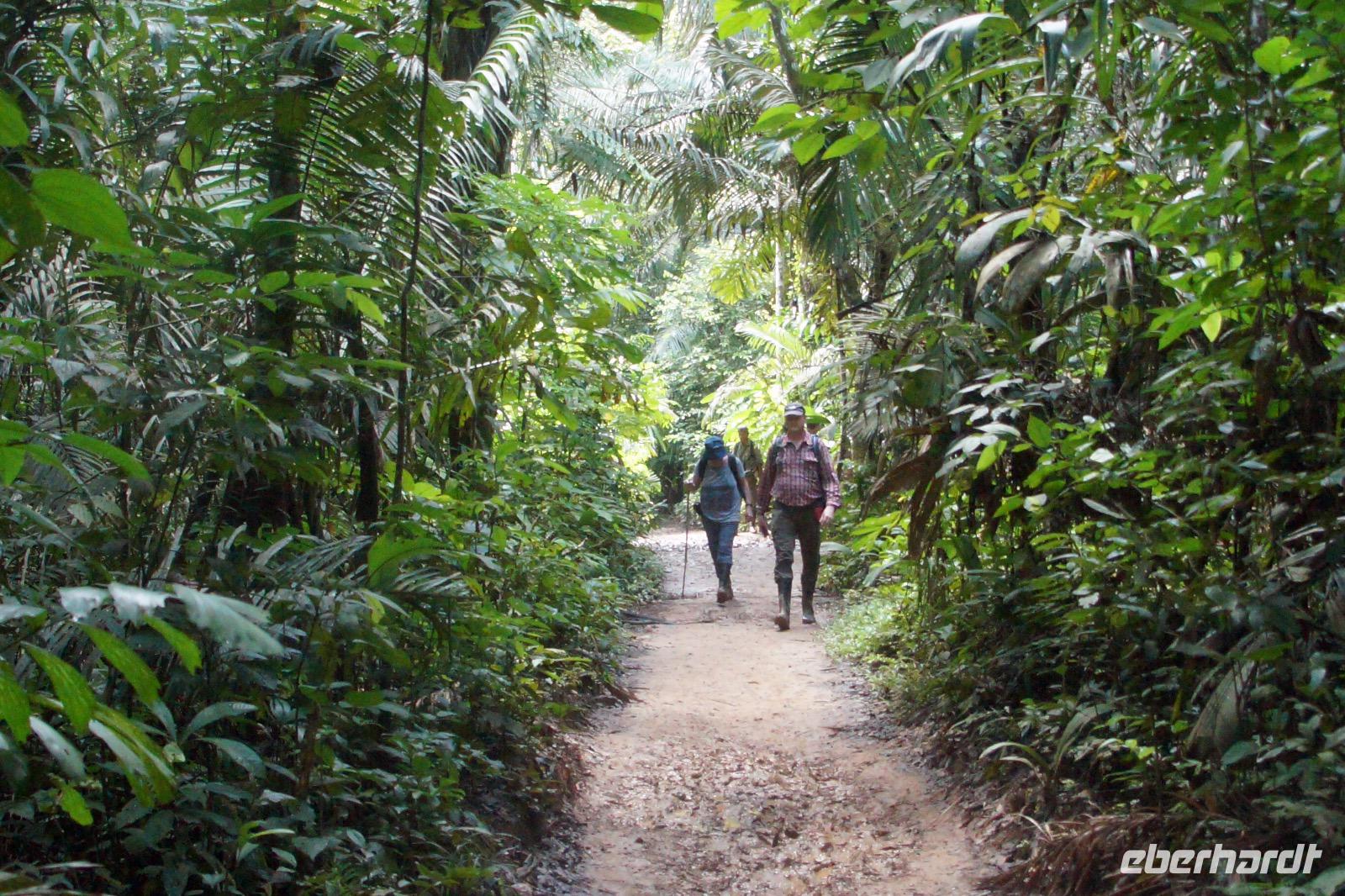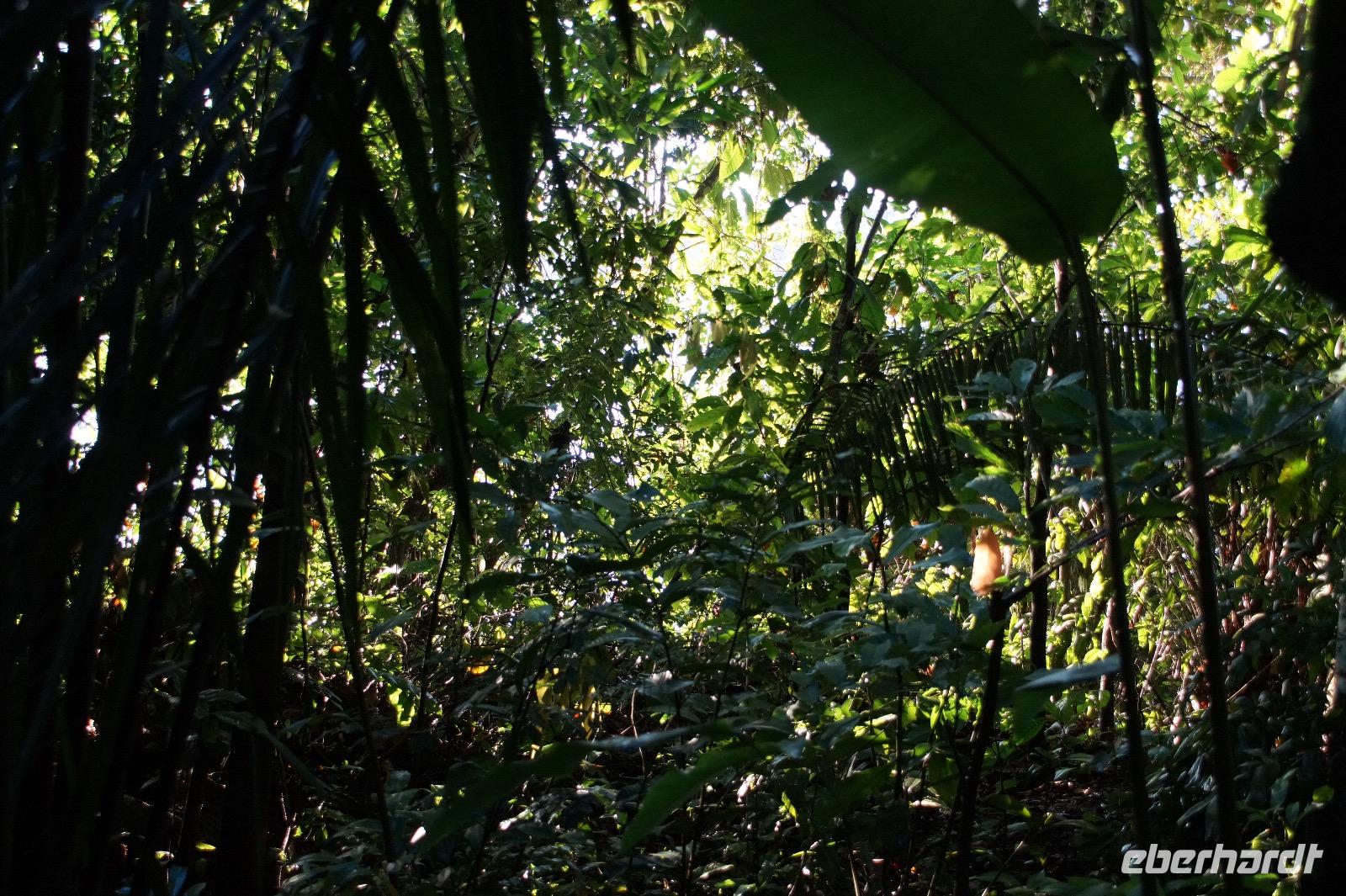 Wir befinden uns auf einer ehemaligen Kakaoplantage, die seit den 1960er Jahren verwildert ist. Die Kakaobäume, die sonst kurz gehalten werden, haben sich zu Urwaldriesen entwickelt, die Pflanzen des Urwaldes wachsen dazwischen. Wir lernen hier z.B. den laufenden Baum kennen. Der laufende Baum ist eine Palmenart, die sich im Jahr bis zu zwei Metern fortbewegen kann, immer auf der Suche nach der besten Position, um im Licht zu stehen. Dazu wirft der laufende Baum, dessen Stamm nicht den Erdboden erreicht, sondern der auf seinen Wurzel steht, wie auf Beinen, eine Wurzel ab und lässt auf der der anderen Seite eine neue wachsen.