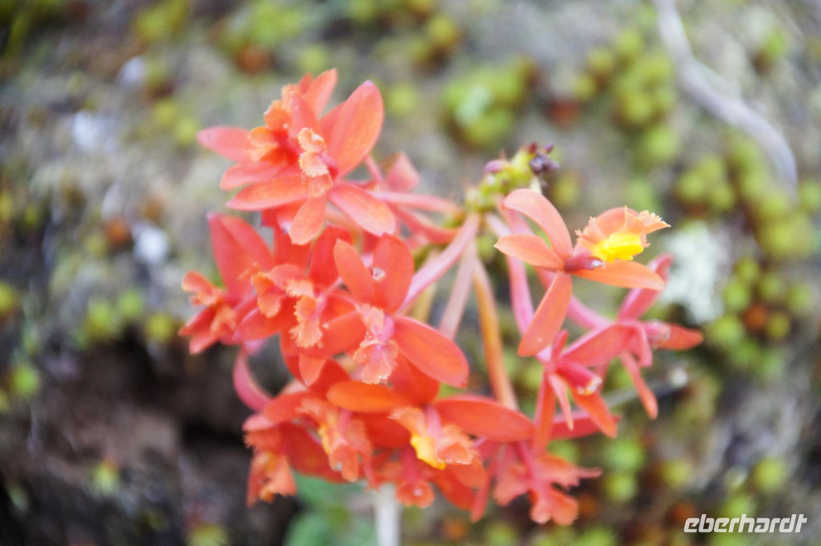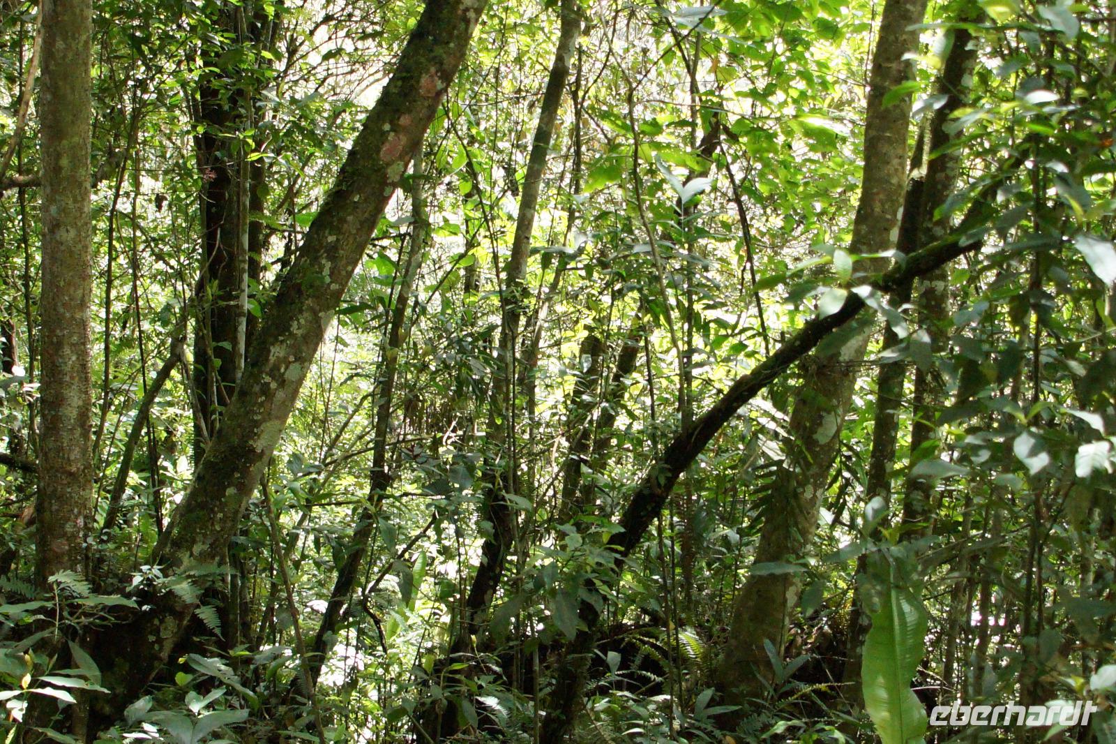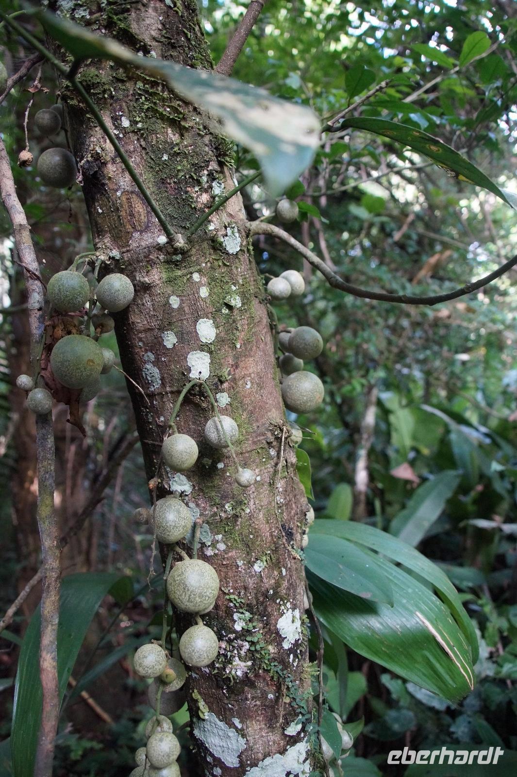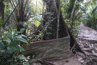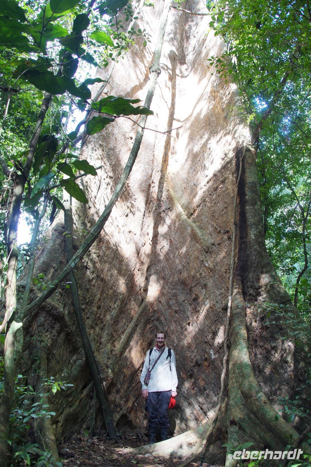 Wir befinden uns auf einer ehemaligen Kakaoplantage, die seit den 1960er Jahren verwildert ist. Die Kakaobäume, die sonst kurz gehalten werden, haben sich zu Urwaldriesen entwickelt, die Pflanzen des Urwaldes wachsen dazwischen. Wir lernen hier z.B. den laufenden Baum kennen. Der laufende Baum ist eine Palmenart, die sich im Jahr bis zu zwei Metern fortbewegen kann, immer auf der Suche nach der besten Position, um im Licht zu stehen. Dazu wirft der laufende Baum, dessen Stamm nicht den Erdboden erreicht, sondern der auf seinen Wurzel steht, wie auf Beinen, eine Wurzel ab und lässt auf der der anderen Seite eine neue wachsen.