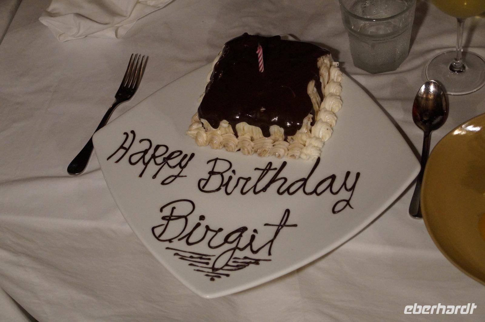 Zuhause angekommen, gibt es, etwas später als geplant, Abendessen, Birgit bekommt vom Hotel einen Geburtstagskuchen gestiftet. Den essen wir aber erst am nächsten Tag, denn das Dreigängemenü war reichhaltig.