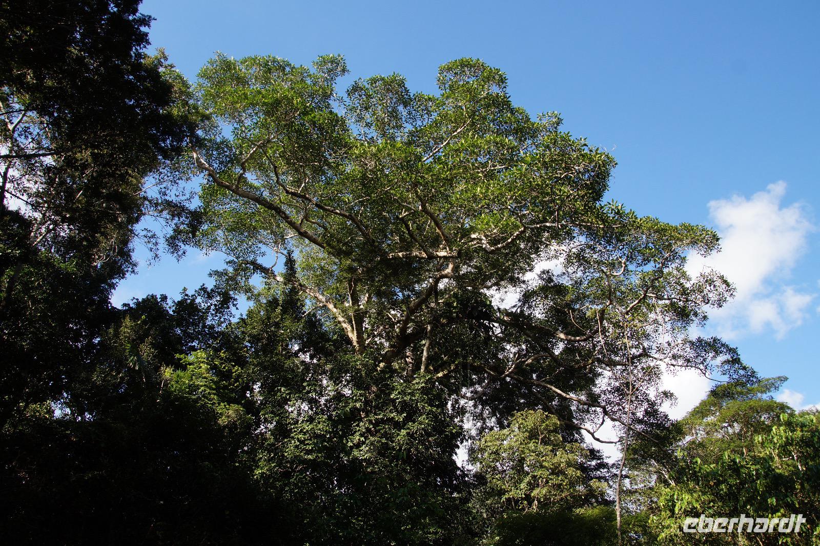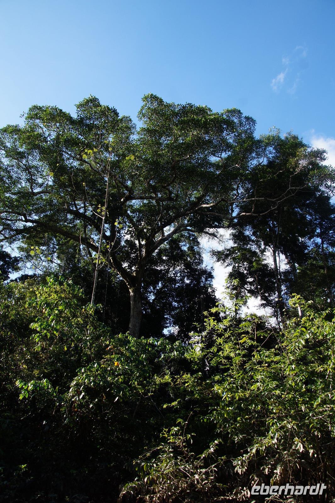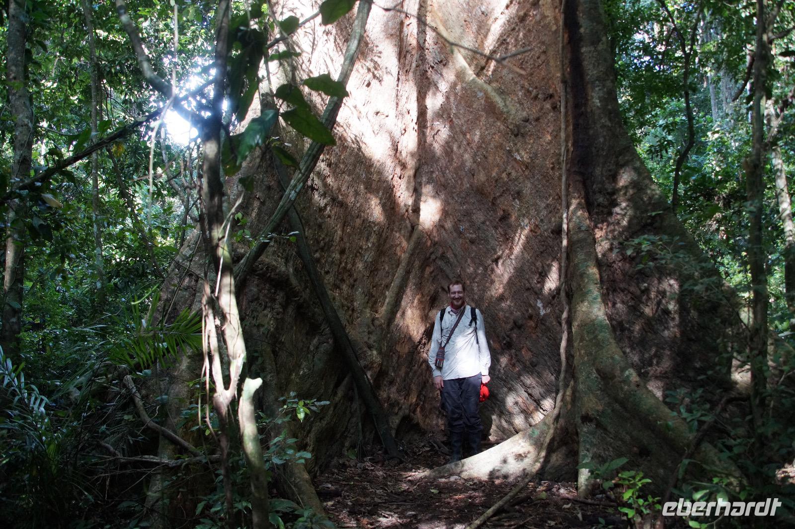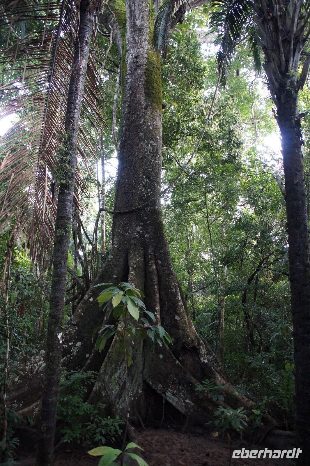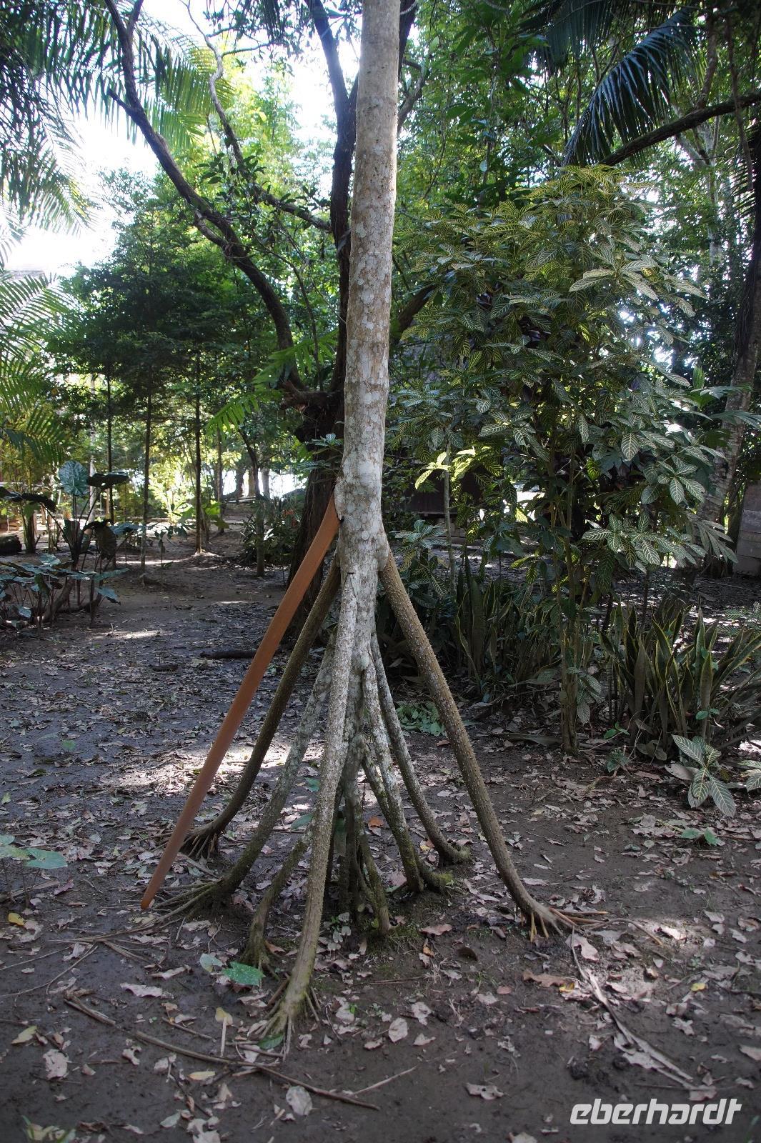Der nächste Baum, den uns Mirko zeigt, lebt symbiotisch mit Feuerameisen. Er wächst innen hohl und bietet somit den Ameisen Laufwege und Lebensraum. Die Ameisen verteidigen ihn dafür vor Fressfeinden und Konkurrenten aus der Pflanzenwelt. Mirko sagt, diese Bäume seien immer sauber, weil die Ameisen nicht zuließen, dass andere Pflanzen sie als Rankhilfe gebräuchten. Der Ranger warnt auch vor den Ameisen, sie trügen ihren Namen nicht zufällig.
