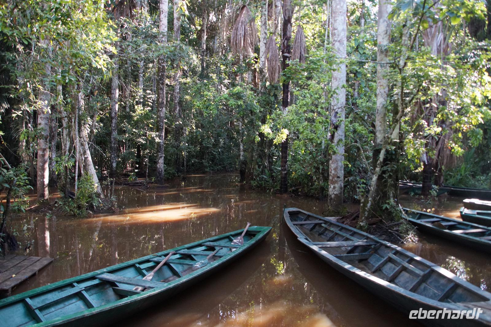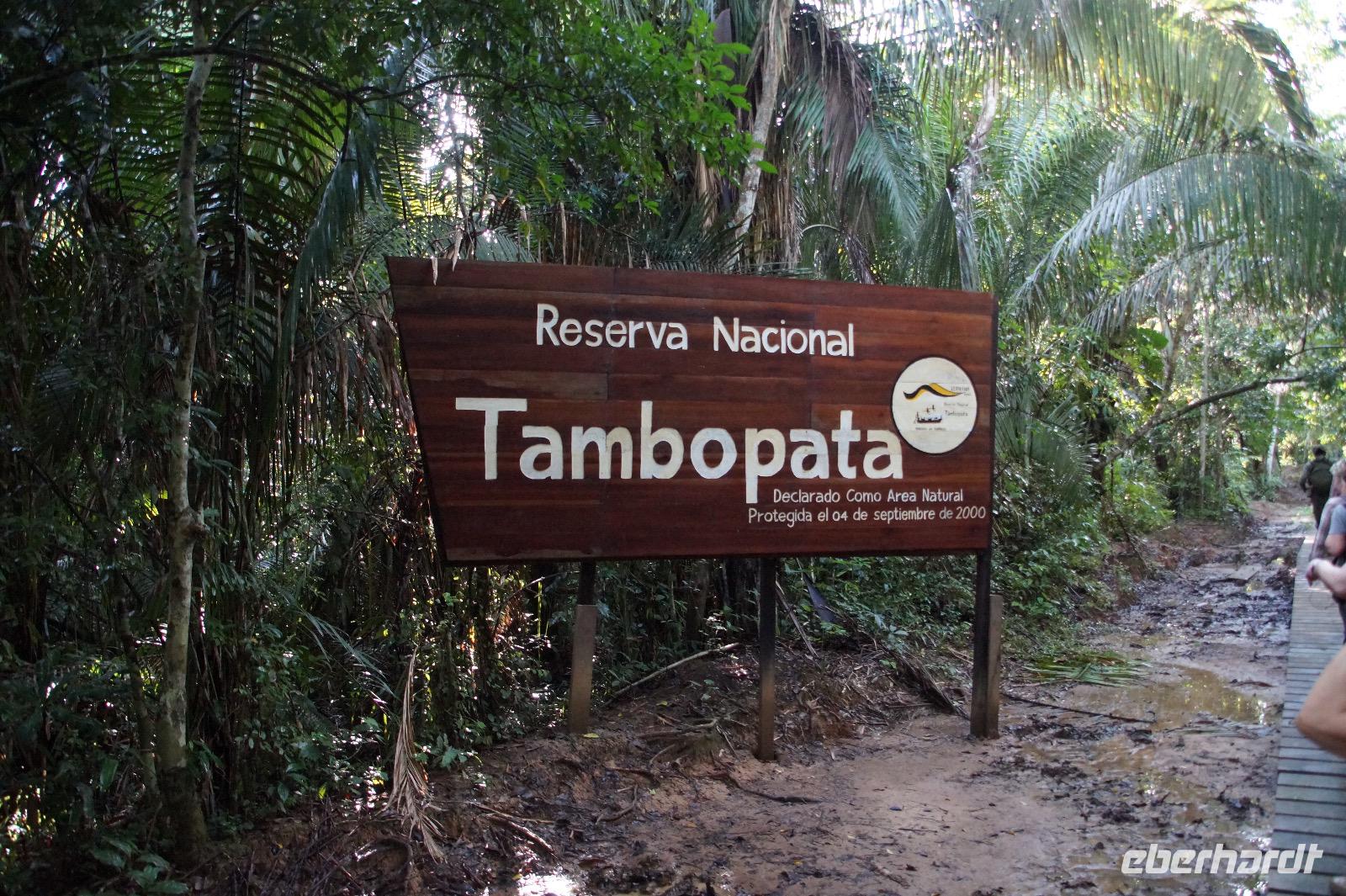 Mit dem Boot geht es flussabwärts zur Tambopata Reserva Nacional (nationales Schutzgebiet). Hier marschieren wir einen drei km langen Weg entlang, der mal durch den Schlamm geht, mal über hölzerne Stege. Hier offenbart sich, warum Wanderschuhe unzureichend sind und wir Gummistiefel benötigen. Trotzdem ist die ein oder andere Hose am Ende des Tages voller Lehm.
