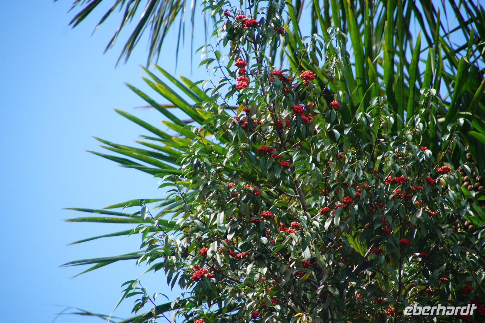 Der erste Baum, den wir kennenlernen, ist eine Palme mit Stacheln, vor der sollen wir uns in Acht nehmen, sie ist zwar ungefährlich, aber die Stacheln brechen ab und bleiben in der Haut stecken. Einer von uns macht dann später auch noch Bekanntschaft mit den Stacheln.