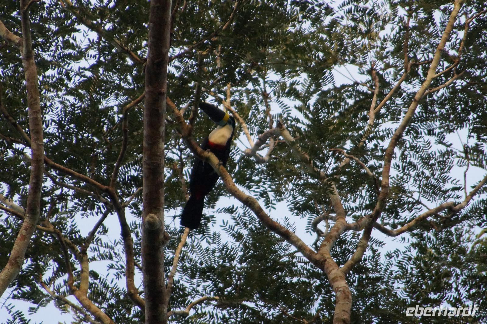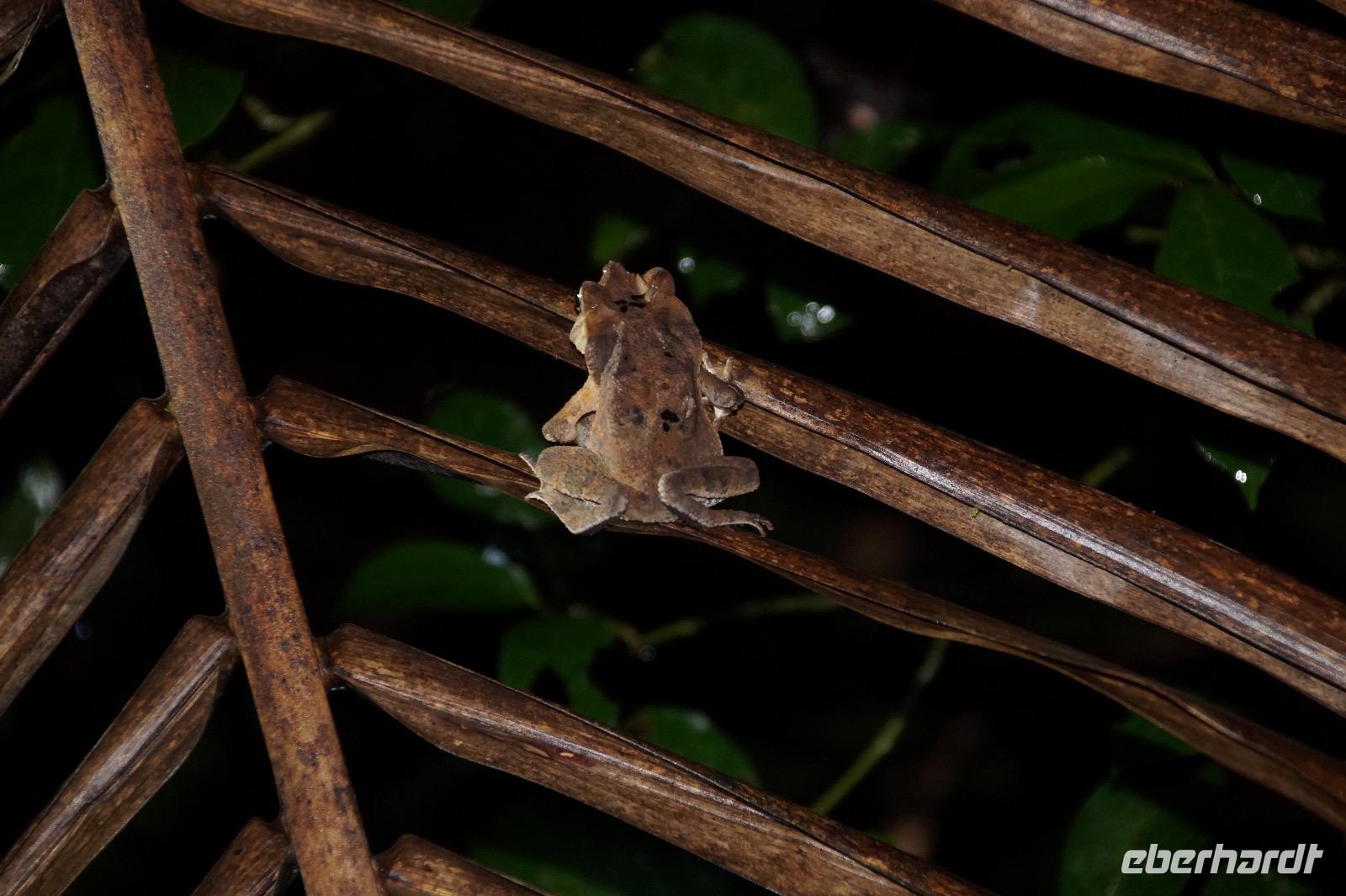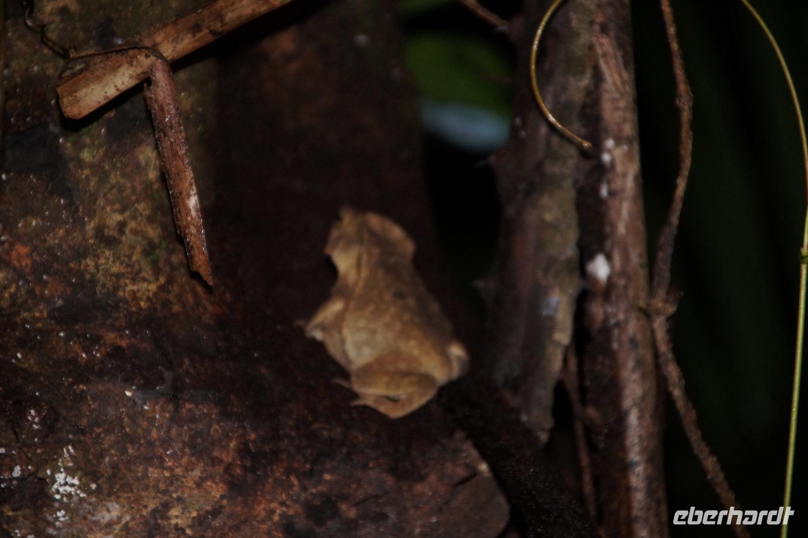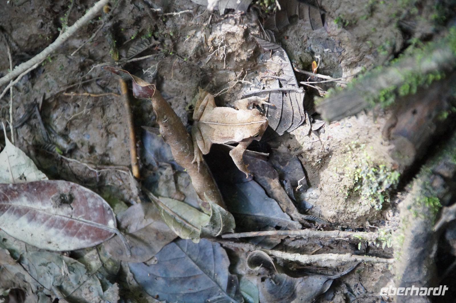 Am Nachmittag fahren wir zur Chacra Gambitas. Das ist eine Versorgungseinheit vom Inkaterra selbst, hier wird Obst für die Küche der drei Regenwaldhotels, die Inkaterra in der Region betreibt, angebaut. Wir halten uns allerdings nicht lange auf und stoßen in den Wald vor, begegnen dabei u.a. einer interessanten Spinne, die sich aber leider in ihrem Netz nicht fotografieren lässt (manueller Fokus hätte es vielleicht getan). Auch die Spur des dreifingrigen Tapir finden wir. Wir kommen nun endlich an der Quebrada an, Mirko ist schon am Boot, da hüpft vor mir plötzlich ein Blatt weg. Wir haben schon den ein oder anderen Frosch im Regenwald gesehen, aber bisher hatte keiner so ein geschicktes Mimikry. Mirko rudert uns nun mit dem Boot durch die Quebrada, dabei handelt es sich mitnichten um einen tektonischen Bruch, im peruanischen Spanisch bedeutet das einfach Bach. Der Bach hat aufgrund dessen, dass es Regenzeit ist, derzeit Flussbreite und wird durch den Wasserstand des Madre de Dios zurückgestaut, die Fließgeschwindigkeit ist sehr gering. Im Winter, zur Trockenzeit, ist er niedriger und schmaler, seine Fließgeschwindigkeit höher. Zurück an der Chacra wechseln wir vom Ruderboot ins Motorboot und es geht zurück ins Hotel. Keiner von uns bleibt unten am Fluss, um die halbe Stunde bis zum Sonnenuntergang abzuwarten.Zum Glück, denn auf dem Weg zu meiner Cabaña höre ich einen Vogelruf, den Mirko mir gestern als Tucán identifiziert hatte. Er ist nah, direkt über mit. Und tatsächlich gelingt es mir, den Vögel zu finden und abzuschießen. Mit der Kamera natürlich. Um 18:00 treffen wir uns bereits wieder, um eine Colpa, eine Lehmlecke zu besuchen. Es ist mittlerweile stockfinster (wie bereits gesagt: So ist das eben nur 13° südlich des Äquators). Wir stolpern also wieder, mit Taschenlampen bewaffnet, durch den nächtlichen Wald. An der Lehmlecke hat Inkaterra eine Beobachtungshütte aufgebaut, aber wir haben kein Glück, wir hören zwar hin und wieder etwas, aber kein Tier zeigt sich an der Lehmlecke. Mirko zeigt uns einen kurzen Handyfilm von einer anderen Colpa, tiefer im Wald, mit Kamerafallen aufgenommen, diese zeigen einen regen Verkehr. Auf dem Rückweg haben wir mehr Glück. Wir begegnen einem Opossum, sehen mehrere Frösche und treffen auf einen Skorpion. Der Ranger zeigt, dass der Skorpion im Schein einer Schwarzlichtlampe neongelb leuchtet. Zurück im Hotel nehmen wir unser letztes Abendessen hier ein.