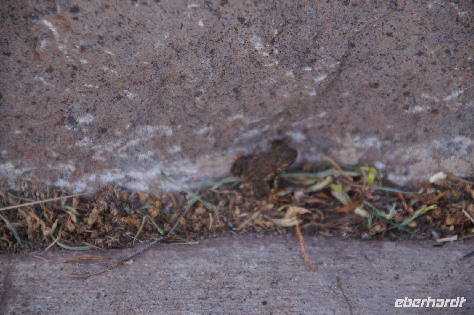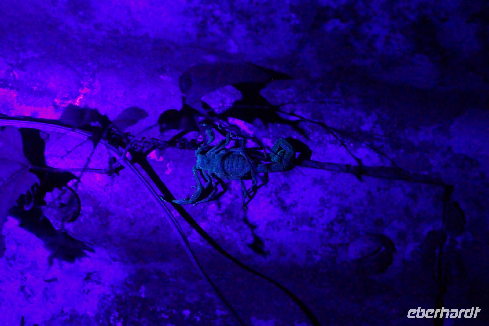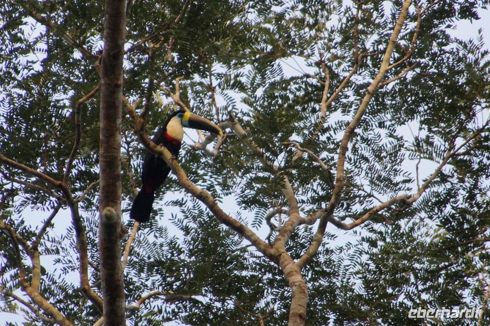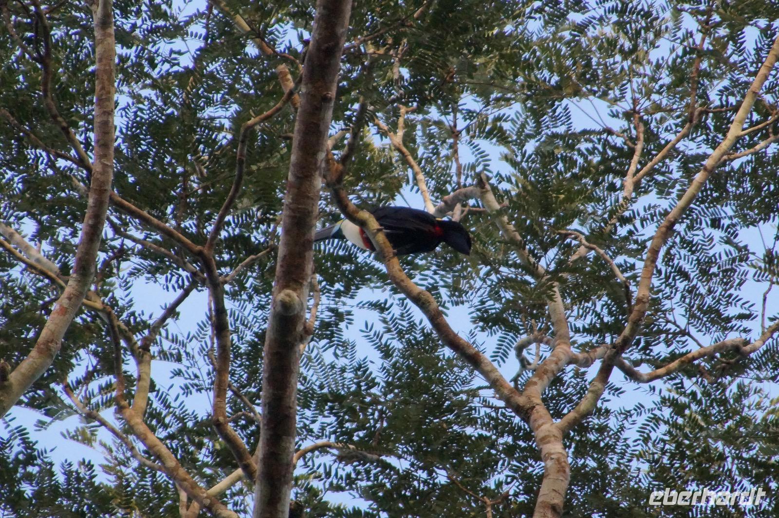Am Nachmittag fahren wir zur Chacra Gambitas. Das ist eine Versorgungseinheit vom Inkaterra selbst, hier wird Obst für die Küche der drei Regenwaldhotels, die Inkaterra in der Region betreibt, angebaut. Wir halten uns allerdings nicht lange auf und stoßen in den Wald vor, begegnen dabei u.a. einer interessanten Spinne, die sich aber leider in ihrem Netz nicht fotografieren lässt (manueller Fokus hätte es vielleicht getan). Auch die Spur des dreifingrigen Tapir finden wir. Wir kommen nun endlich an der Quebrada an, Mirko ist schon am Boot, da hüpft vor mir plötzlich ein Blatt weg. Wir haben schon den ein oder anderen Frosch im Regenwald gesehen, aber bisher hatte keiner so ein geschicktes Mimikry. Mirko rudert uns nun mit dem Boot durch die Quebrada, dabei handelt es sich mitnichten um einen tektonischen Bruch, im peruanischen Spanisch bedeutet das einfach Bach. Der Bach hat aufgrund dessen, dass es Regenzeit ist, derzeit Flussbreite und wird durch den Wasserstand des Madre de Dios zurückgestaut, die Fließgeschwindigkeit ist sehr gering. Im Winter, zur Trockenzeit, ist er niedriger und schmaler, seine Fließgeschwindigkeit höher. Zurück an der Chacra wechseln wir vom Ruderboot ins Motorboot und es geht zurück ins Hotel. Keiner von uns bleibt unten am Fluss, um die halbe Stunde bis zum Sonnenuntergang abzuwarten.Zum Glück, denn auf dem Weg zu meiner Cabaña höre ich einen Vogelruf, den Mirko mir gestern als Tucán identifiziert hatte. Er ist nah, direkt über mit. Und tatsächlich gelingt es mir, den Vögel zu finden und abzuschießen. Mit der Kamera natürlich. Um 18:00 treffen wir uns bereits wieder, um eine Colpa, eine Lehmlecke zu besuchen. Es ist mittlerweile stockfinster (wie bereits gesagt: So ist das eben nur 13° südlich des Äquators). Wir stolpern also wieder, mit Taschenlampen bewaffnet, durch den nächtlichen Wald. An der Lehmlecke hat Inkaterra eine Beobachtungshütte aufgebaut, aber wir haben kein Glück, wir hören zwar hin und wieder etwas, aber kein Tier zeigt sich an der Lehmlecke. Mirko zeigt uns einen kurzen Handyfilm von einer anderen Colpa, tiefer im Wald, mit Kamerafallen aufgenommen, diese zeigen einen regen Verkehr. Auf dem Rückweg haben wir mehr Glück. Wir begegnen einem Opossum, sehen mehrere Frösche und treffen auf einen Skorpion. Der Ranger zeigt, dass der Skorpion im Schein einer Schwarzlichtlampe neongelb leuchtet. Zurück im Hotel nehmen wir unser letztes Abendessen hier ein.