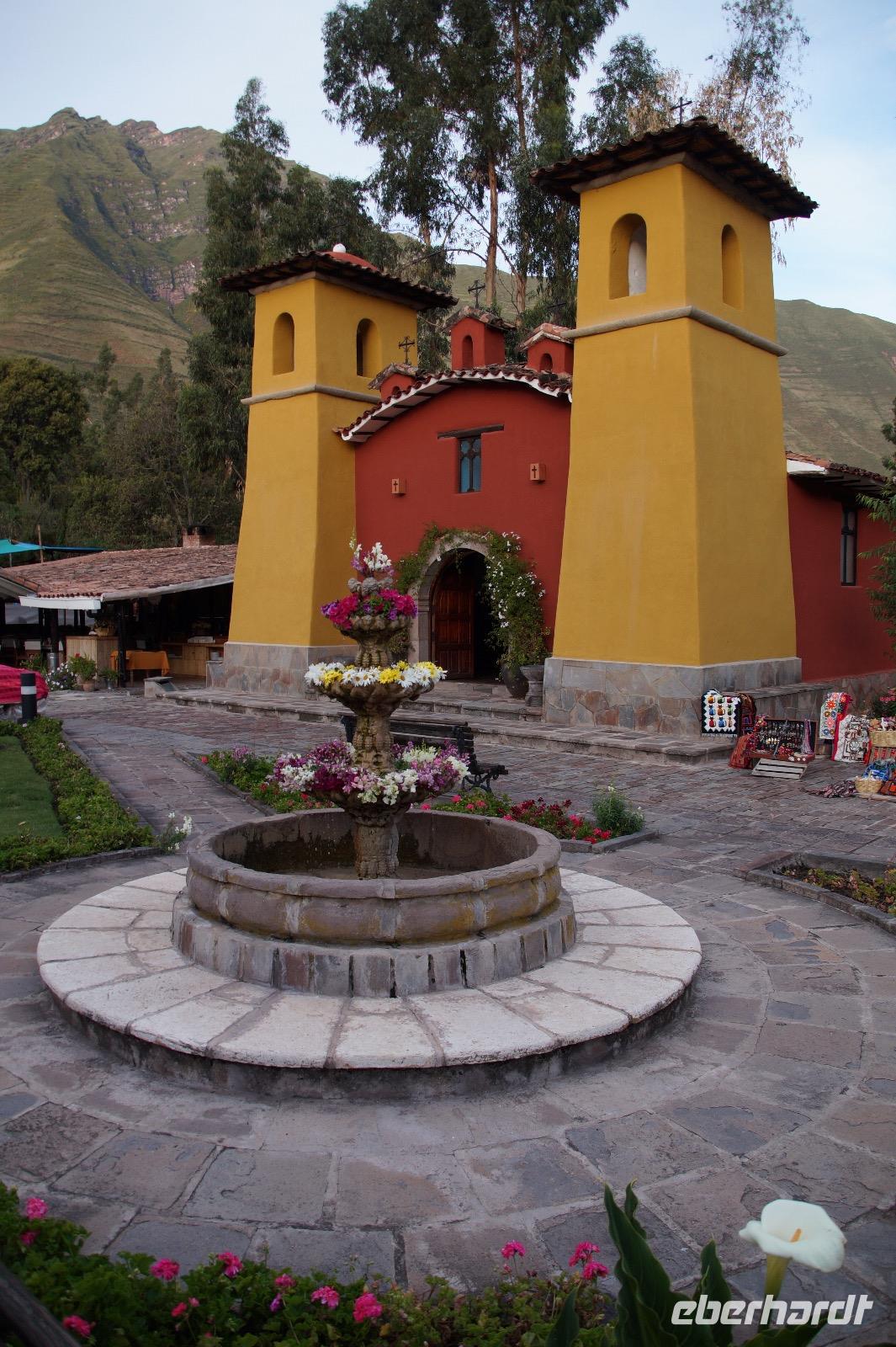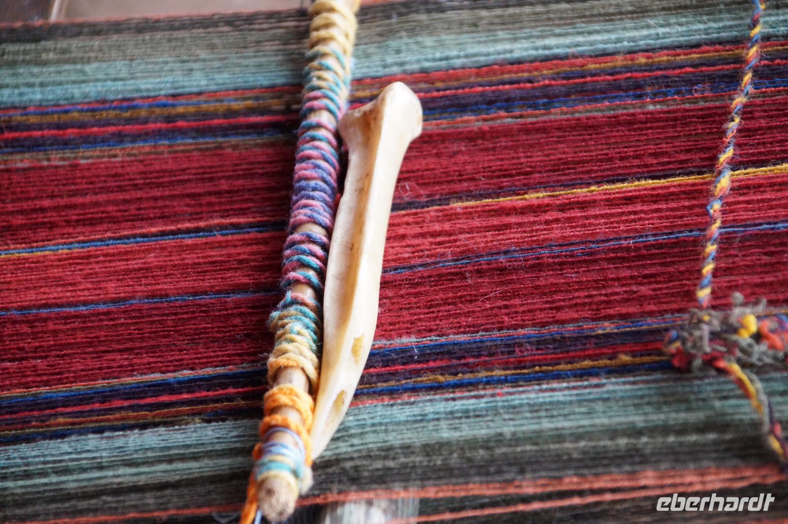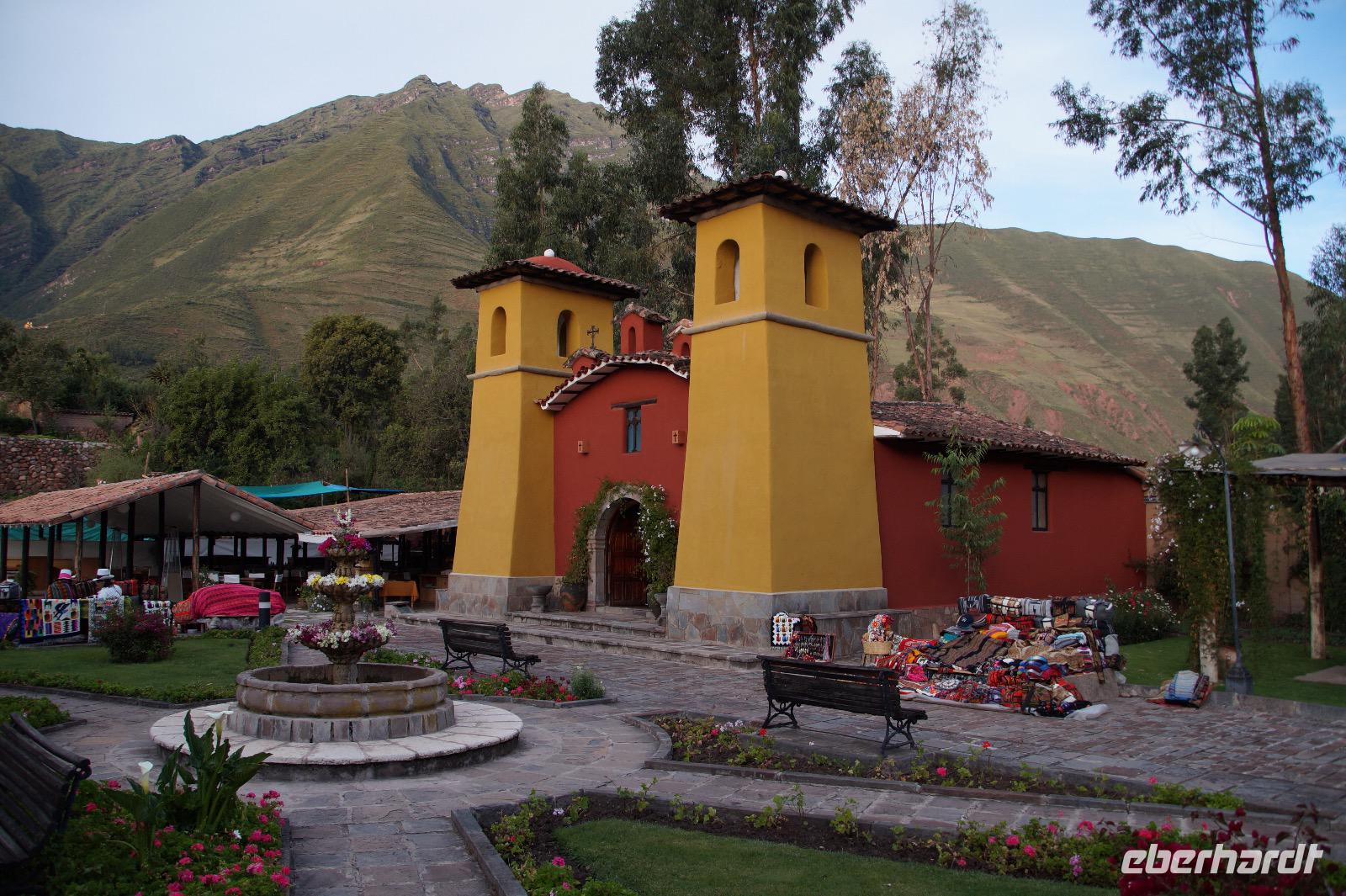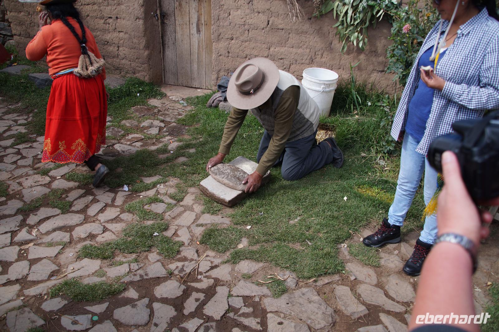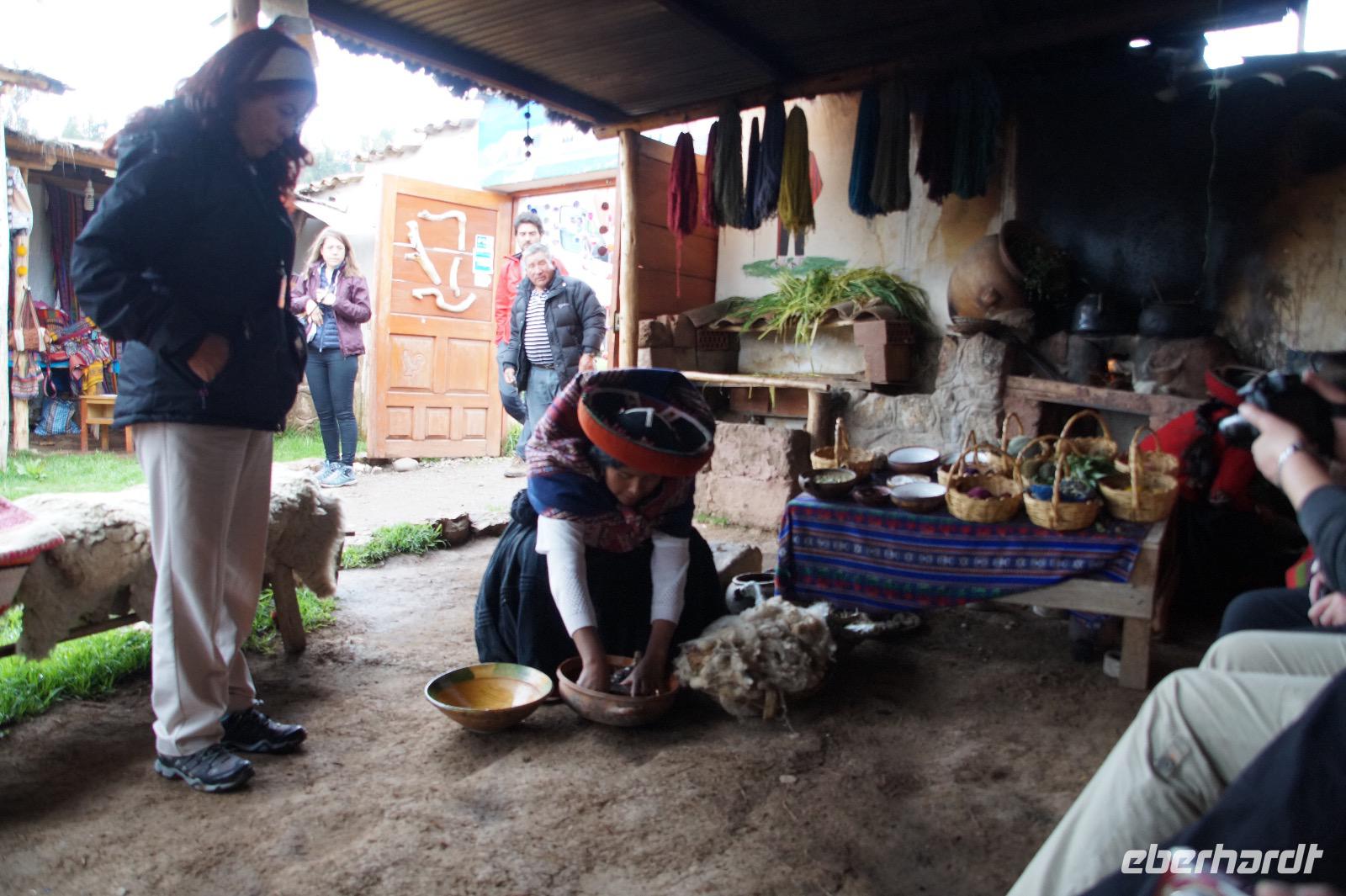 Sie zeigen uns, wie man Naturshampoo aus einer Wurzel herstellt und am Beispiel von Schafswolle, wie gut dieses funktioniert, zeigen das Spindeln per Hand, wie leicht ungesponnene Wolle reißt und wie man die Wolle färbt (verschiedene Orange- bis Lilatöne allein aus der Cochinillelaus, je nach weiterer Zutat) und schließlich webt. Anschließend fahren wir weiter in den Ort hinein, um die Kirche von Chinchero zu besuchen, die auf einem alten Inkatempel und Herrscherpalast steht.
