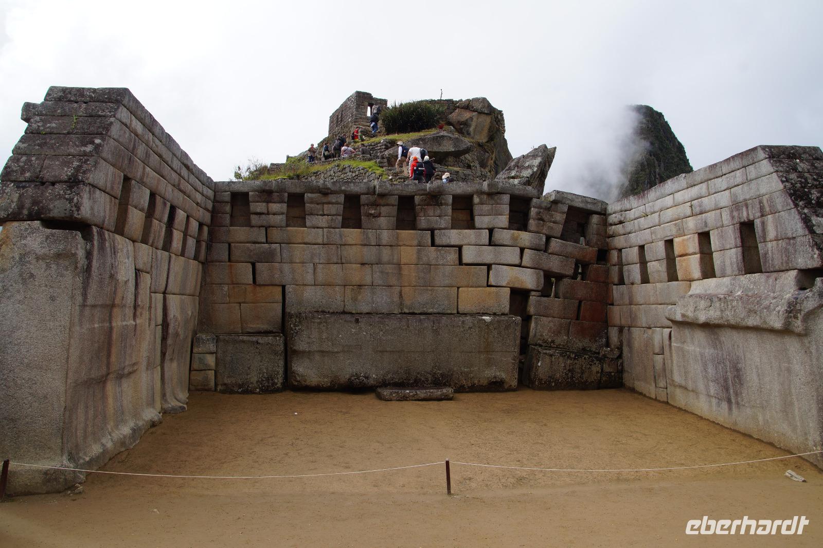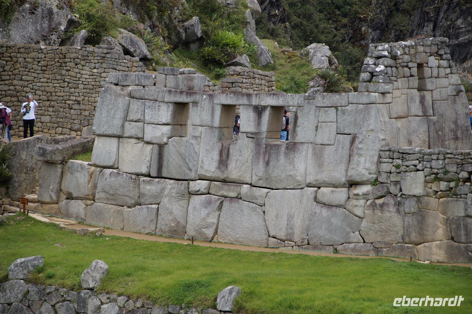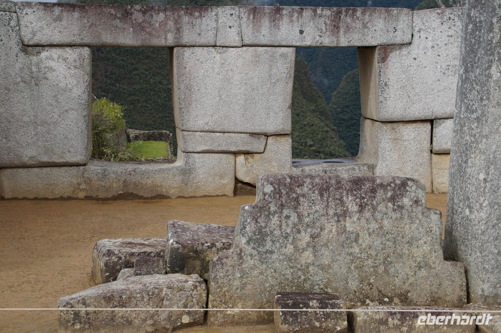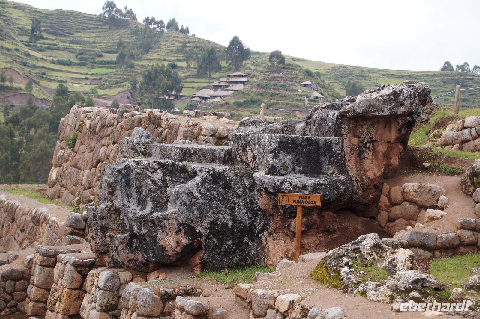 Anschließend geht es zum Heiligen Platz, wo sich der Haupttempel der Anlage (für Wirakocha) und der Tempel der drei Fenster befinden, zudem das sogenannte Haus des Priesters. Die drei Gebäude wurden nie fertig gestellt, dafür haben aber die Steinblöcke, aus denen sie errichtet wurden, ein gewaltiges Ausmaß.