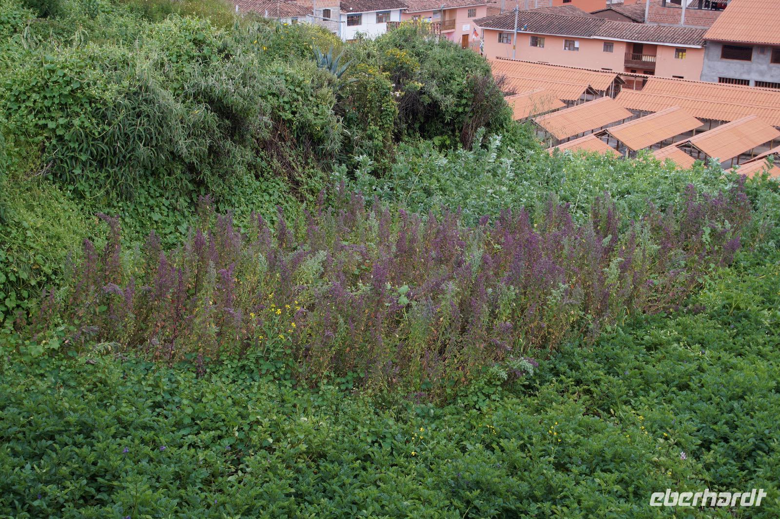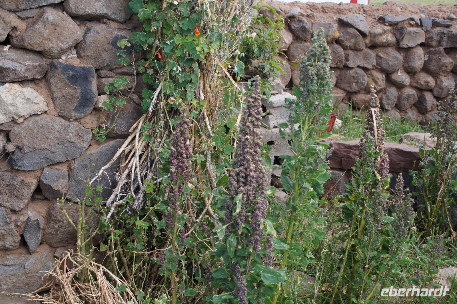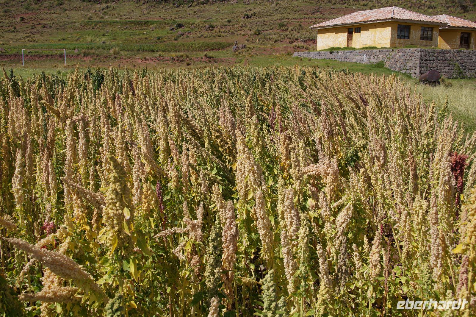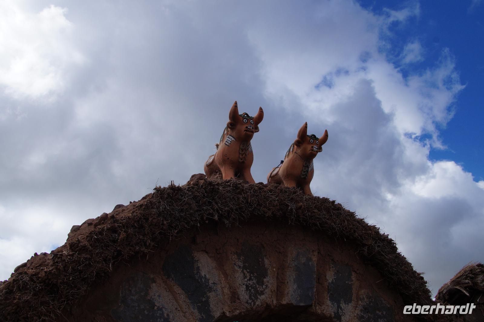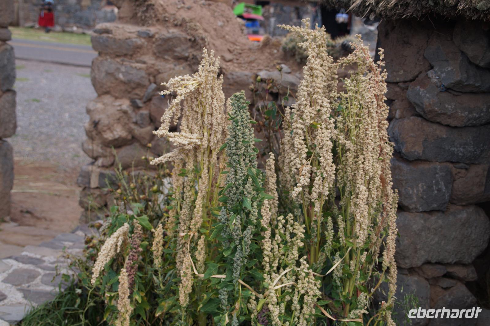 Wir setzen unsere Fahrt in Richtung des Altiplano peruano weiter. Wir kommen vorbei an Urcos, wo es heißt, dass der letzte Inka hier seine Goldkette in den See warf, um sie nicht seinem Bruder zukommen zu lassen, der sich mit den Spaniern verbündet hatte. Heerscharen von Schatzjägern haben sie in dem besseren Teich nicht finden können und uns mangelt es gerade an Muße anzuhalten. Unser Ziel ist Raqchi, wo wir den letzten Inka-Tempel unserer Rundreise sehen werden, geweiht dem Schöpfergott Wirakocha. Seit fast 600 Jahren reckt sich die Mauer des Tempels, unten aus Stein, oben aus sonnengetrockneten Ziegeln nach oben, erst sei 20 Jahren trägt sie wieder ein Regendach, um die Lehmwand vor der Zerstörung zu schützen. Tierhaar, Knochen, Keramik und als Härter ein Kaktussekret sorgen für die dauerhafte Stabilität der Wand, welche den Tempel in der Hälfte teilt.