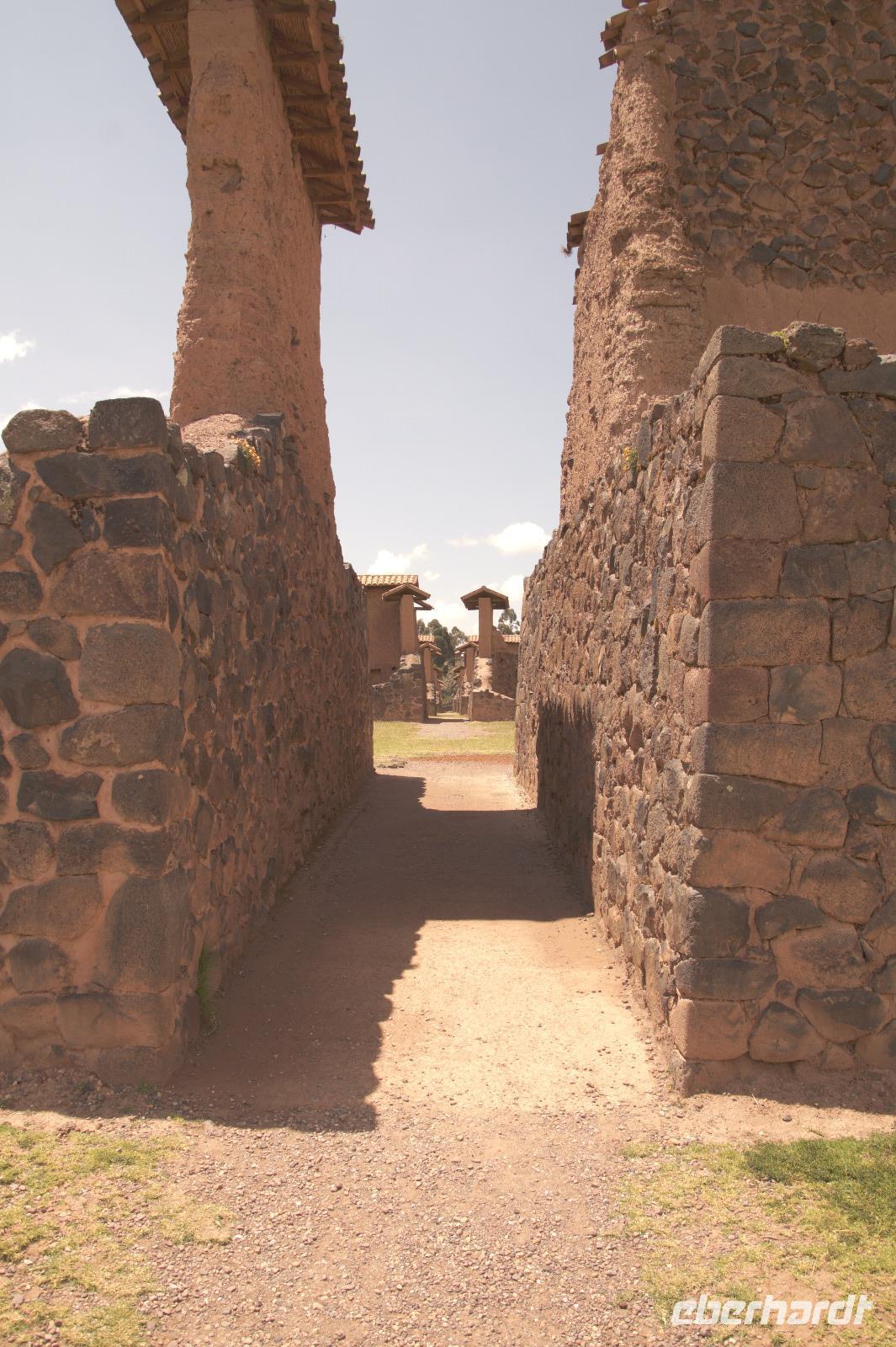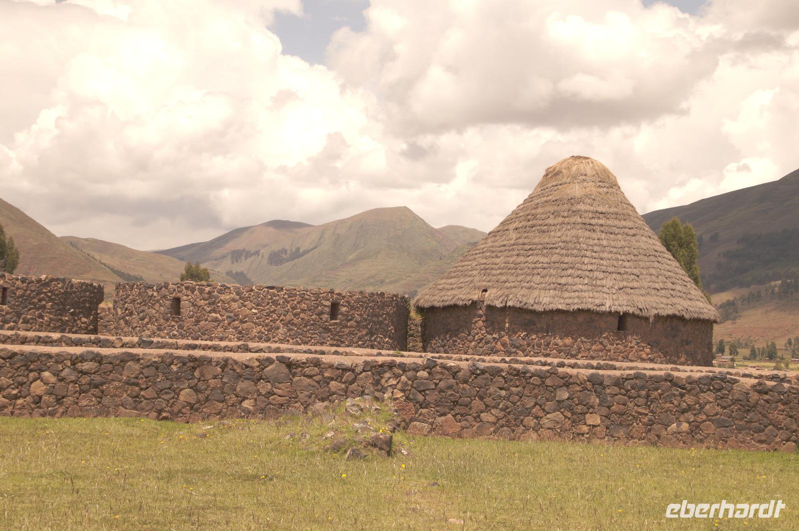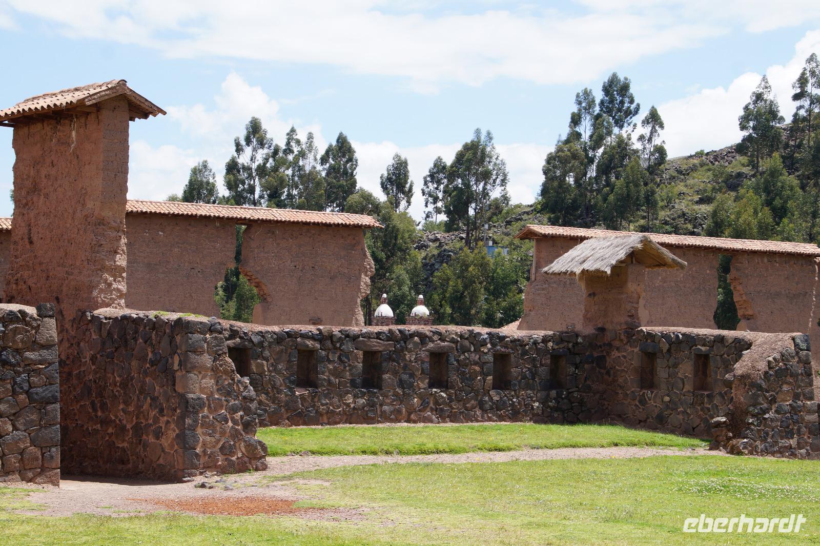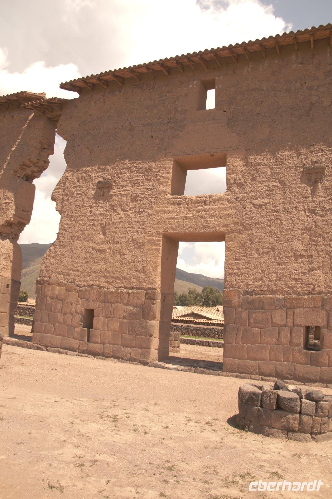 Adelspaläste, die an einer Ost-West-Achse symmetrisch aufgereit sind runde Lagerhäuser schließen sich an. In in Raqchi soll sich die Inkaelite getroffen haben, wenn es darum ging, aus den führenden Familien einen neuen Inka zu bestimmen.