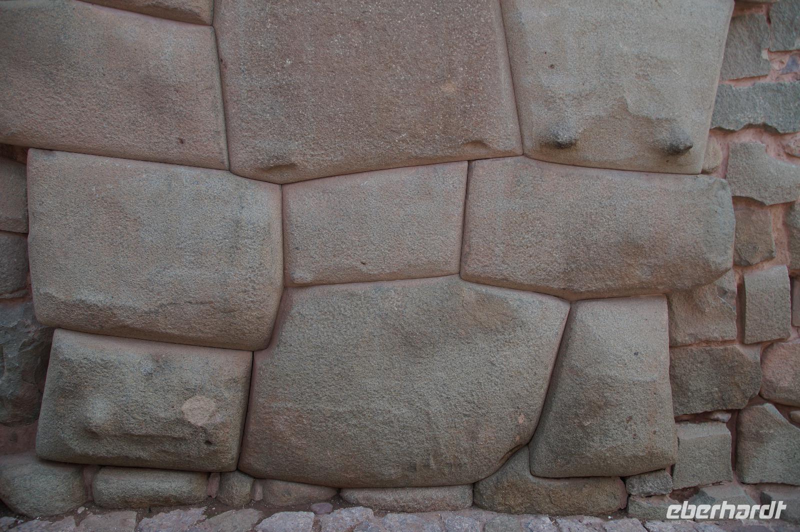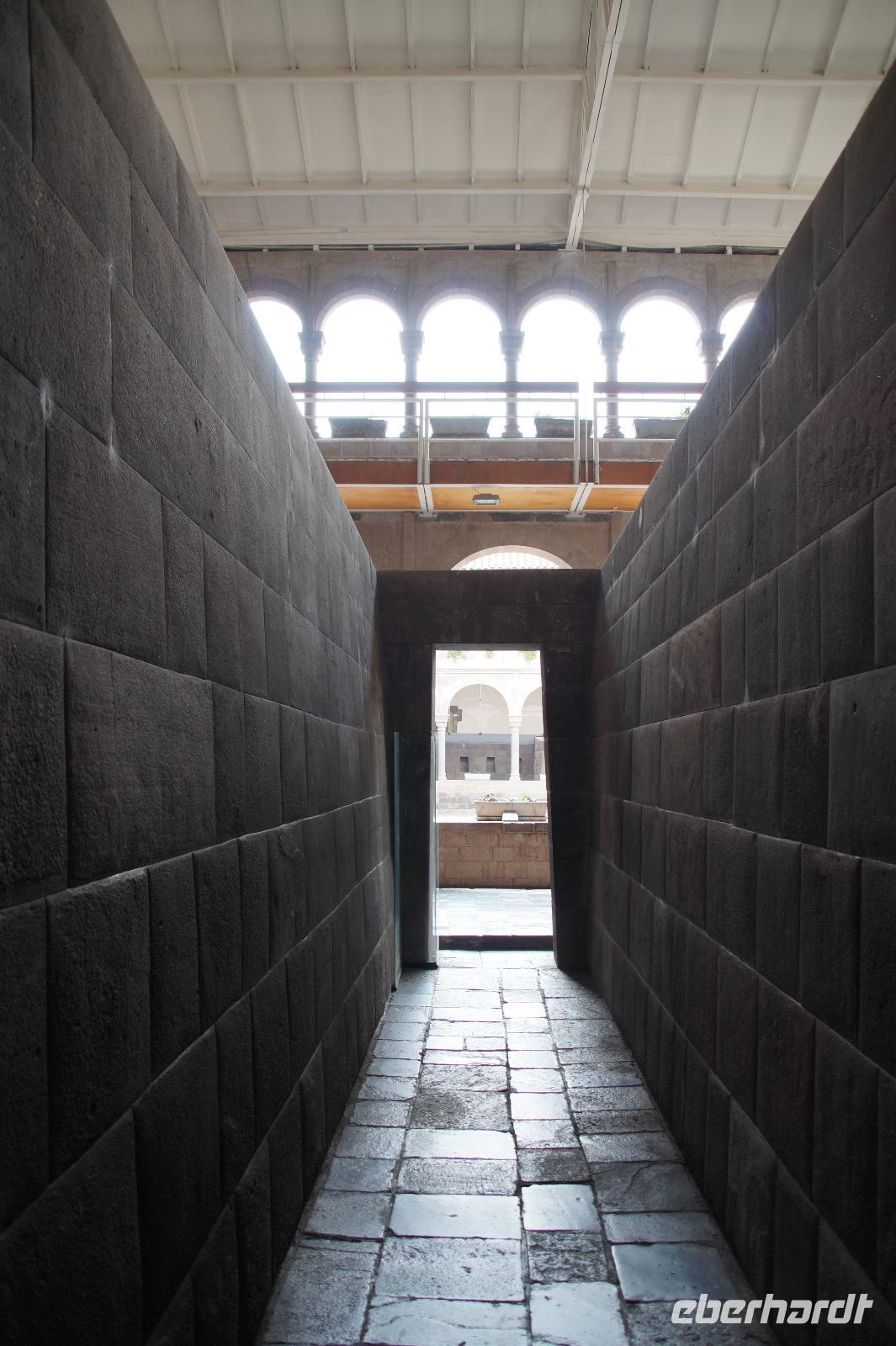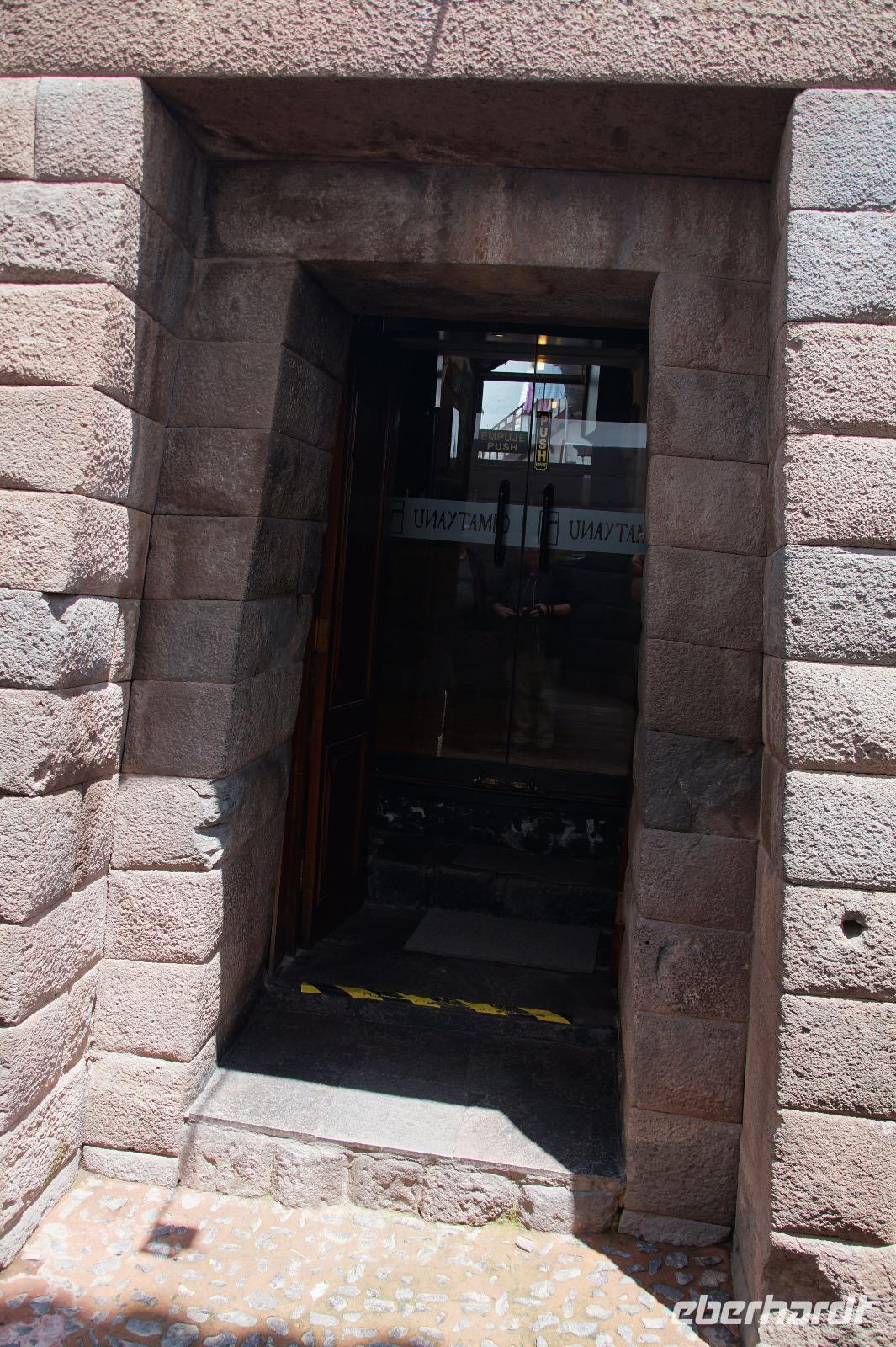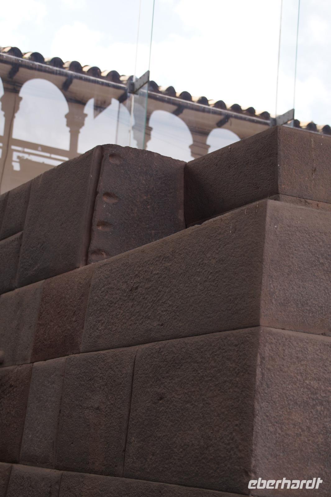 Wir kommen vorbei an dem Haus des Chronisten Garcilaso de la Vega el Inca, der Sohn eines Konquistadoren und einer Ñusta, einer Inka-Prinzessin. Unser nächstes Ziel ist der Gold- oder Sonnenhof. Coricancha oder Inticancha. Inticancha war der originale Name, aber heute ist der Gebäudekomplex, der vom Dominikanerkloster Cuzcos überbaut ist, unter (Convento de Santo Domingo de) Coricancha bekannter. Der Coricancha-Komplex soll vor der Ankunft der Spanier stark vergoldet gewesen sein, mit lebensgroßen Repliken von Tieren und Pflanzen in massivem Gold. Dieses Gold soll für die Befreiung Atahualpas aus der Hand der Spanier aufgewendet worden sein, die Spanier ließen es in Barren umschmelzen, so dass neben dem Gold vor allem auch kunstgeschichtliche Werte verloren gingen. Aber der Coricancha-Komplex, der aus verschiedenen Tempeln besteht, einem Sonnentempel, einem für den Regenbogen, für die Milchstraße (wobei die Inka in den dunklen Flecken der Milchstraße Tier wiedererkennen wollten), ein Wasserheiligtum und den Mond, ist immer noch, trotz seiner Überbauung durch den Dominikanerkonvent, beeindruckend, vor allem durch die Perfektion seiner Steine. Ein Stein etwa ist Teil eines Türrahmens und dreier Wände und perfekt eingepasst. Dabei ist alles unscheinbar und nichts schreit nach der Aufmerksamkeit der Besucher, man muss sich den Tempel regelrecht erschauen, die Perfektion entdecken. Es sind die kleinen Details, welche die Inkaarchitektur so faszinierend, welche auch den Coricancha-Komplex innerhalb der Inkaarchitektur so herausragend machen.