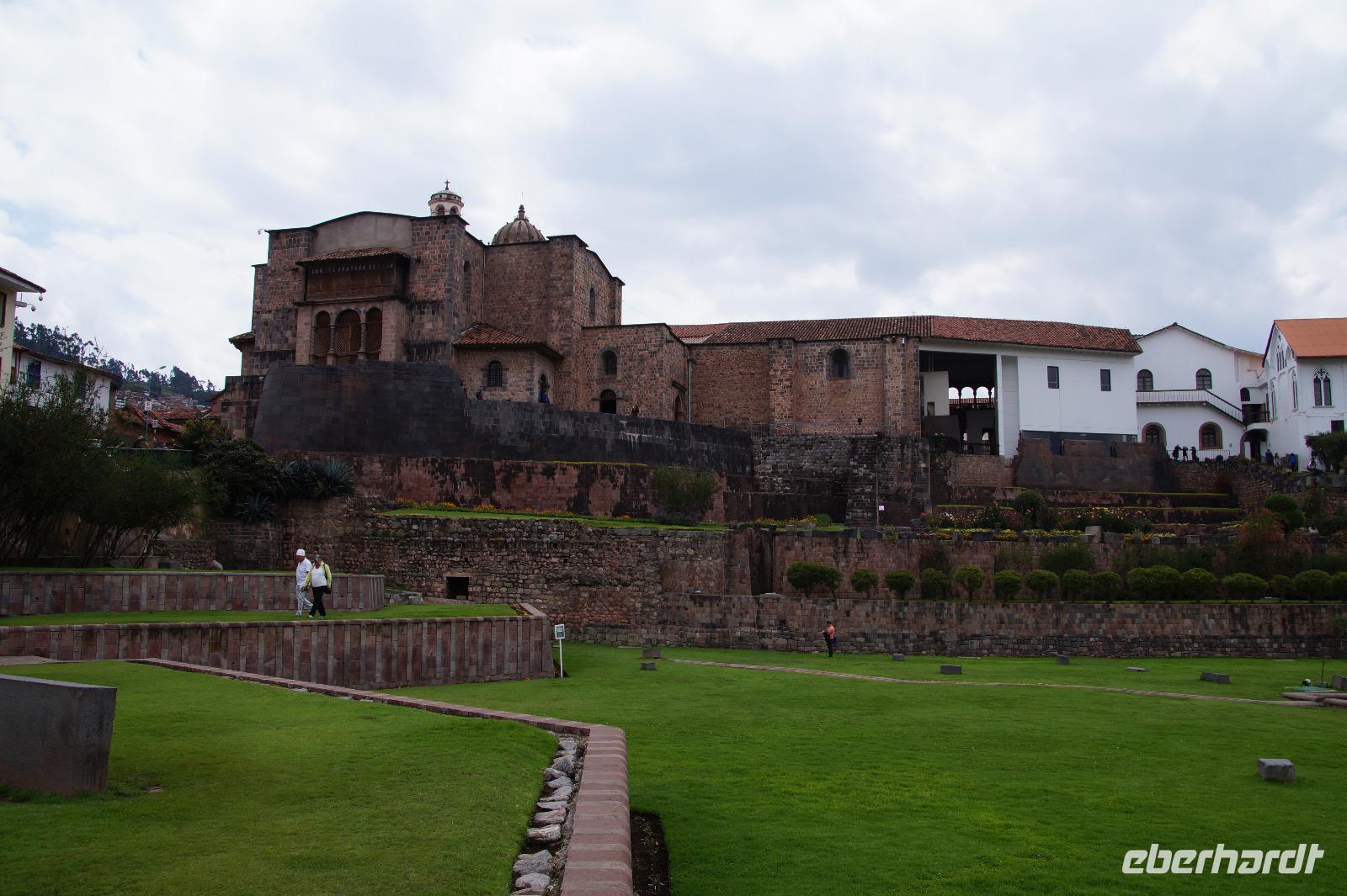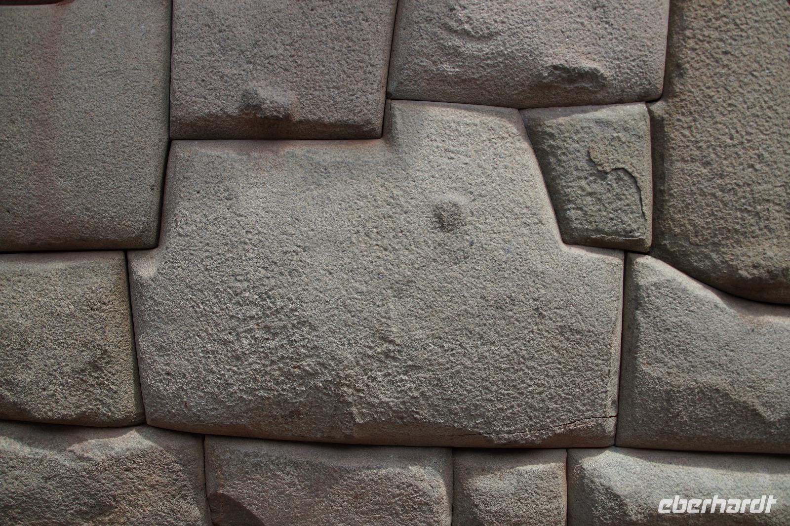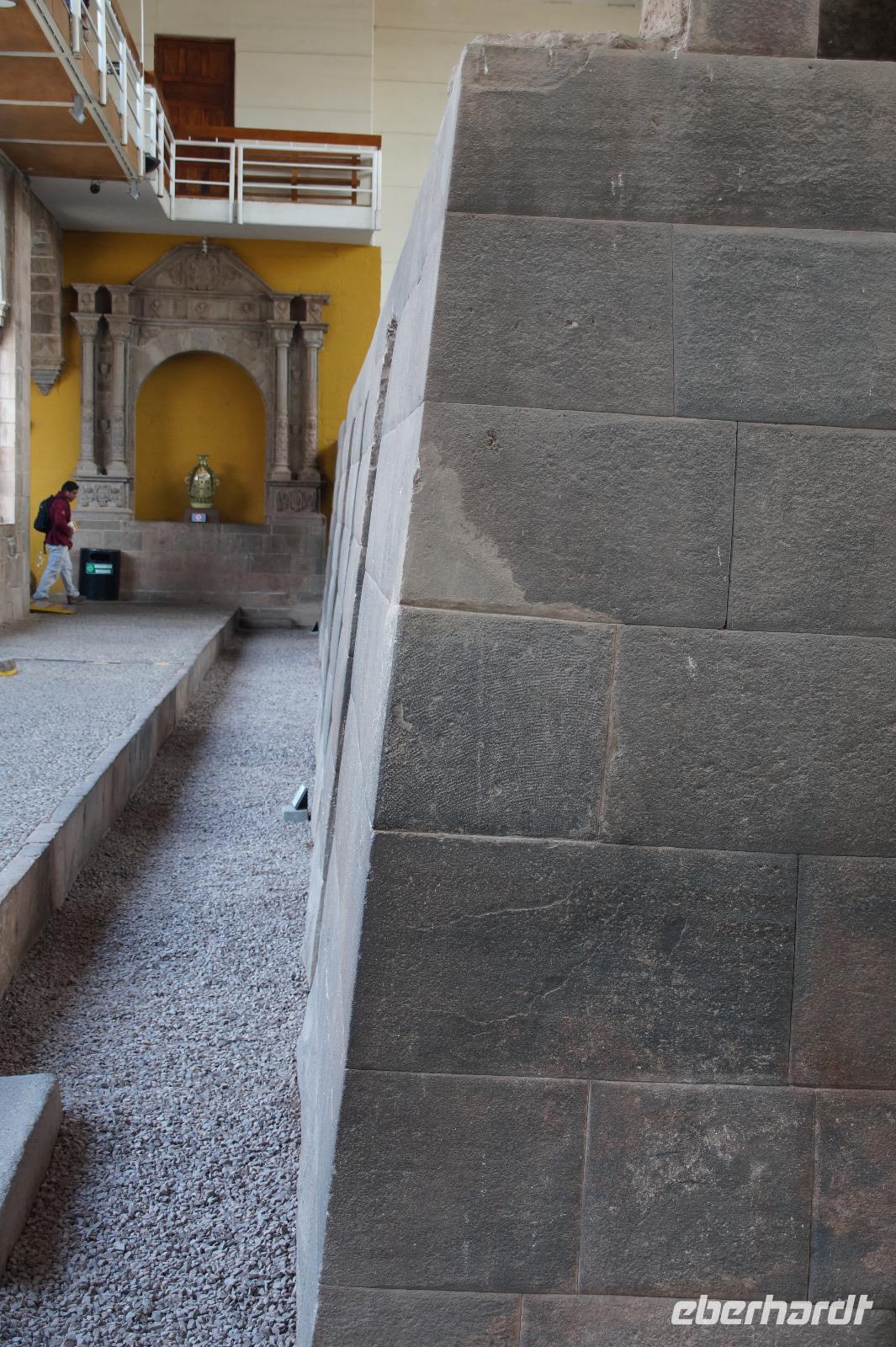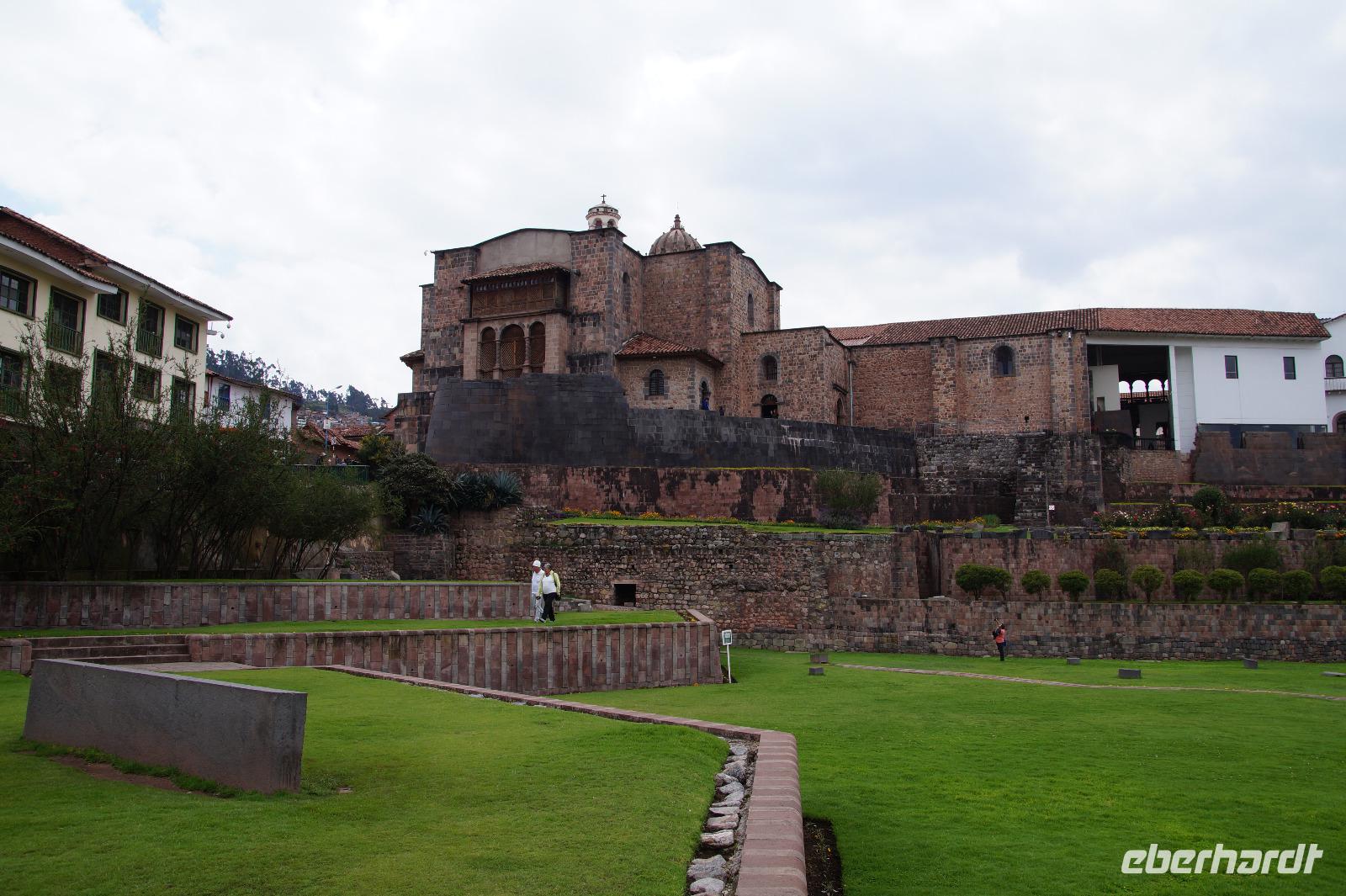 Wir kommen vorbei an dem Haus des Chronisten Garcilaso de la Vega el Inca, der Sohn eines Konquistadoren und einer Ñusta, einer Inka-Prinzessin. Unser nächstes Ziel ist der Gold- oder Sonnenhof. Coricancha oder Inticancha. Inticancha war der originale Name, aber heute ist der Gebäudekomplex, der vom Dominikanerkloster Cuzcos überbaut ist, unter (Convento de Santo Domingo de) Coricancha bekannter. Der Coricancha-Komplex soll vor der Ankunft der Spanier stark vergoldet gewesen sein, mit lebensgroßen Repliken von Tieren und Pflanzen in massivem Gold. Dieses Gold soll für die Befreiung Atahualpas aus der Hand der Spanier aufgewendet worden sein, die Spanier ließen es in Barren umschmelzen, so dass neben dem Gold vor allem auch kunstgeschichtliche Werte verloren gingen. Aber der Coricancha-Komplex, der aus verschiedenen Tempeln besteht, einem Sonnentempel, einem für den Regenbogen, für die Milchstraße (wobei die Inka in den dunklen Flecken der Milchstraße Tier wiedererkennen wollten), ein Wasserheiligtum und den Mond, ist immer noch, trotz seiner Überbauung durch den Dominikanerkonvent, beeindruckend, vor allem durch die Perfektion seiner Steine. Ein Stein etwa ist Teil eines Türrahmens und dreier Wände und perfekt eingepasst. Dabei ist alles unscheinbar und nichts schreit nach der Aufmerksamkeit der Besucher, man muss sich den Tempel regelrecht erschauen, die Perfektion entdecken. Es sind die kleinen Details, welche die Inkaarchitektur so faszinierend, welche auch den Coricancha-Komplex innerhalb der Inkaarchitektur so herausragend machen.