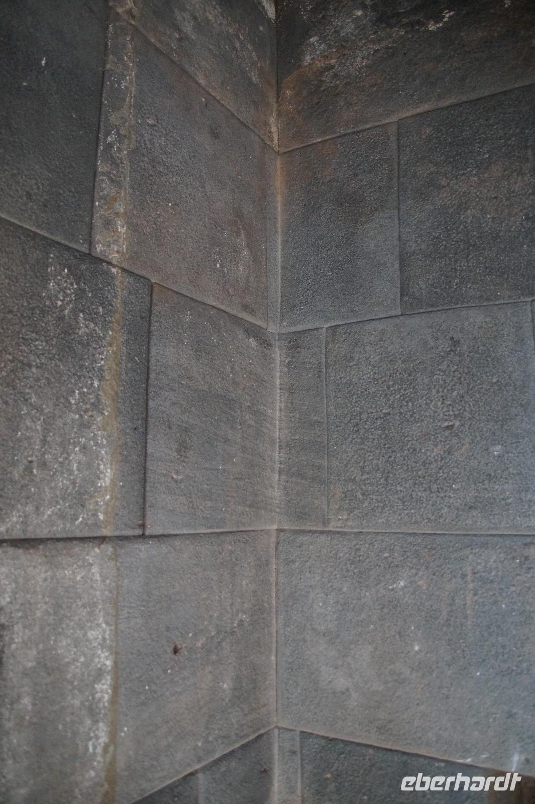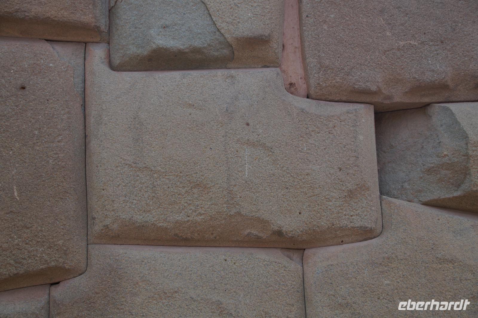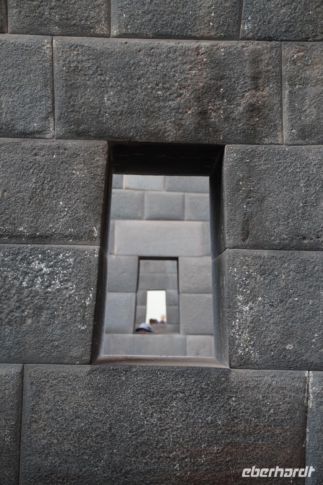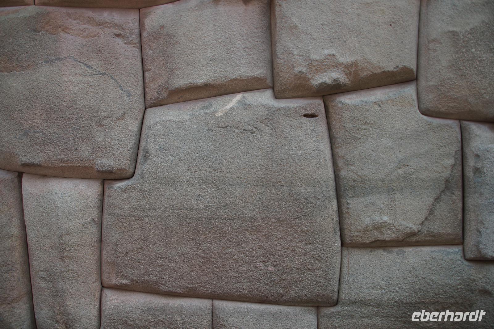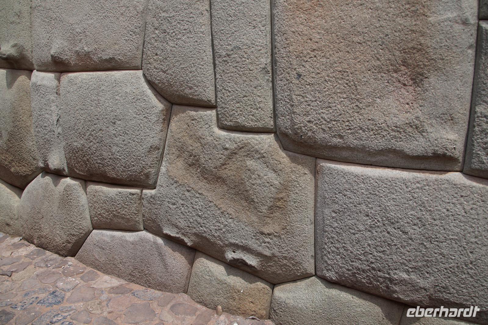 Wir kommen vorbei an dem Haus des Chronisten Garcilaso de la Vega el Inca, der Sohn eines Konquistadoren und einer Ñusta, einer Inka-Prinzessin. Unser nächstes Ziel ist der Gold- oder Sonnenhof. Coricancha oder Inticancha. Inticancha war der originale Name, aber heute ist der Gebäudekomplex, der vom Dominikanerkloster Cuzcos überbaut ist, unter (Convento de Santo Domingo de) Coricancha bekannter. Der Coricancha-Komplex soll vor der Ankunft der Spanier stark vergoldet gewesen sein, mit lebensgroßen Repliken von Tieren und Pflanzen in massivem Gold. Dieses Gold soll für die Befreiung Atahualpas aus der Hand der Spanier aufgewendet worden sein, die Spanier ließen es in Barren umschmelzen, so dass neben dem Gold vor allem auch kunstgeschichtliche Werte verloren gingen. Aber der Coricancha-Komplex, der aus verschiedenen Tempeln besteht, einem Sonnentempel, einem für den Regenbogen, für die Milchstraße (wobei die Inka in den dunklen Flecken der Milchstraße Tier wiedererkennen wollten), ein Wasserheiligtum und den Mond, ist immer noch, trotz seiner Überbauung durch den Dominikanerkonvent, beeindruckend, vor allem durch die Perfektion seiner Steine. Ein Stein etwa ist Teil eines Türrahmens und dreier Wände und perfekt eingepasst. Dabei ist alles unscheinbar und nichts schreit nach der Aufmerksamkeit der Besucher, man muss sich den Tempel regelrecht erschauen, die Perfektion entdecken. Es sind die kleinen Details, welche die Inkaarchitektur so faszinierend, welche auch den Coricancha-Komplex innerhalb der Inkaarchitektur so herausragend machen.