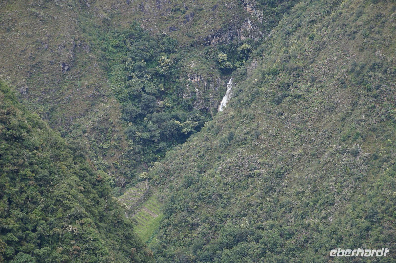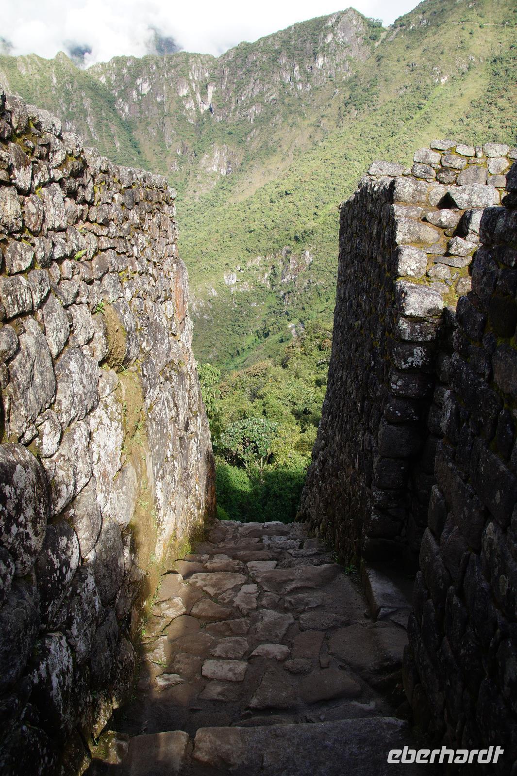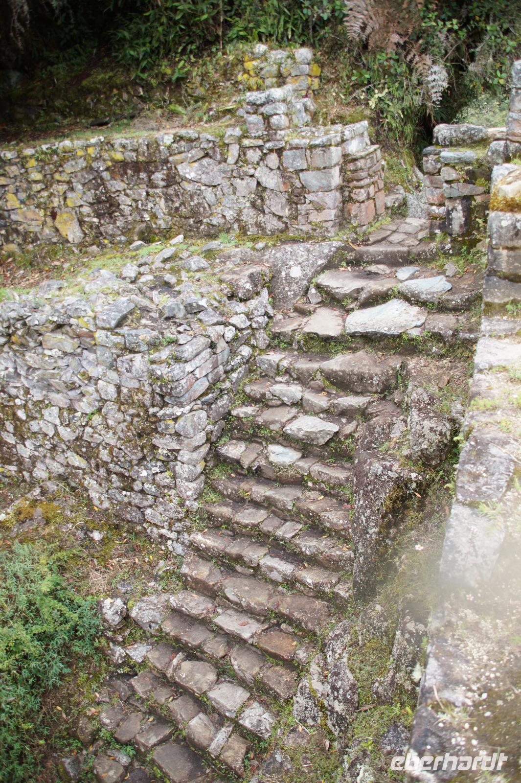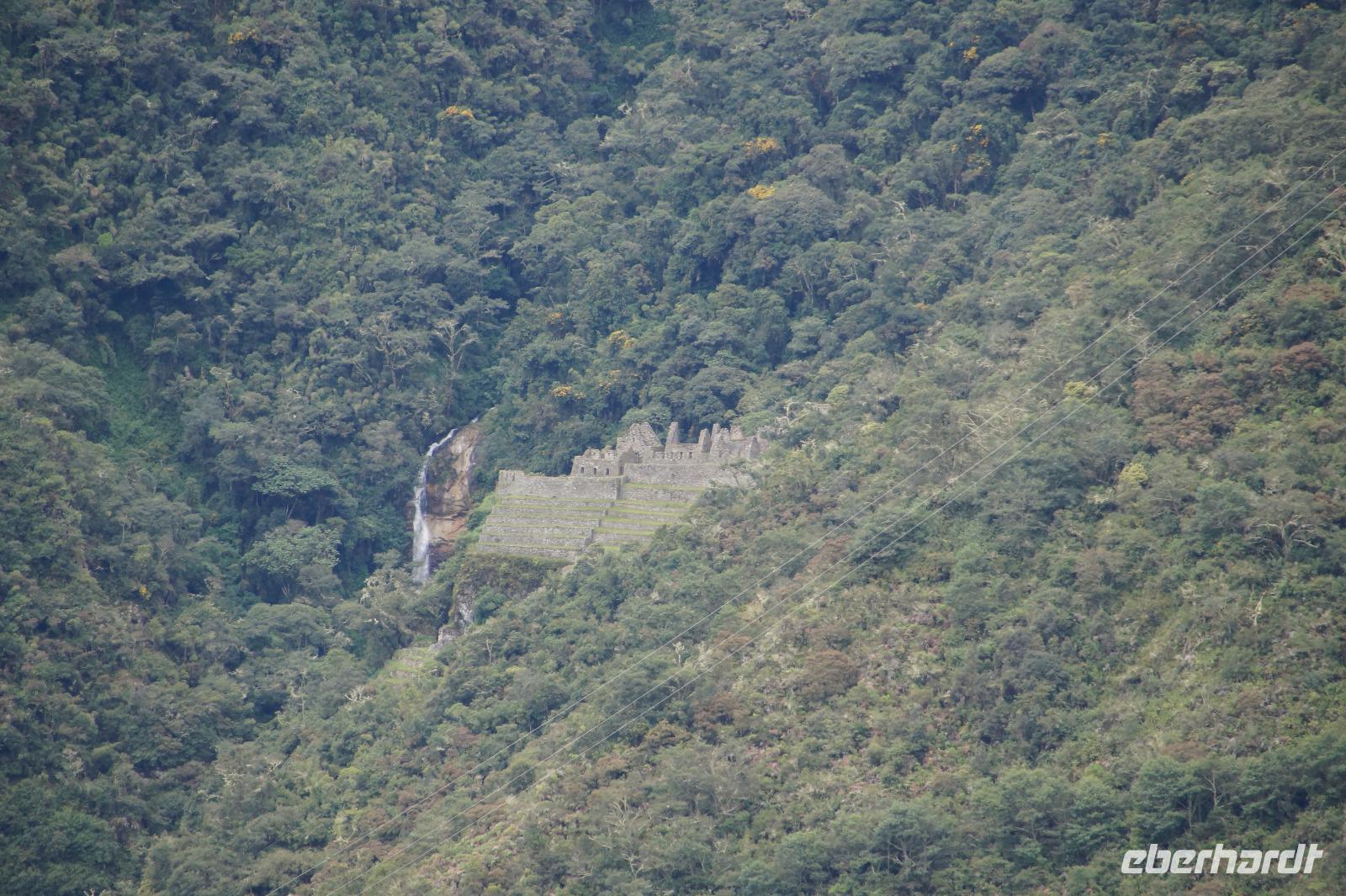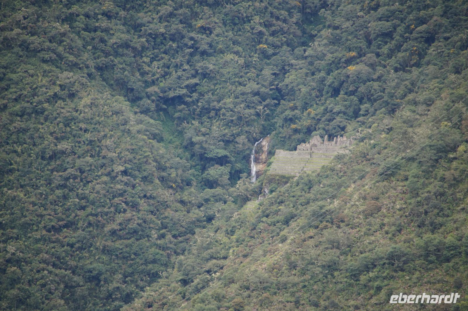 Zunächst bleibt unser kleiner Trupp noch zusammen, aber dann fasert es sich immer weiter aus. Unser Ziel ist Inti Punku, das Sonnentor. Sieht gar nicht so weit aus bis dorthin, aber man benötigt dann doch leicht vierzig Minuten. Ich bin nicht sicher, dass wir alle sechs dort waren, aber zumindest fünf von uns haben es bis dorthin geschafft. Ein Wächter der dort steht verrät mir, dass, wenn man durch Inti Punku dem Inka Trail noch weiter folgt, man an einen Aussichtpunkt kommt. Zu dritt folgen wir diesem Weg. Wir kommen an eine steile Treppe, wo sich in der Inka-Zeit so etwas wie ein Wachposten befand. Von dort aus sehen wir in einigen Kilometern Entfernung die Inka-Siedlung Winay Wayna, wo sich bei einem Wasserfall ein Wasserheiligtum befindet.