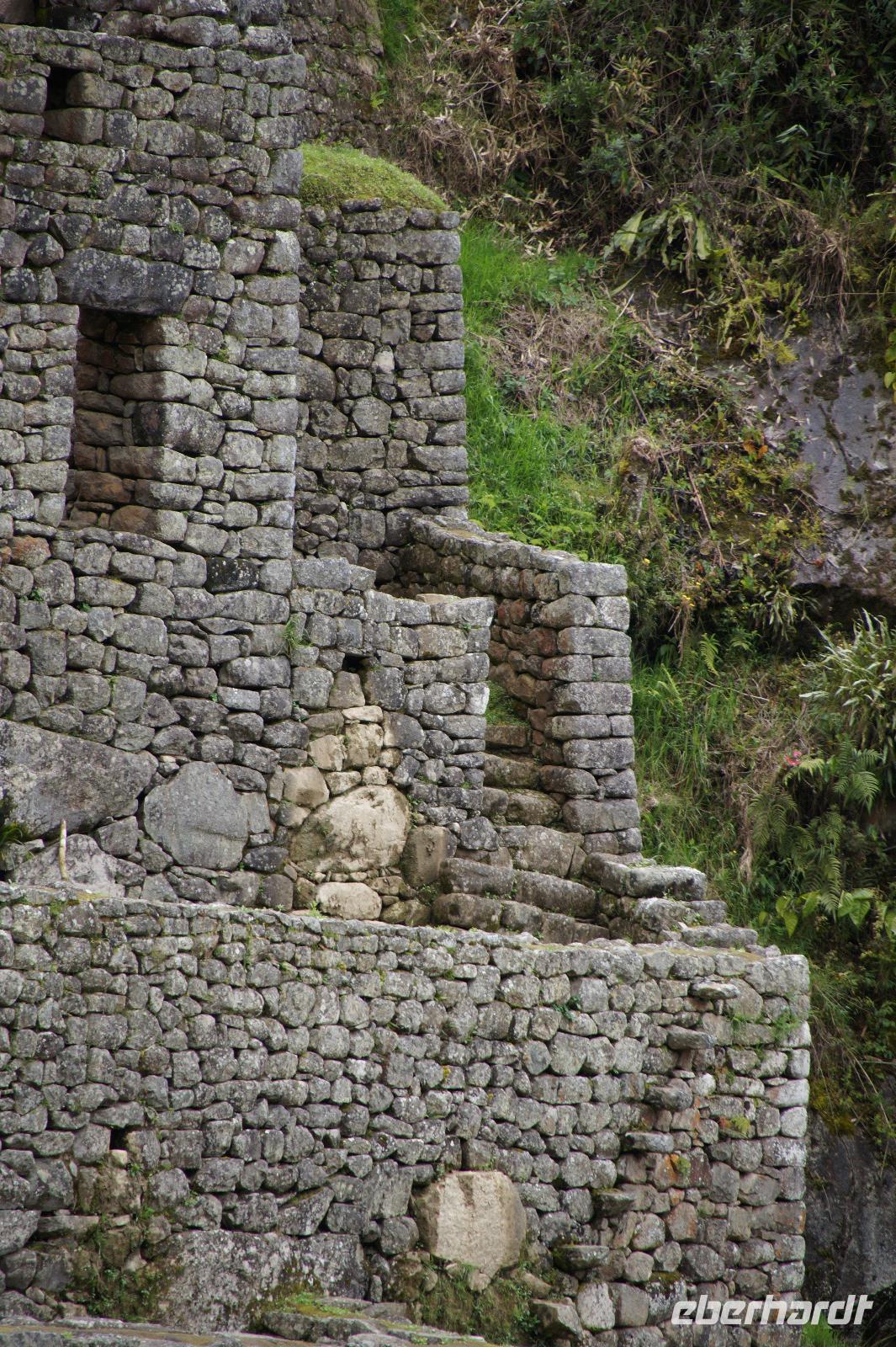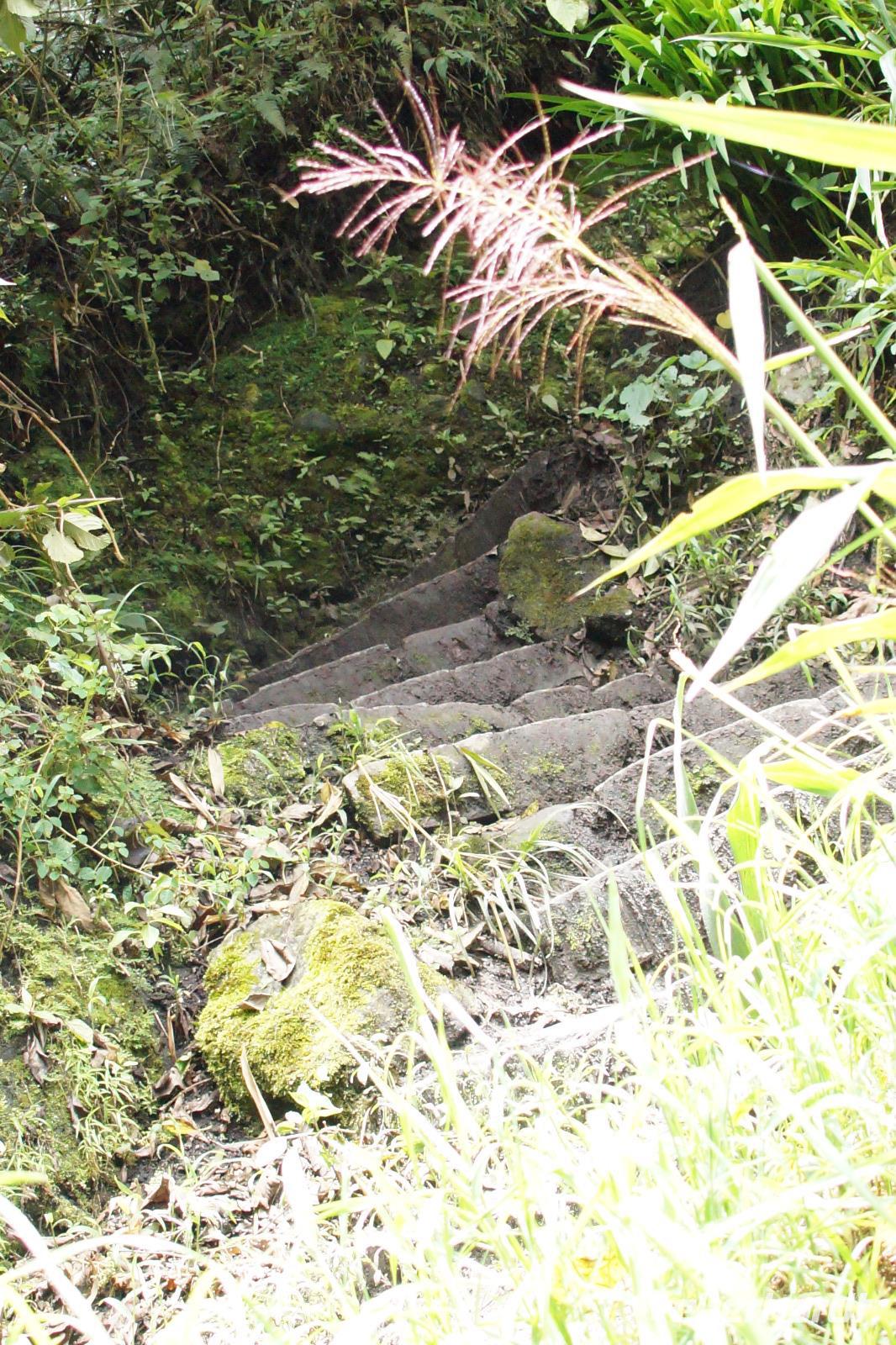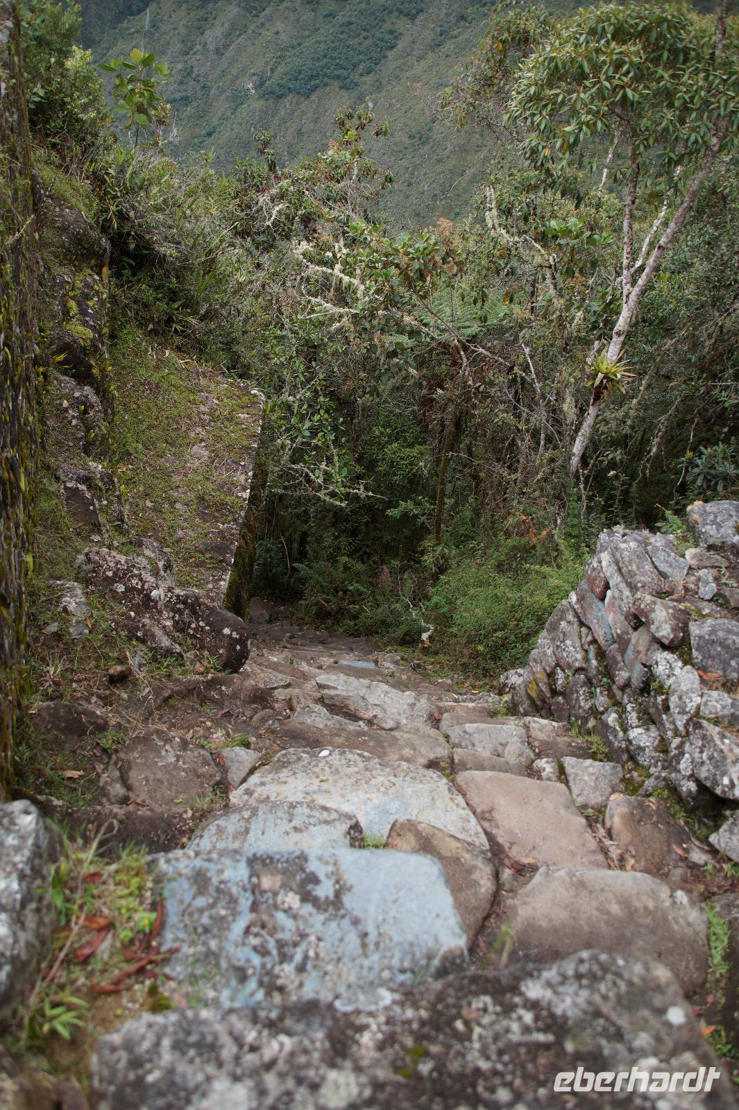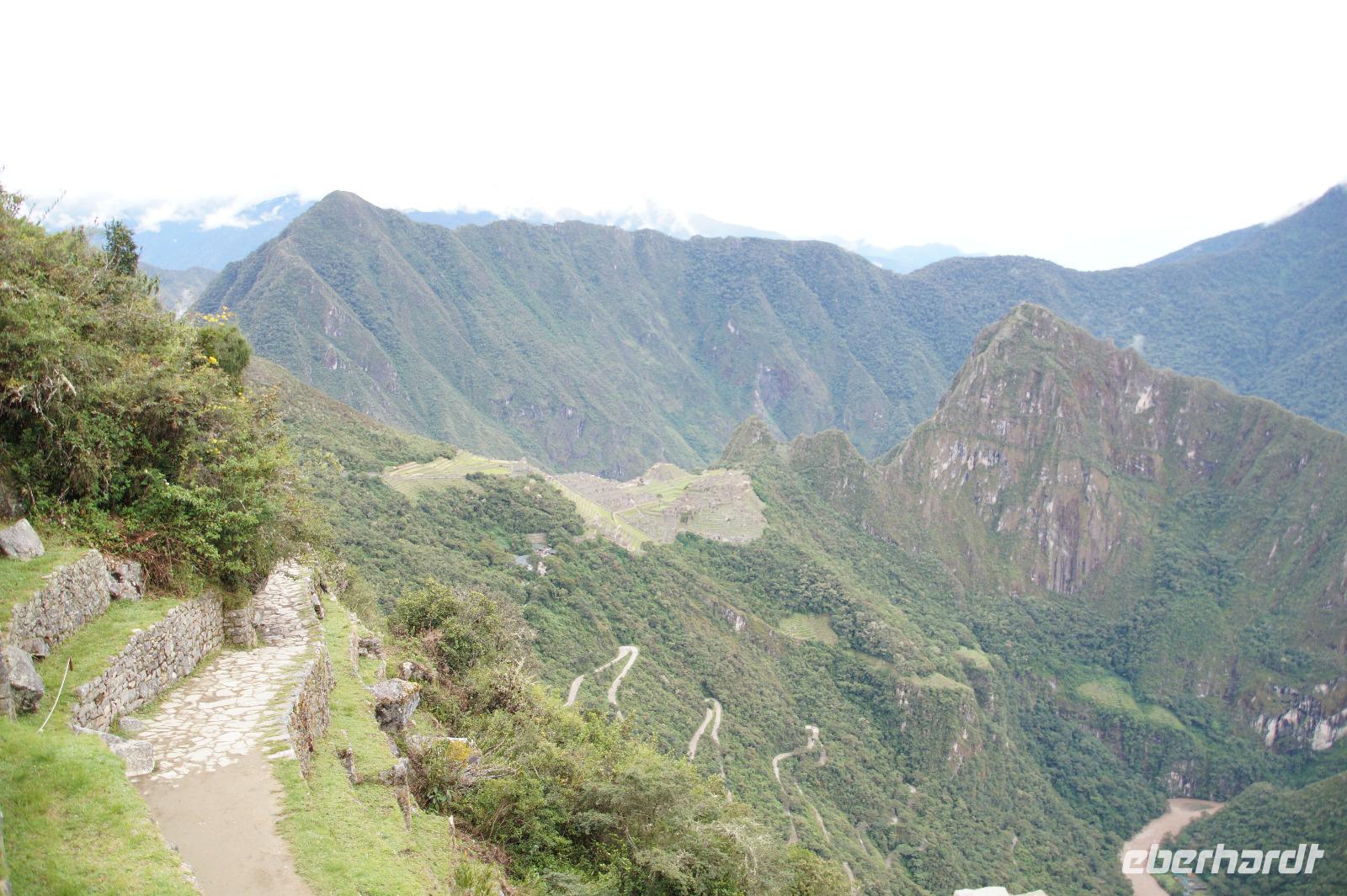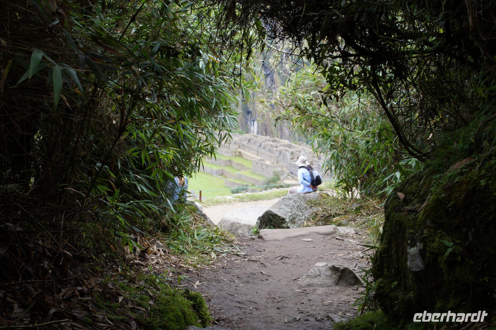 Zunächst bleibt unser kleiner Trupp noch zusammen, aber dann fasert es sich immer weiter aus. Unser Ziel ist Inti Punku, das Sonnentor. Sieht gar nicht so weit aus bis dorthin, aber man benötigt dann doch leicht vierzig Minuten. Ich bin nicht sicher, dass wir alle sechs dort waren, aber zumindest fünf von uns haben es bis dorthin geschafft. Ein Wächter der dort steht verrät mir, dass, wenn man durch Inti Punku dem Inka Trail noch weiter folgt, man an einen Aussichtpunkt kommt. Zu dritt folgen wir diesem Weg. Wir kommen an eine steile Treppe, wo sich in der Inka-Zeit so etwas wie ein Wachposten befand. Von dort aus sehen wir in einigen Kilometern Entfernung die Inka-Siedlung Winay Wayna, wo sich bei einem Wasserfall ein Wasserheiligtum befindet.