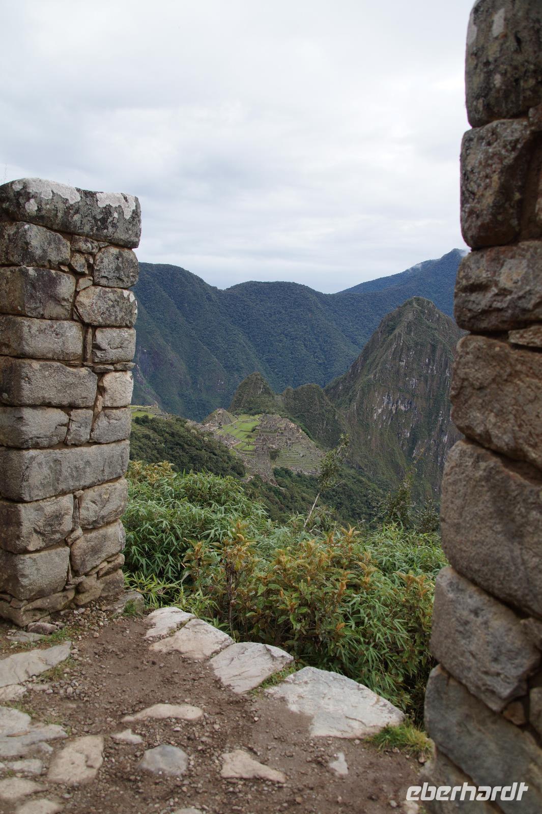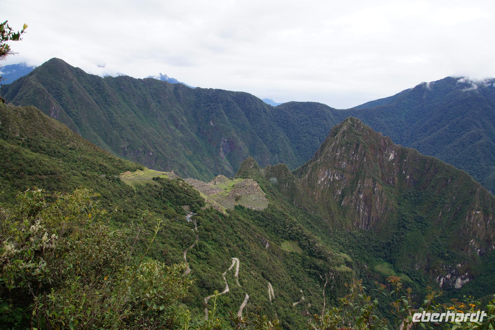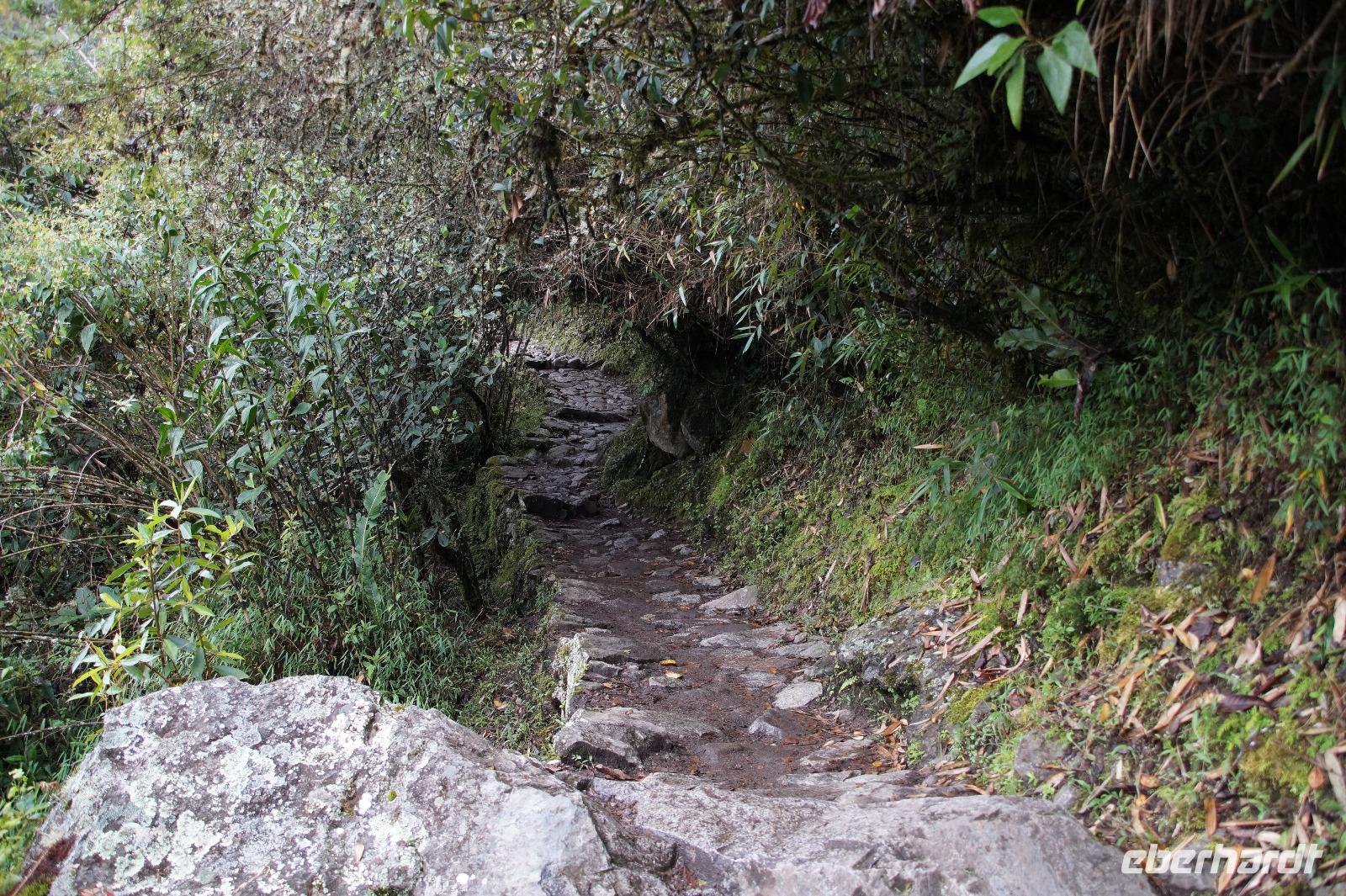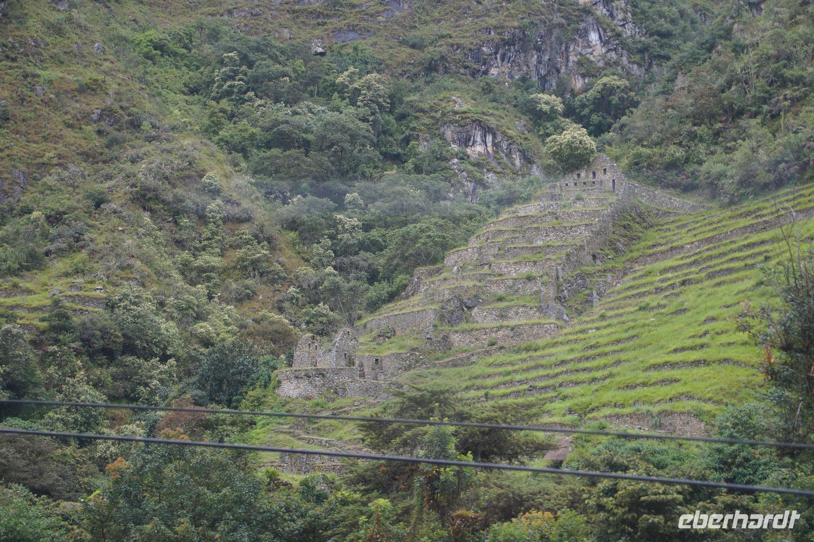 Zunächst bleibt unser kleiner Trupp noch zusammen, aber dann fasert es sich immer weiter aus. Unser Ziel ist Inti Punku, das Sonnentor. Sieht gar nicht so weit aus bis dorthin, aber man benötigt dann doch leicht vierzig Minuten. Ich bin nicht sicher, dass wir alle sechs dort waren, aber zumindest fünf von uns haben es bis dorthin geschafft. Ein Wächter der dort steht verrät mir, dass, wenn man durch Inti Punku dem Inka Trail noch weiter folgt, man an einen Aussichtpunkt kommt. Zu dritt folgen wir diesem Weg. Wir kommen an eine steile Treppe, wo sich in der Inka-Zeit so etwas wie ein Wachposten befand. Von dort aus sehen wir in einigen Kilometern Entfernung die Inka-Siedlung Winay Wayna, wo sich bei einem Wasserfall ein Wasserheiligtum befindet.