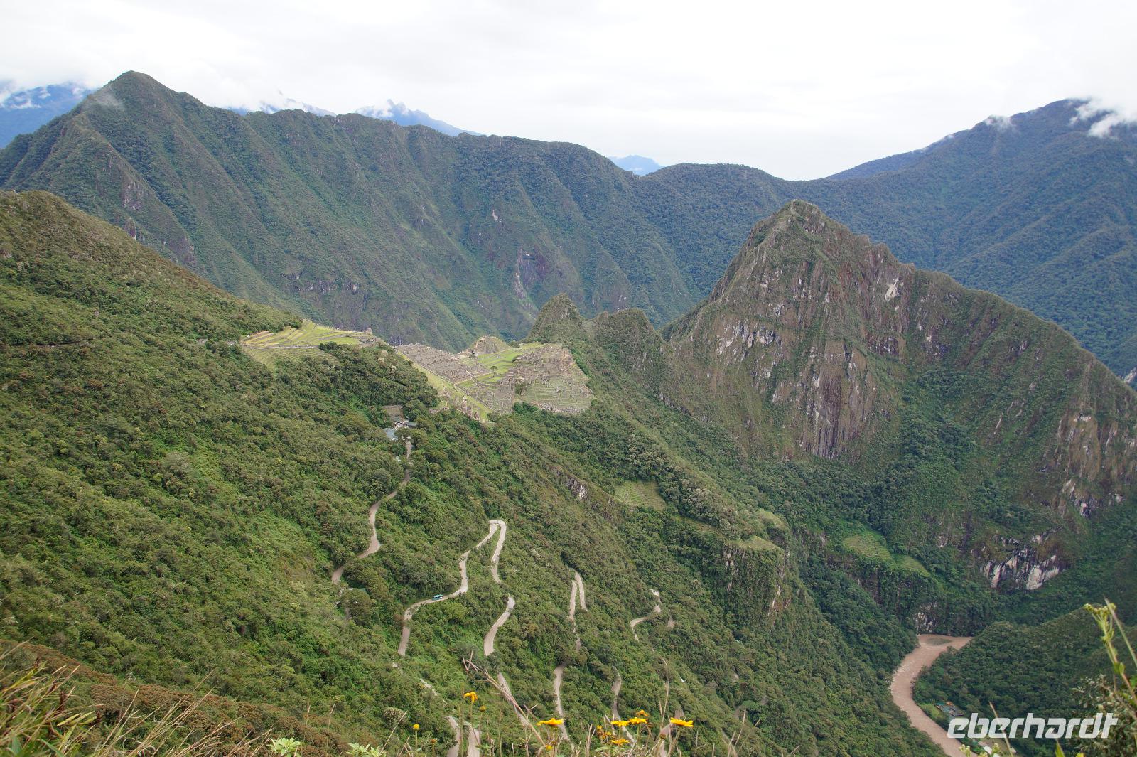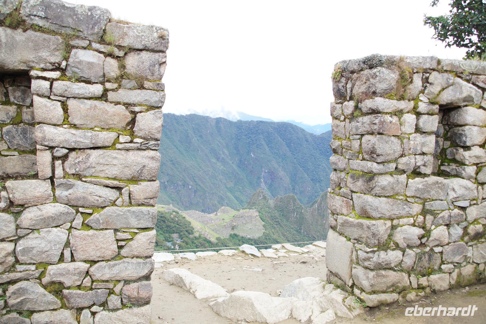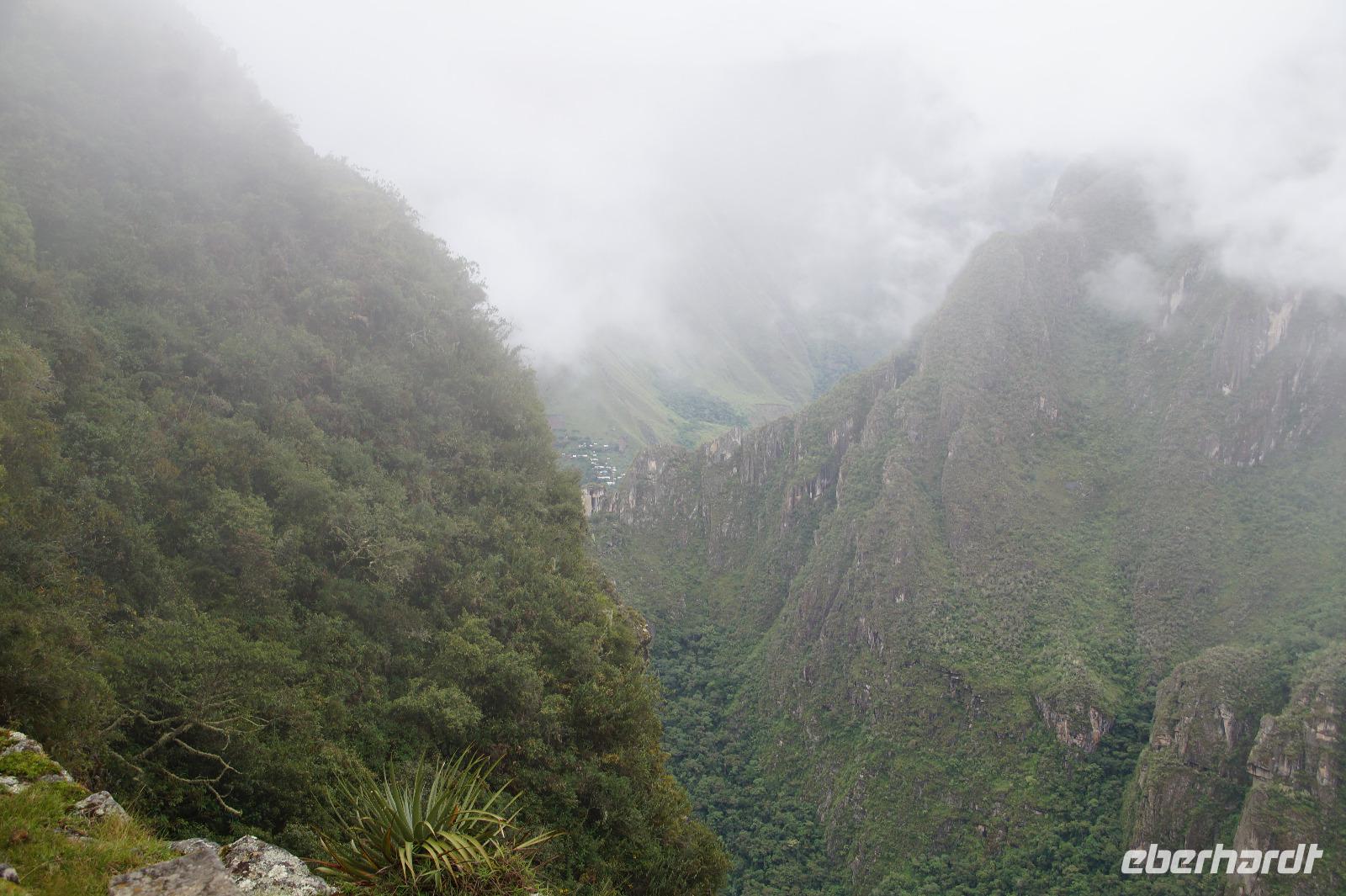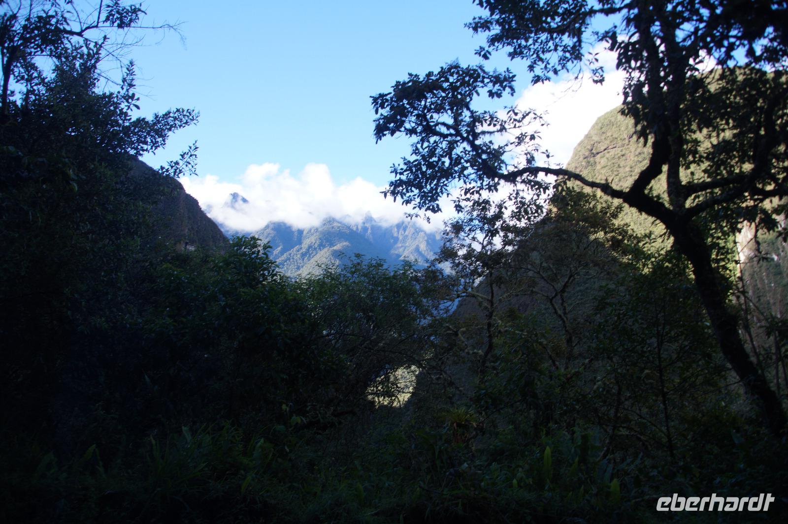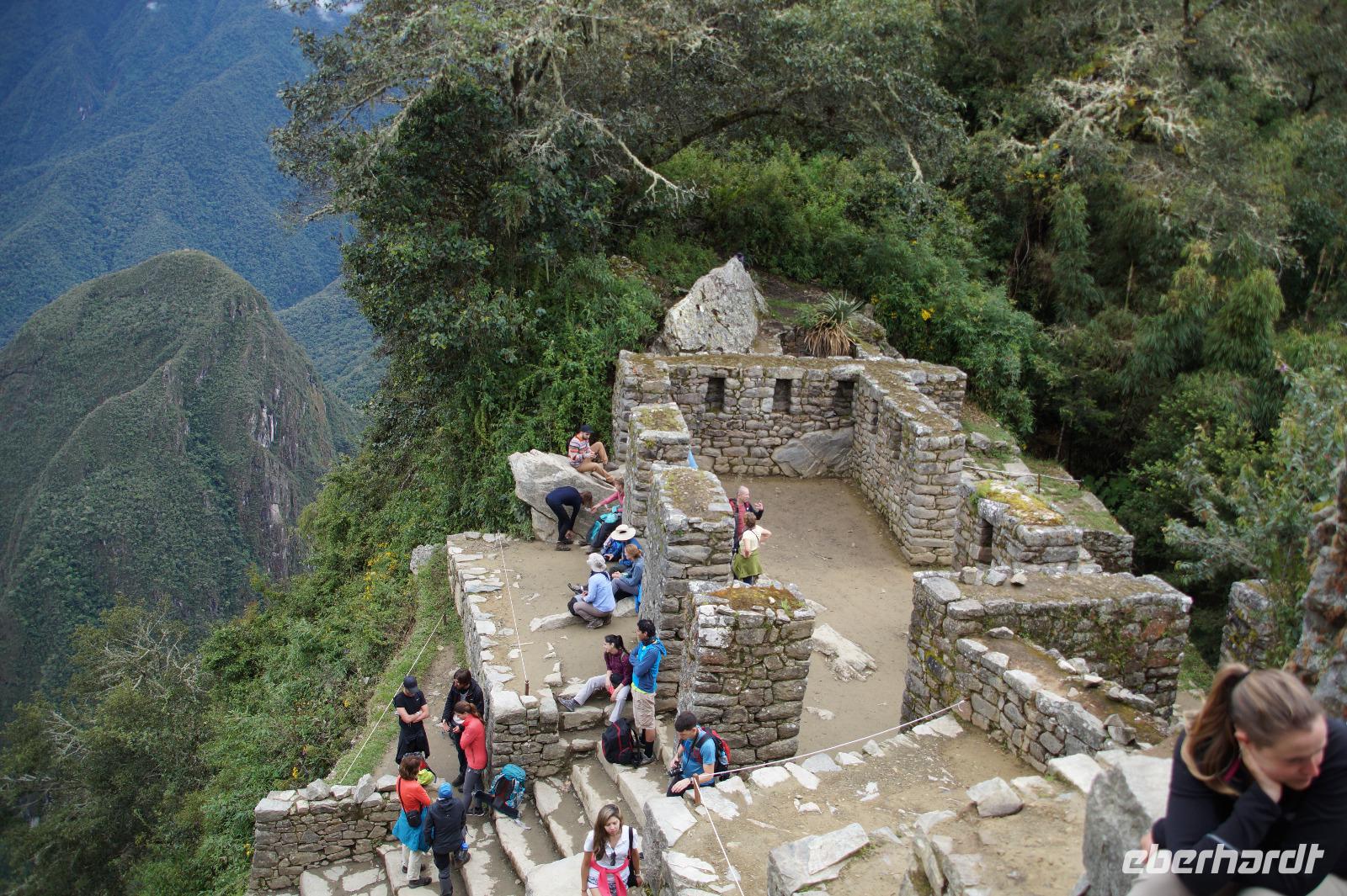 Zunächst bleibt unser kleiner Trupp noch zusammen, aber dann fasert es sich immer weiter aus. Unser Ziel ist Inti Punku, das Sonnentor. Sieht gar nicht so weit aus bis dorthin, aber man benötigt dann doch leicht vierzig Minuten. Ich bin nicht sicher, dass wir alle sechs dort waren, aber zumindest fünf von uns haben es bis dorthin geschafft. Ein Wächter der dort steht verrät mir, dass, wenn man durch Inti Punku dem Inka Trail noch weiter folgt, man an einen Aussichtpunkt kommt. Zu dritt folgen wir diesem Weg. Wir kommen an eine steile Treppe, wo sich in der Inka-Zeit so etwas wie ein Wachposten befand. Von dort aus sehen wir in einigen Kilometern Entfernung die Inka-Siedlung Winay Wayna, wo sich bei einem Wasserfall ein Wasserheiligtum befindet.