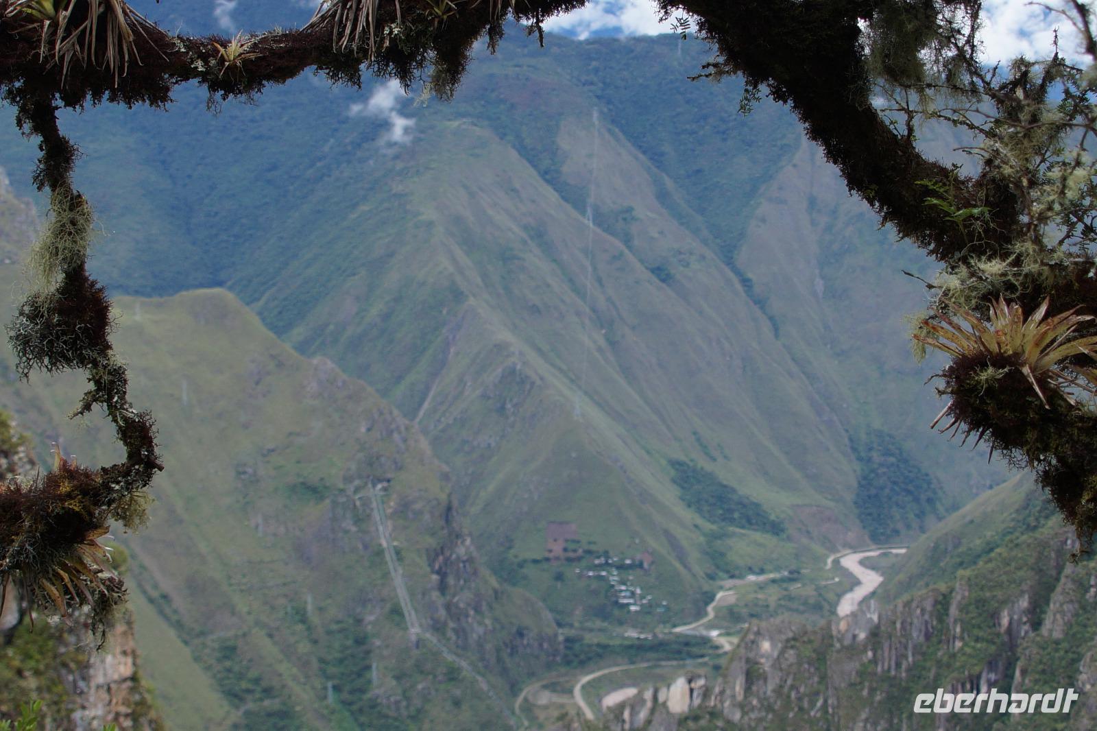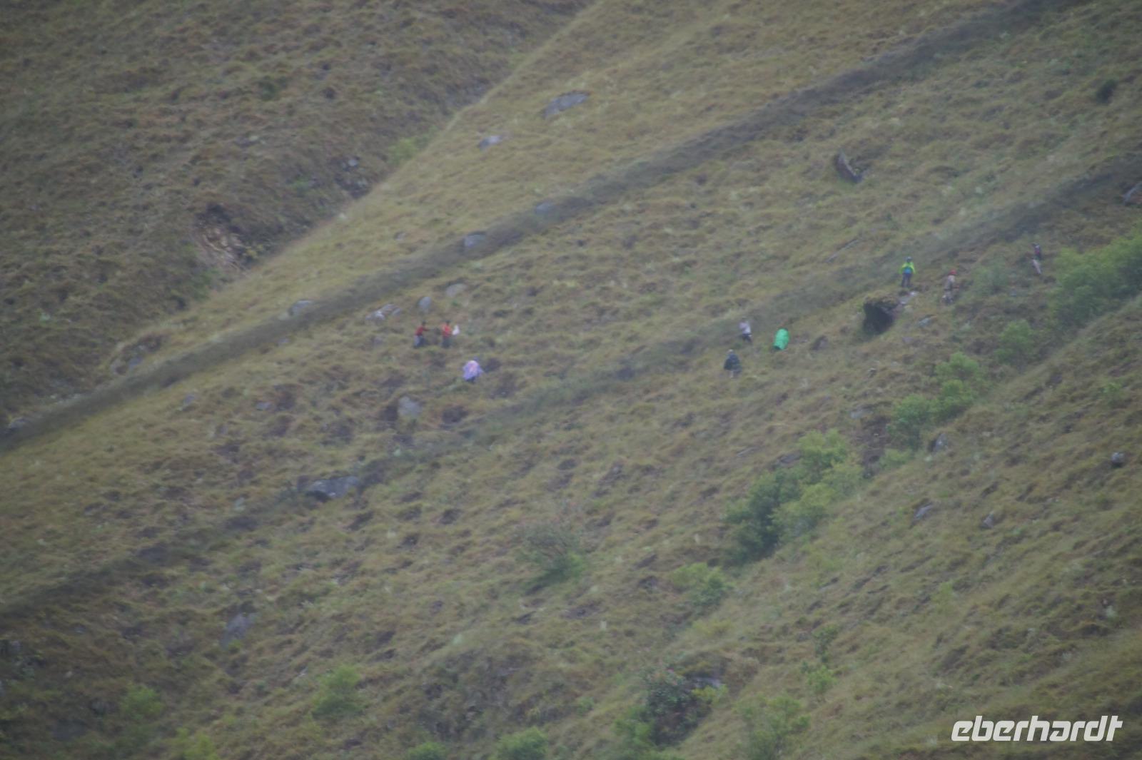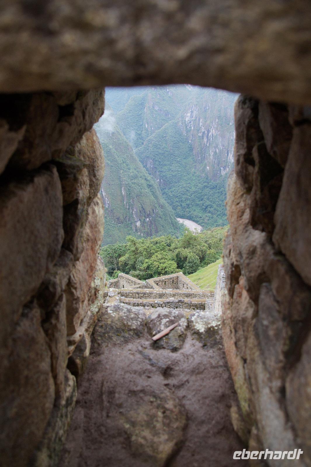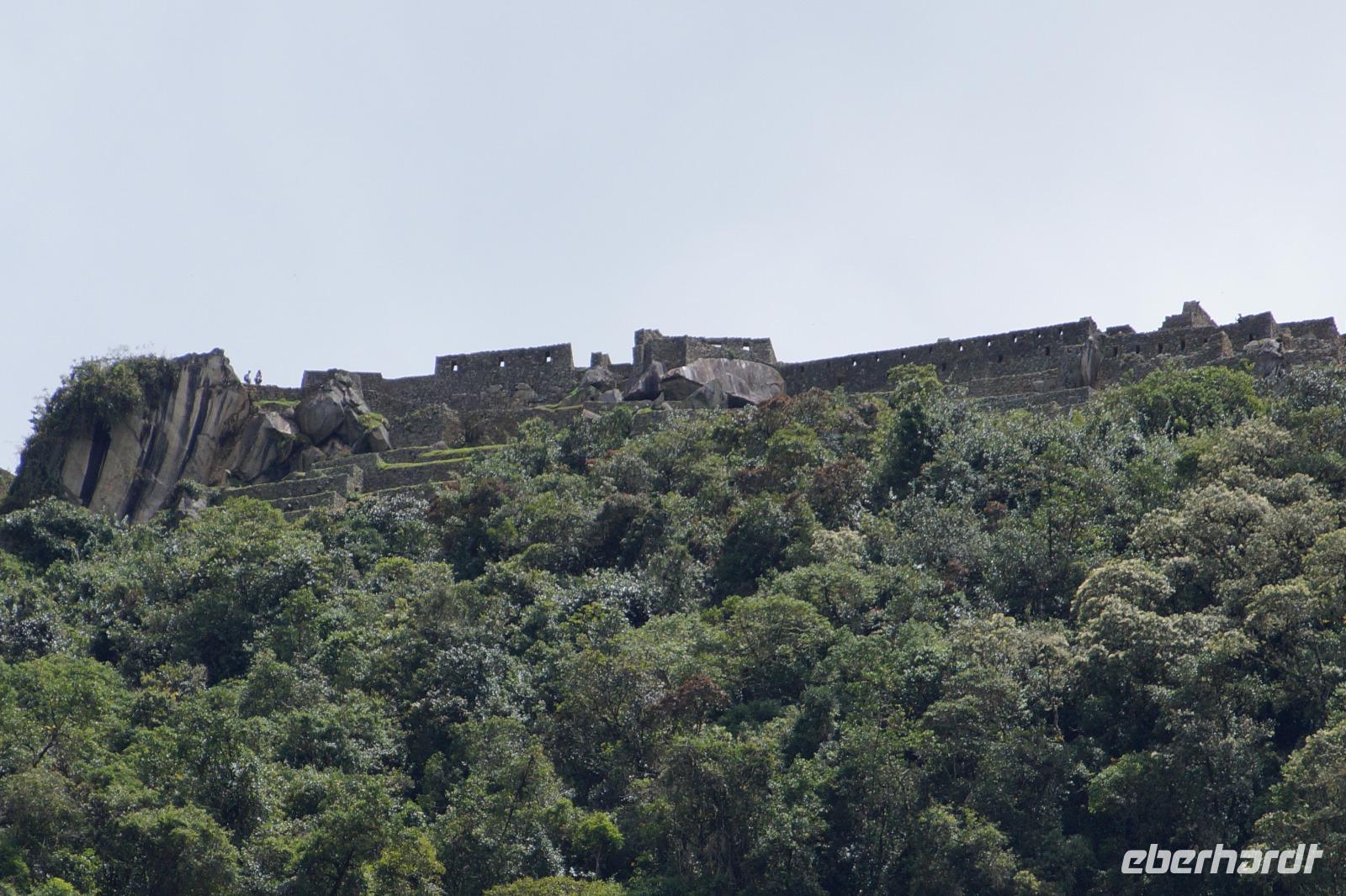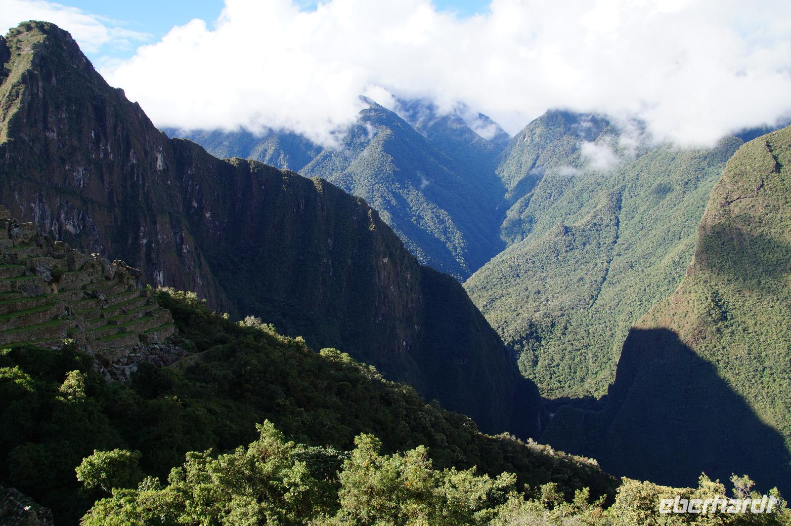 Zunächst bleibt unser kleiner Trupp noch zusammen, aber dann fasert es sich immer weiter aus. Unser Ziel ist Inti Punku, das Sonnentor. Sieht gar nicht so weit aus bis dorthin, aber man benötigt dann doch leicht vierzig Minuten. Ich bin nicht sicher, dass wir alle sechs dort waren, aber zumindest fünf von uns haben es bis dorthin geschafft. Ein Wächter der dort steht verrät mir, dass, wenn man durch Inti Punku dem Inka Trail noch weiter folgt, man an einen Aussichtpunkt kommt. Zu dritt folgen wir diesem Weg. Wir kommen an eine steile Treppe, wo sich in der Inka-Zeit so etwas wie ein Wachposten befand. Von dort aus sehen wir in einigen Kilometern Entfernung die Inka-Siedlung Winay Wayna, wo sich bei einem Wasserfall ein Wasserheiligtum befindet.