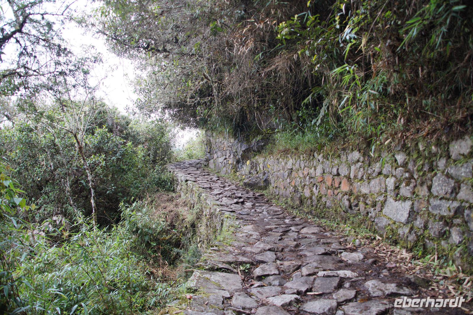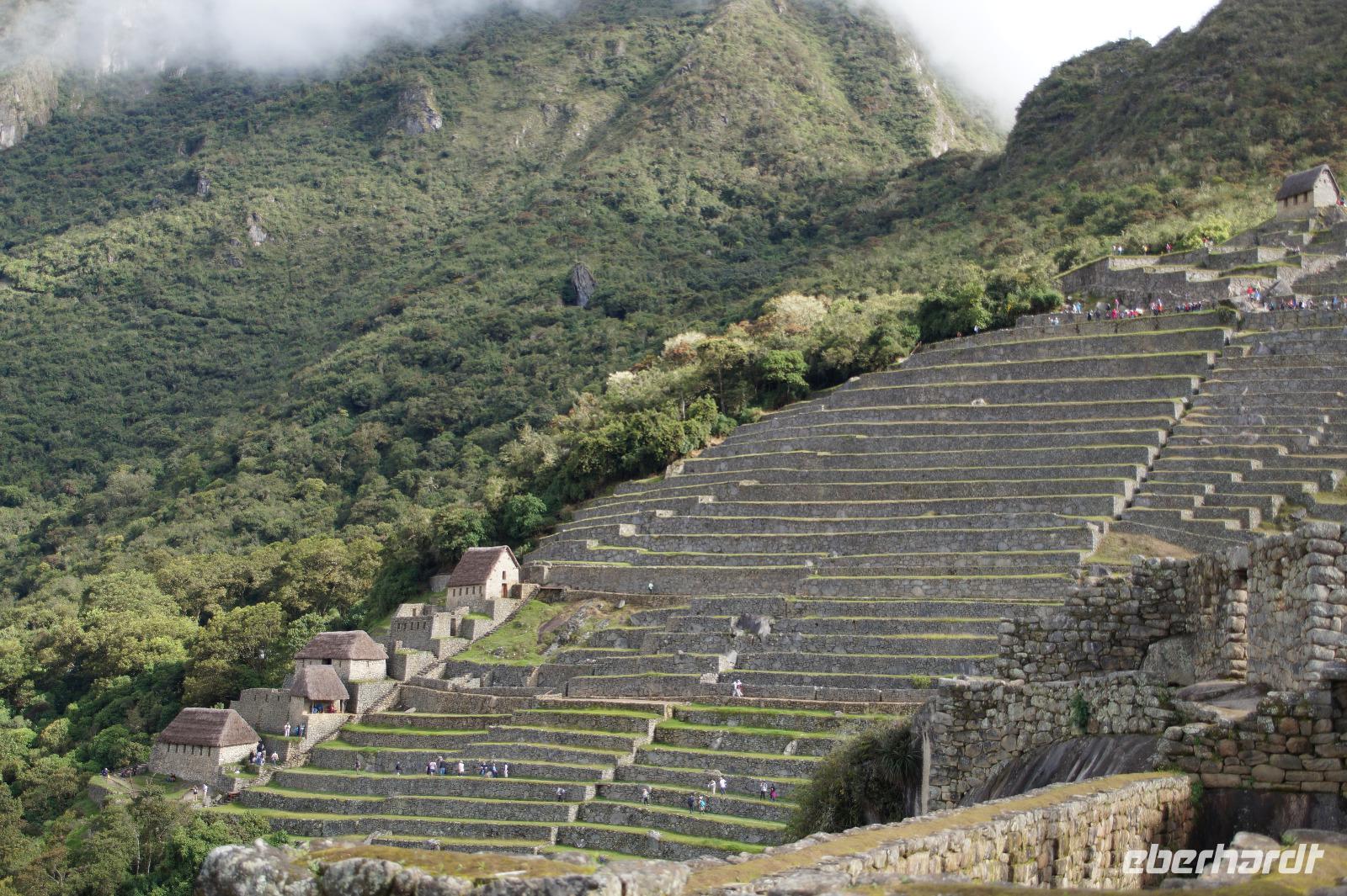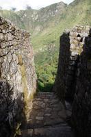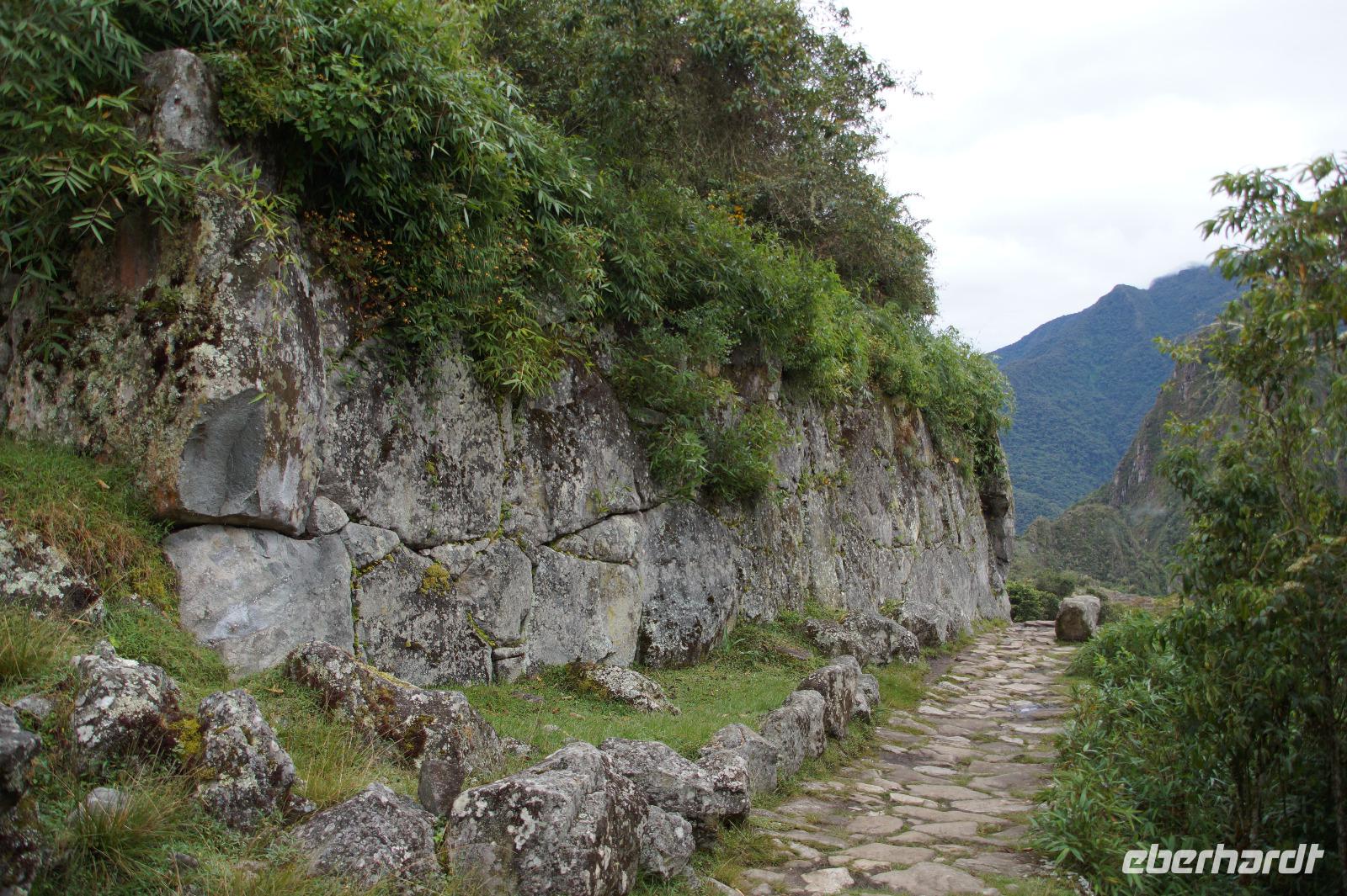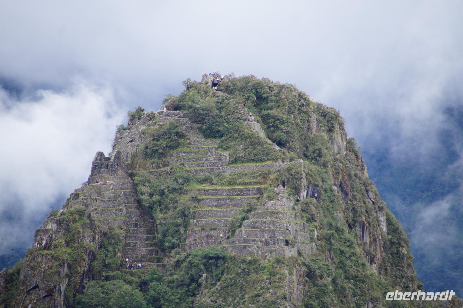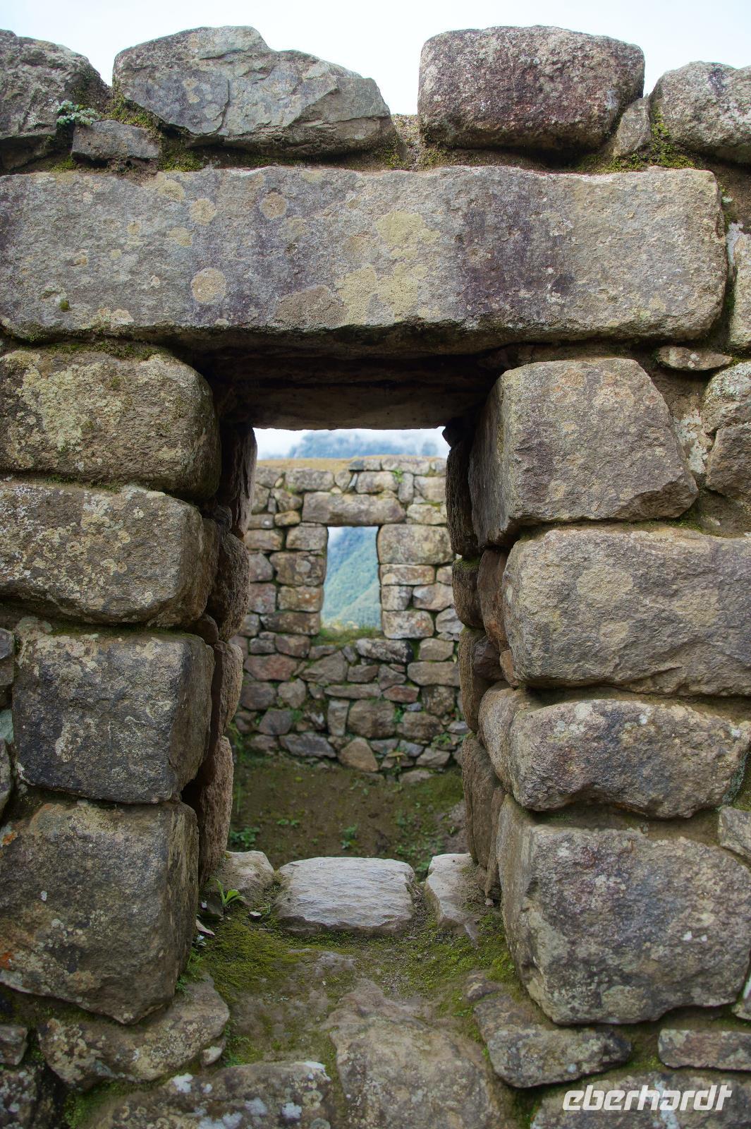 Zunächst bleibt unser kleiner Trupp noch zusammen, aber dann fasert es sich immer weiter aus. Unser Ziel ist Inti Punku, das Sonnentor. Sieht gar nicht so weit aus bis dorthin, aber man benötigt dann doch leicht vierzig Minuten. Ich bin nicht sicher, dass wir alle sechs dort waren, aber zumindest fünf von uns haben es bis dorthin geschafft. Ein Wächter der dort steht verrät mir, dass, wenn man durch Inti Punku dem Inka Trail noch weiter folgt, man an einen Aussichtpunkt kommt. Zu dritt folgen wir diesem Weg. Wir kommen an eine steile Treppe, wo sich in der Inka-Zeit so etwas wie ein Wachposten befand. Von dort aus sehen wir in einigen Kilometern Entfernung die Inka-Siedlung Winay Wayna, wo sich bei einem Wasserfall ein Wasserheiligtum befindet.