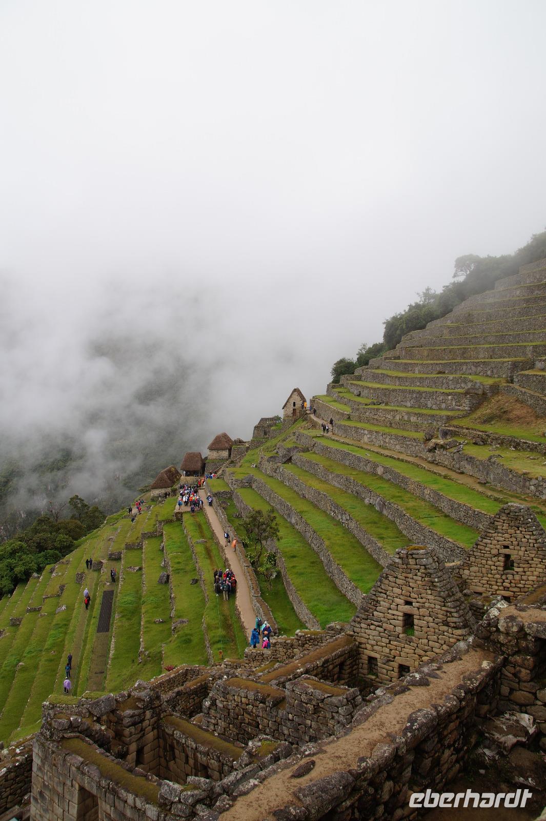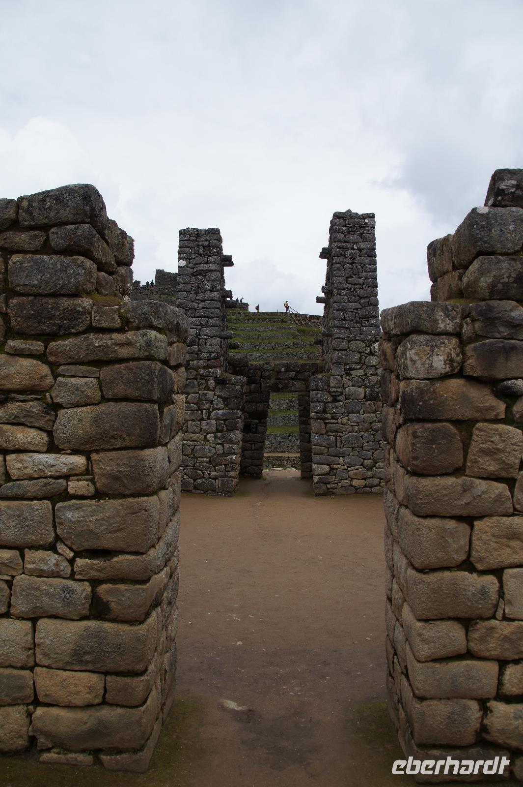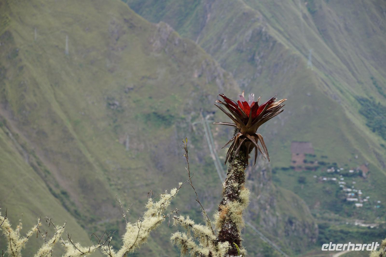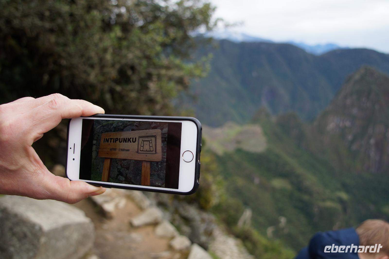 Zunächst bleibt unser kleiner Trupp noch zusammen, aber dann fasert es sich immer weiter aus. Unser Ziel ist Inti Punku, das Sonnentor. Sieht gar nicht so weit aus bis dorthin, aber man benötigt dann doch leicht vierzig Minuten. Ich bin nicht sicher, dass wir alle sechs dort waren, aber zumindest fünf von uns haben es bis dorthin geschafft. Ein Wächter der dort steht verrät mir, dass, wenn man durch Inti Punku dem Inka Trail noch weiter folgt, man an einen Aussichtpunkt kommt. Zu dritt folgen wir diesem Weg. Wir kommen an eine steile Treppe, wo sich in der Inka-Zeit so etwas wie ein Wachposten befand. Von dort aus sehen wir in einigen Kilometern Entfernung die Inka-Siedlung Winay Wayna, wo sich bei einem Wasserfall ein Wasserheiligtum befindet.