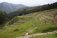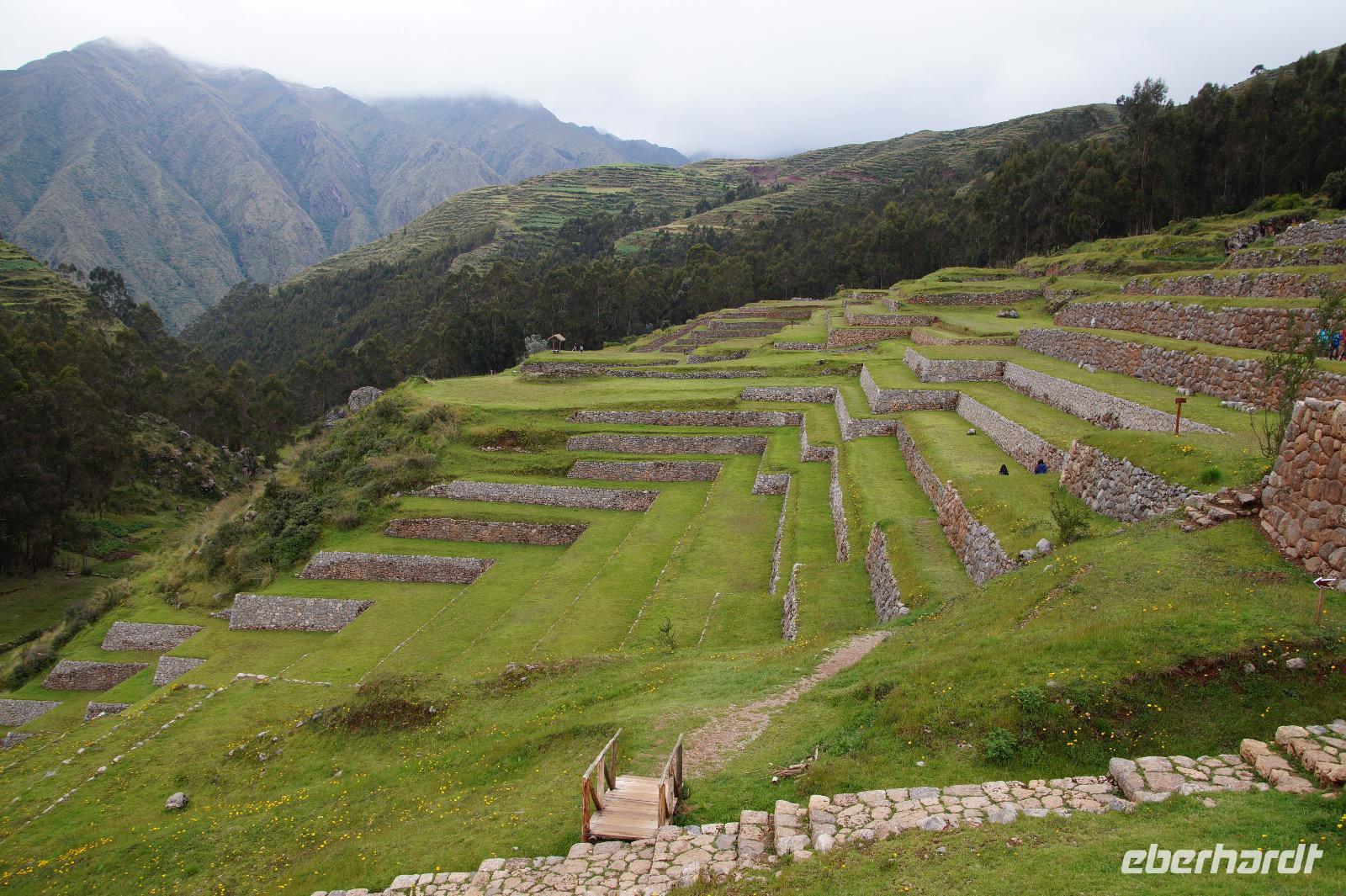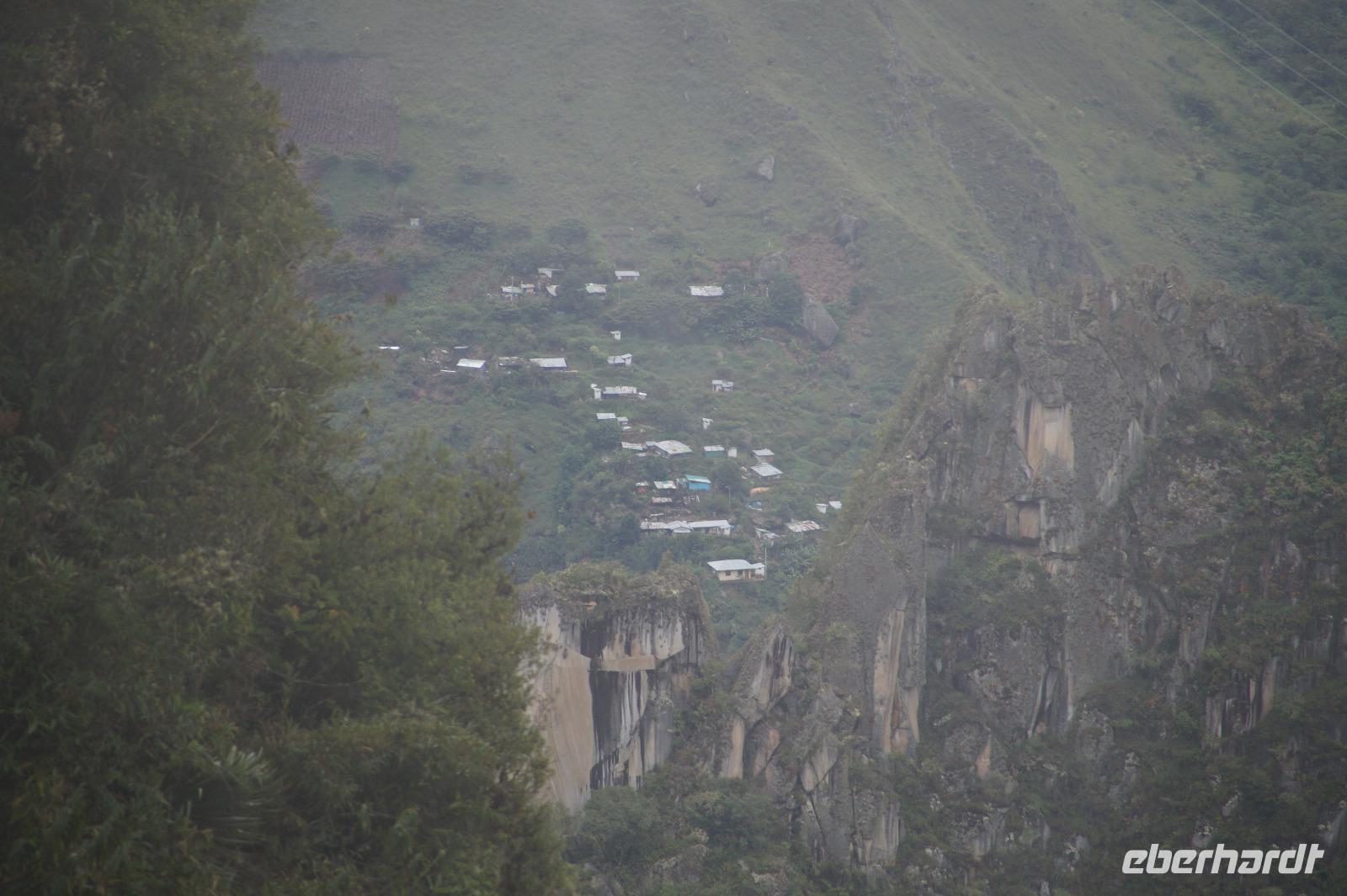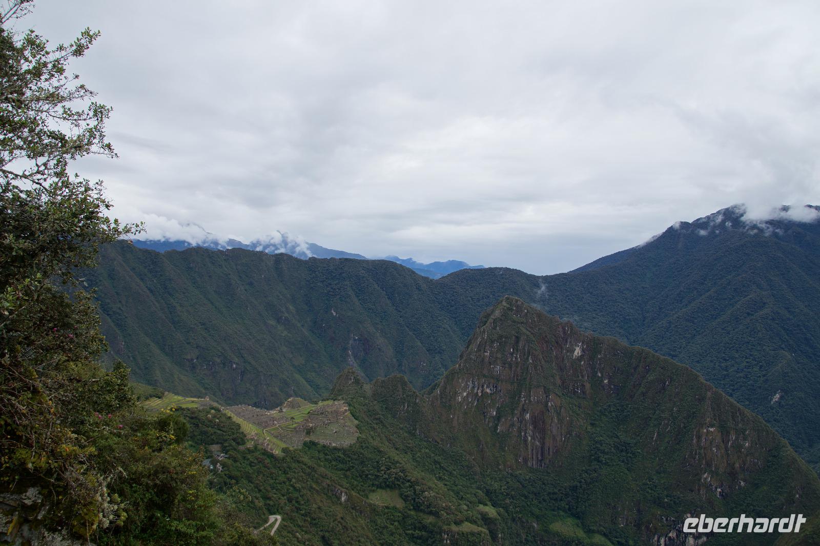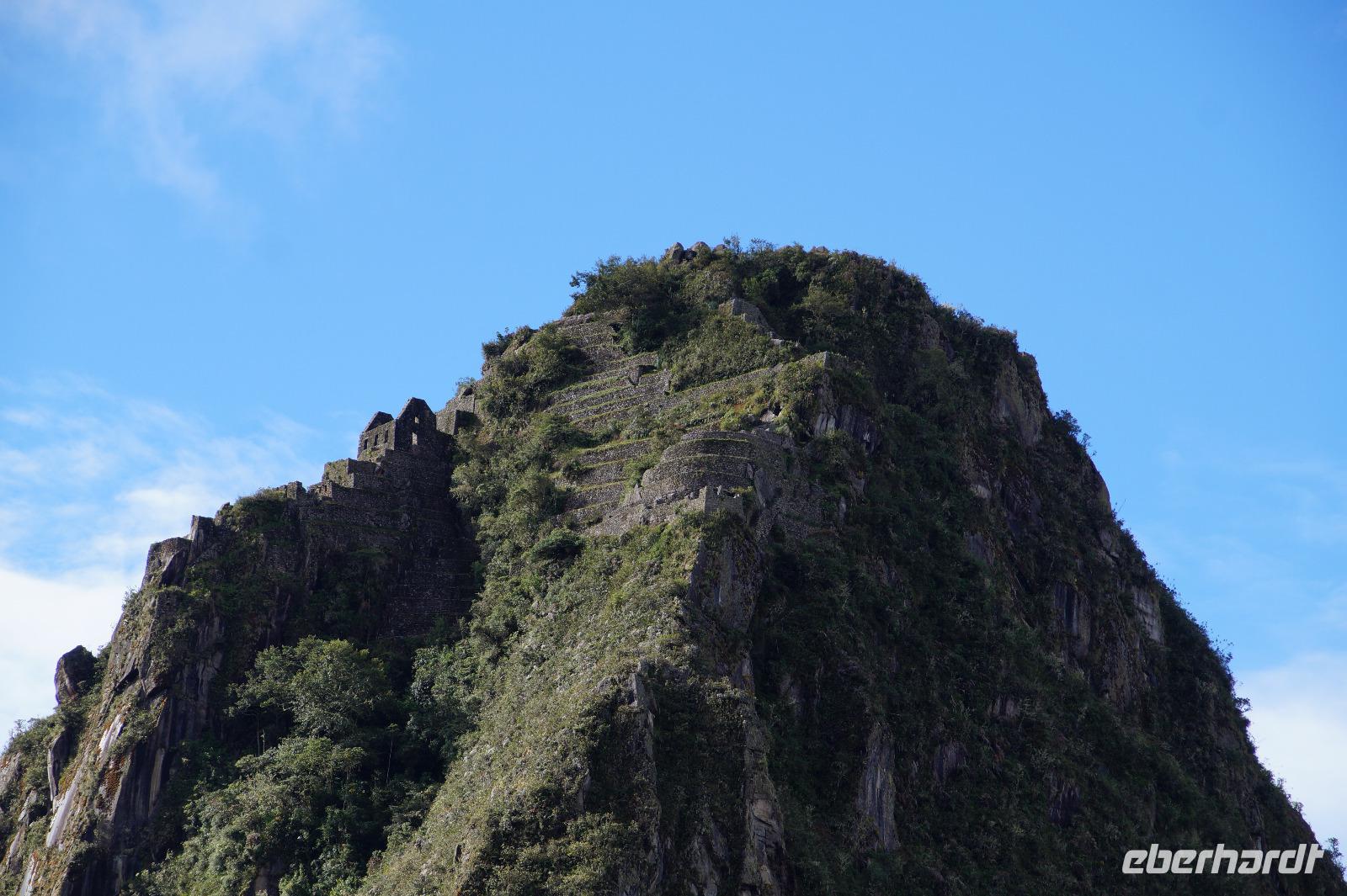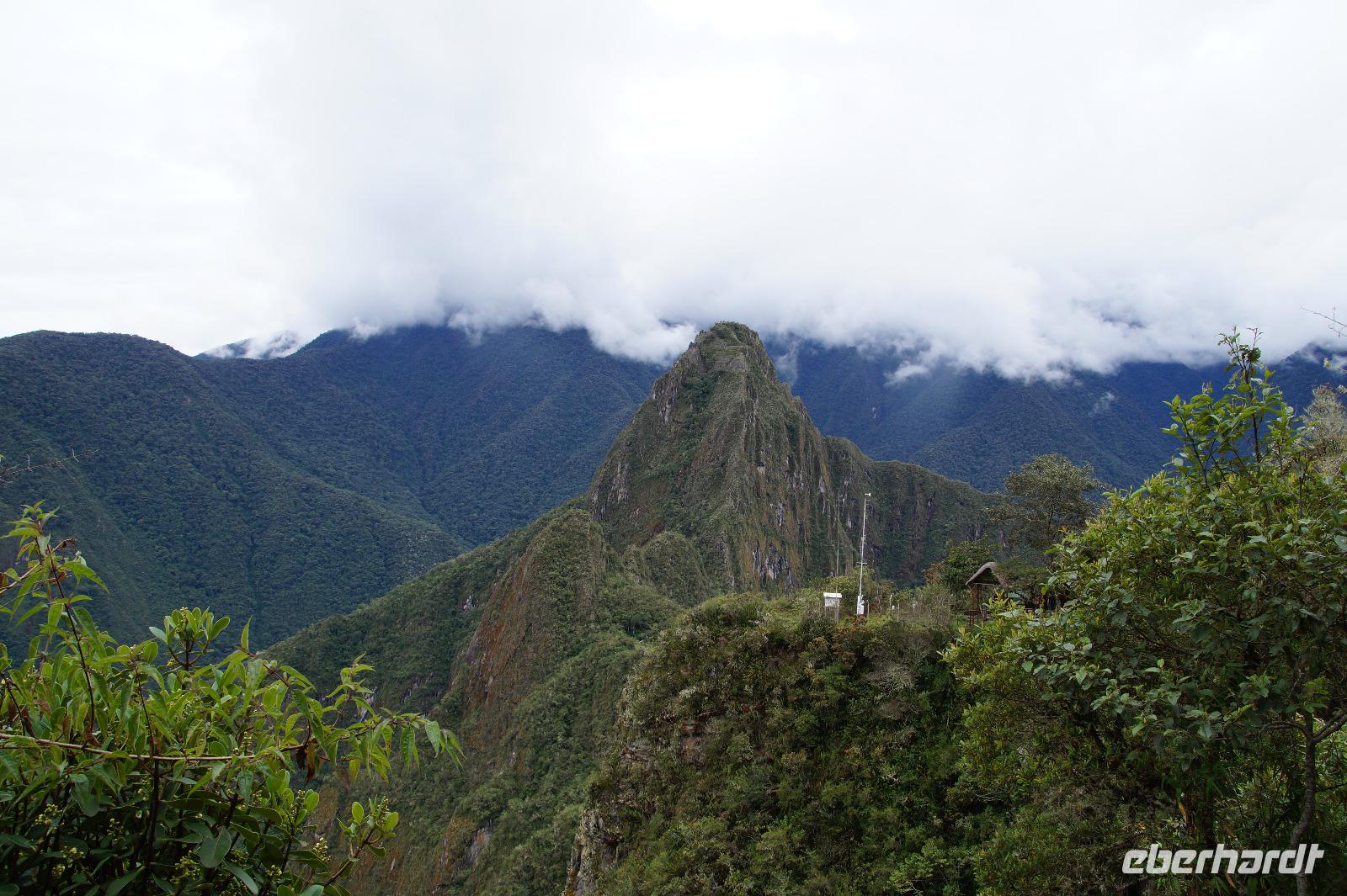 Zunächst bleibt unser kleiner Trupp noch zusammen, aber dann fasert es sich immer weiter aus. Unser Ziel ist Inti Punku, das Sonnentor. Sieht gar nicht so weit aus bis dorthin, aber man benötigt dann doch leicht vierzig Minuten. Ich bin nicht sicher, dass wir alle sechs dort waren, aber zumindest fünf von uns haben es bis dorthin geschafft. Ein Wächter der dort steht verrät mir, dass, wenn man durch Inti Punku dem Inka Trail noch weiter folgt, man an einen Aussichtpunkt kommt. Zu dritt folgen wir diesem Weg. Wir kommen an eine steile Treppe, wo sich in der Inka-Zeit so etwas wie ein Wachposten befand. Von dort aus sehen wir in einigen Kilometern Entfernung die Inka-Siedlung Winay Wayna, wo sich bei einem Wasserfall ein Wasserheiligtum befindet.