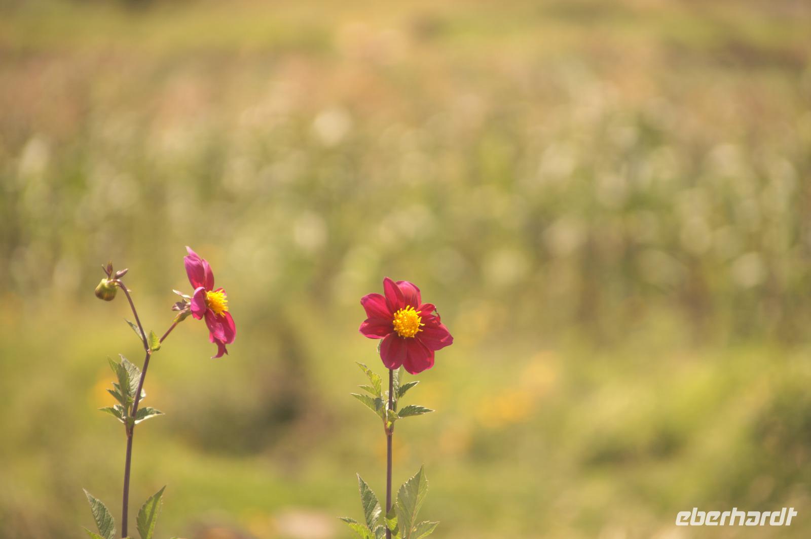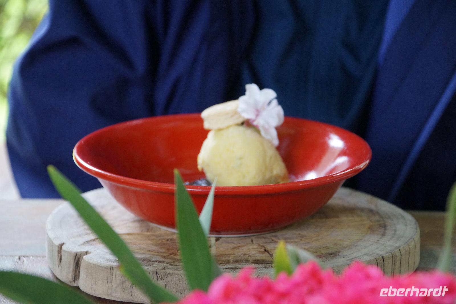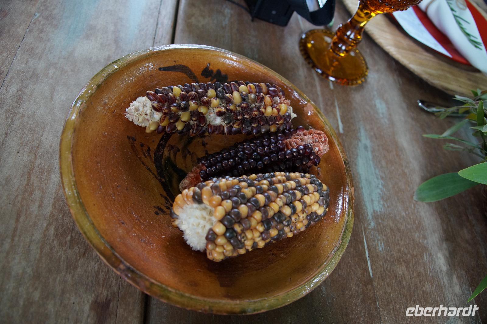 Zum Nachtisch vernaschen wir die drei Schwestern. Im präkolumbinen Amerika war es üblich, Mais nicht als Monokultur zu pflanzen, sondern kombiniert mit Bohnen und Kürbissen. Mais, Bohnen und Kürbis, das sind die drei Schwestern. Das hatte den Vorteil, dass die Bohnen den Mais als Rankhilfe benutzen konnten. Gleichzeitig entzog der Mais dem Boden Stickstoff und die Bohnen reicherten ihrerseits wieder Stickstoff aus der Luft an, der in den Boden weitergeleitet wurde. Die Kürbisse, ihrerseits durch den Mais vor direkter Sonneneinstrahlung geschützt, bedeckten mit ihren großen Blättern den Boden und schützten ihn so vor dem Prasseln des direkten Regens auf der einen und dem Austrocknen durch die äquatoriale Sonne auf der andere Seite. Im Nachtisch waren die dickste Schwester zum Kürbiseis verarbeitet, die umhüllteste Schwester zum Maiskeks und die rankeste Schwester zur Bohnensauce. Hört sich schräg an, ist aber lecker!