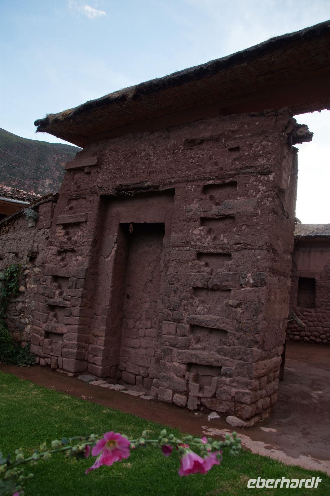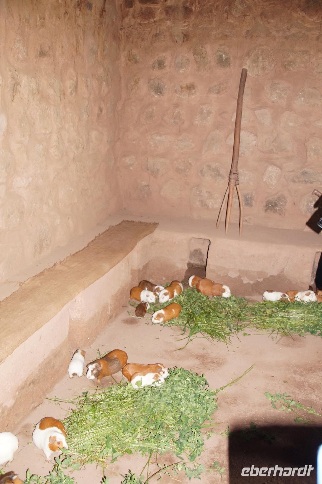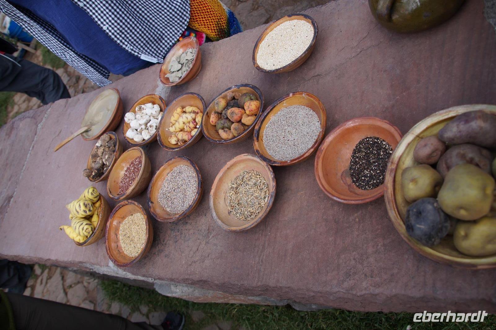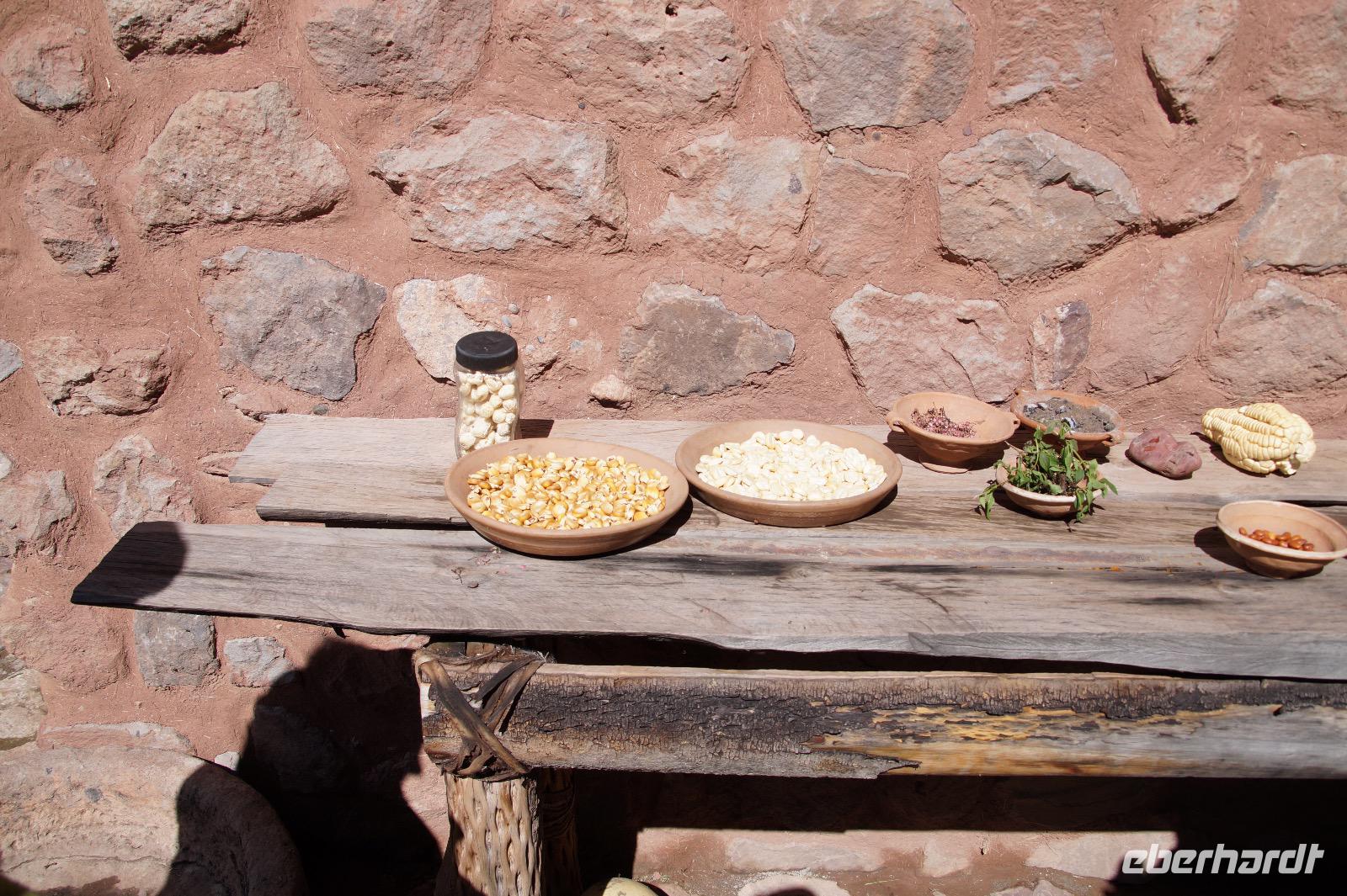 Nach dem Essen erfahren wir dann noch etwas über Meerschweinchenhaltung, Maisanbau und -düngung und dergleichen mehr. So soll z.B. ein Gemisch von Quinoaasche und zerriebenen Kolumbuspfeffer (Traube und Blätter) ein gutes Düngemittel für Mais sein und würde gemeinsam mit dem Samenkorn in den Erdboden eingebracht.In einem kleinen haciendaeigenen Museum sehen wir dann noch Votivgaben, wie hölzerne oder steinerne Maiskolben, welche man rituell niedergelegte, um von Pachamama z.B. Ernteglück zu erbitten.