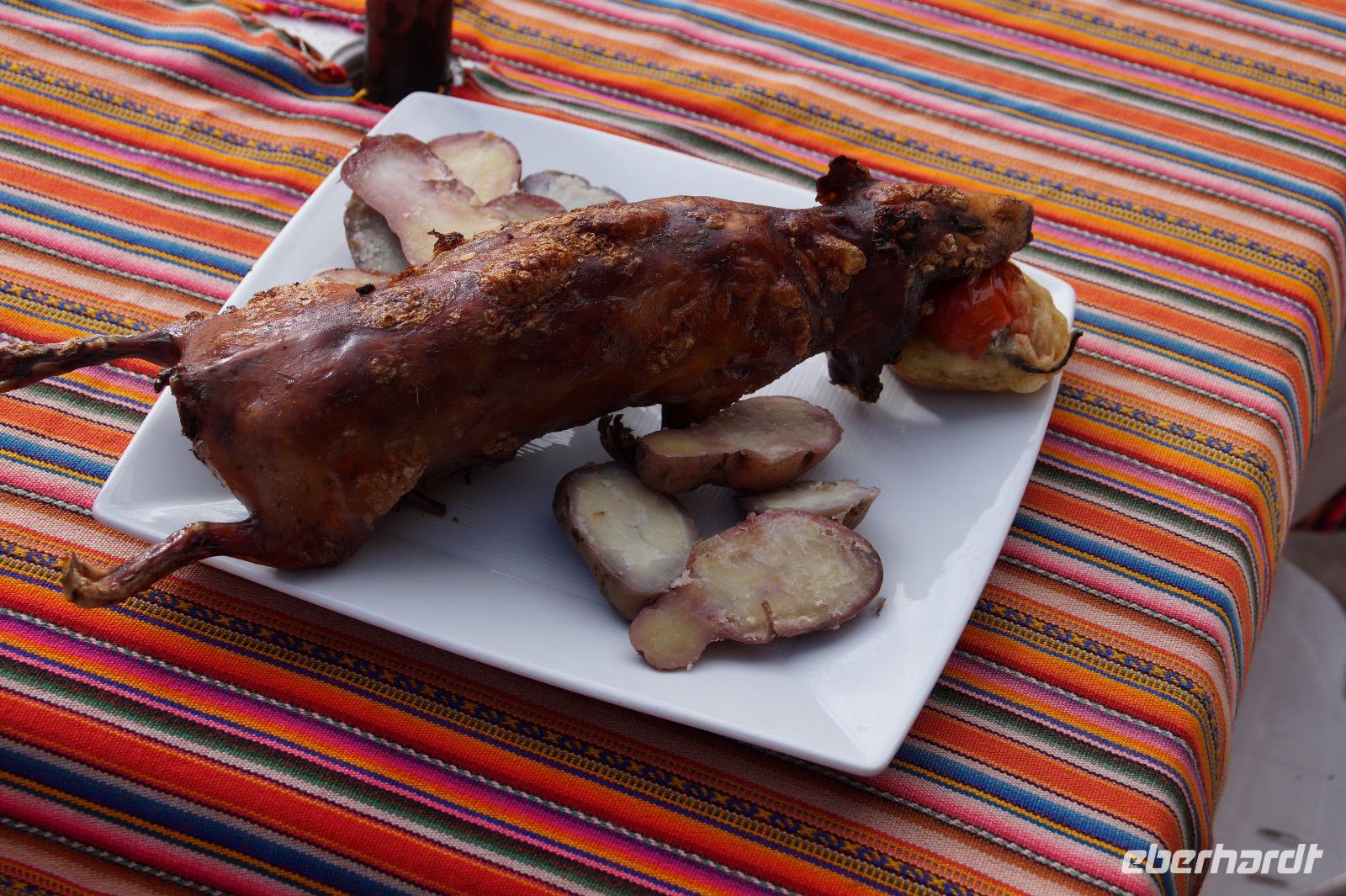 Der Hauptgang wird für alle Alpaca. Alternativen wären Forelle oder Hühnchen gewesen, aber alle wollen Alpaca probieren. Dazu gibt es Gemüse, u.a. auch die in Dtld. unbekannte Ollucoknolle. Dazu einige Granatapfelkerne und Saúcosauce. In Spanien ist Saúco Holunder, aber ob das ebenso für Perú gilt?