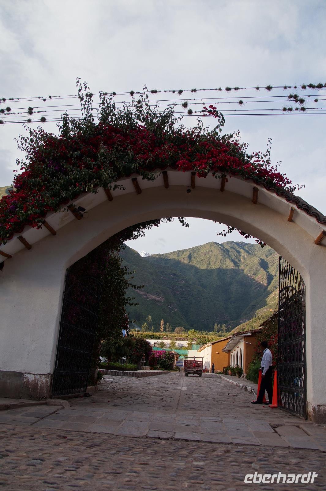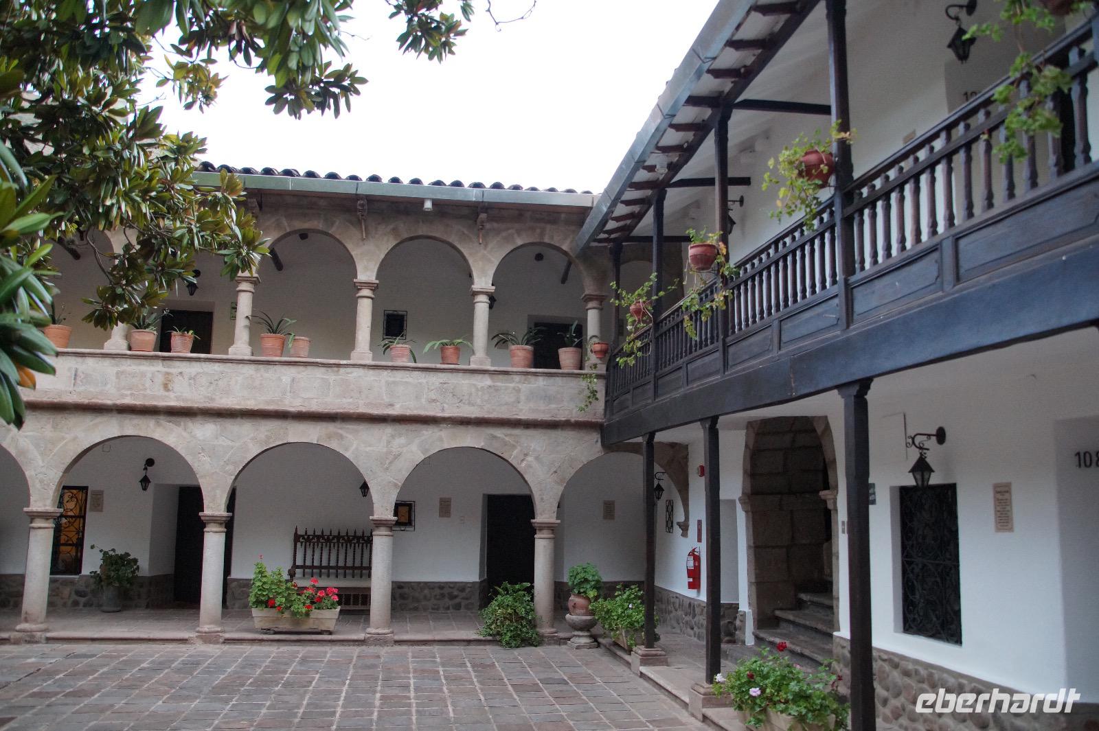 In Cuzco sind die Temperaturen erheblich milder. Das machen die 3.200 m Höhenunterschied. Puerto Maldonado liegt auf etwa 180 Metern NN, Cuzco auf 3.400 Metern NN. Urubamba im Valle Sagrado de los Incas (Heiliges Tal der Inkas) heißt unser Ziel. Zunächst geht es von der alten Inkahauptstadt Cuzco noch ein wenig bergan, bis etwa Poroy, dann biegen wir in Richtung des Valle Sagrado de los Incas (das Heilige Tal der Inkas) ab und fahren an Chinchero und Aylla Racchy, wo wir unterhalb einiger Speicherbauten inkaischer Provinienz einen Fotostopp machen, vorbei. Von hier aus (ca. 3.500 m NN) hat man einen tollen Blick auf das Valle Sagrado (etwa 2.870 m NN).Wir fahren kurz durch Urubamba - so heißt auch das Heilige Tal und der Fluß ändert hier auch seinen Namen von Vilcanota nach Urubamba - nach Yucay, wo wir in einem ehemaligen Kloster untergebracht sind. In der Sonesta Posada del Inca, der Rast des Inka. An dieser Stelle muss man vielleicht eine kleine Begriffserklärung anbringen. Wenn wir von Inkas reden (und das geht den Peruanern nicht anders) dann meinen wir meist das ganze Volk. Dabei ist der Inka oder Inca eigentlich der Herrschertitel. Die Frau des Inca war die Coya („Königin“) und die ersten Konquistadoren, die ohne Frauen ins Land gekommen waren, nahmen sich gerne, um ihre Herrschaft nicht nur durch Eroberung zu legitimieren, eine Ñusta („Prinzessin“) zur Frau.