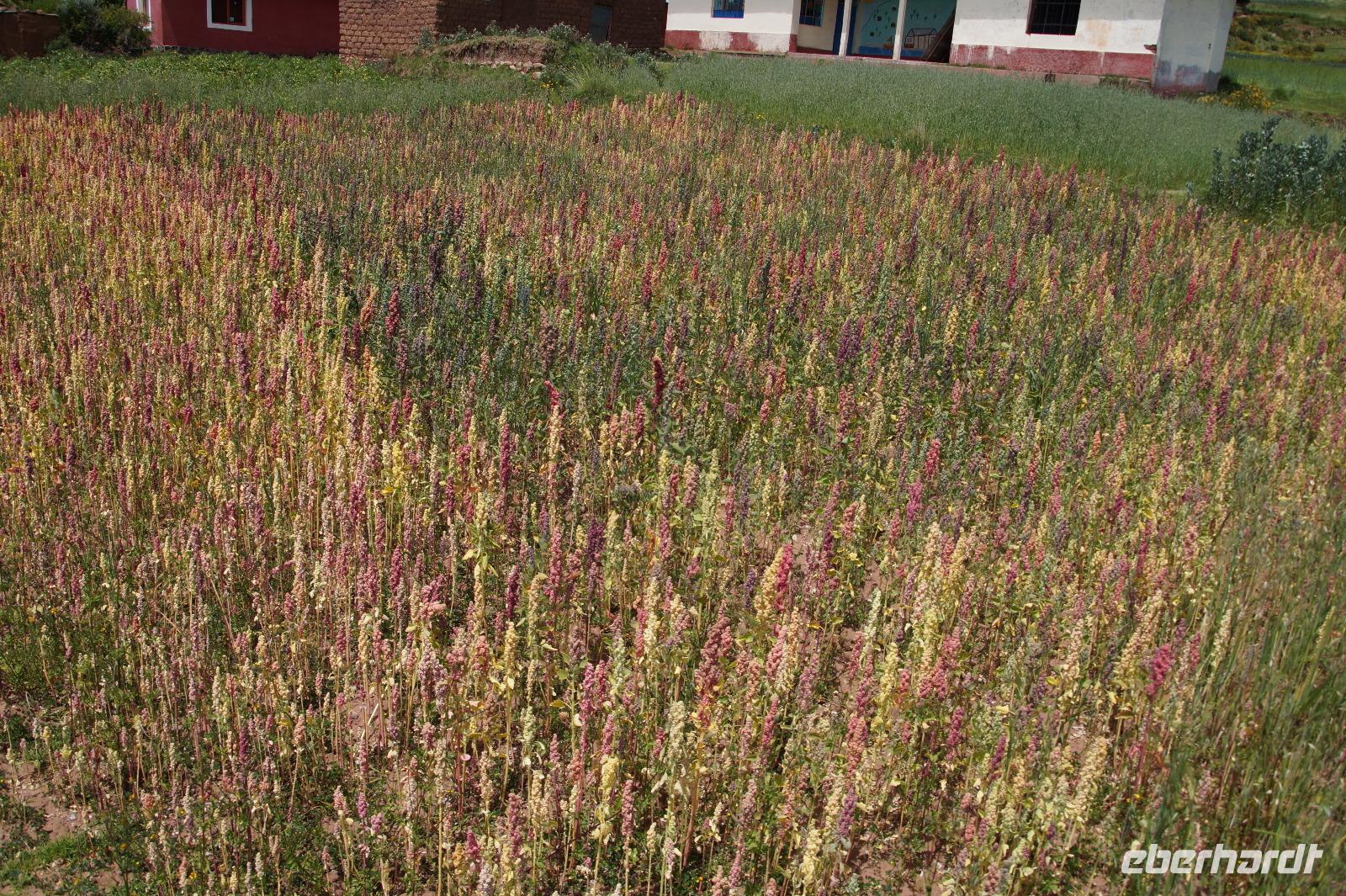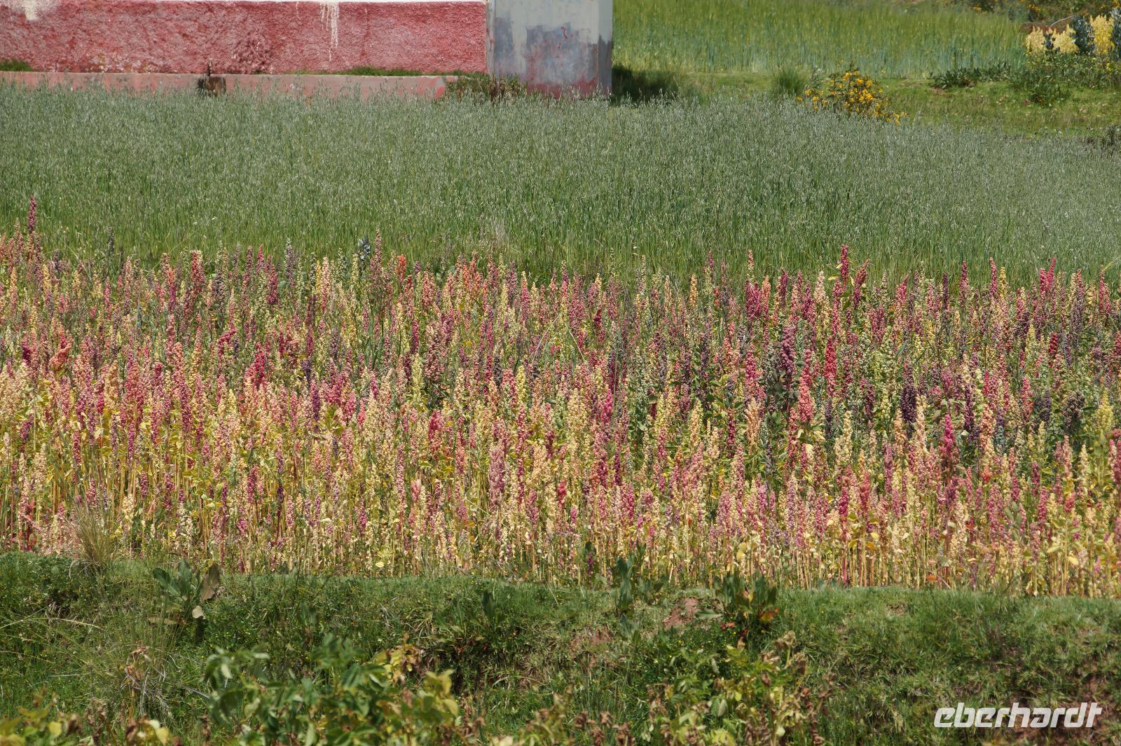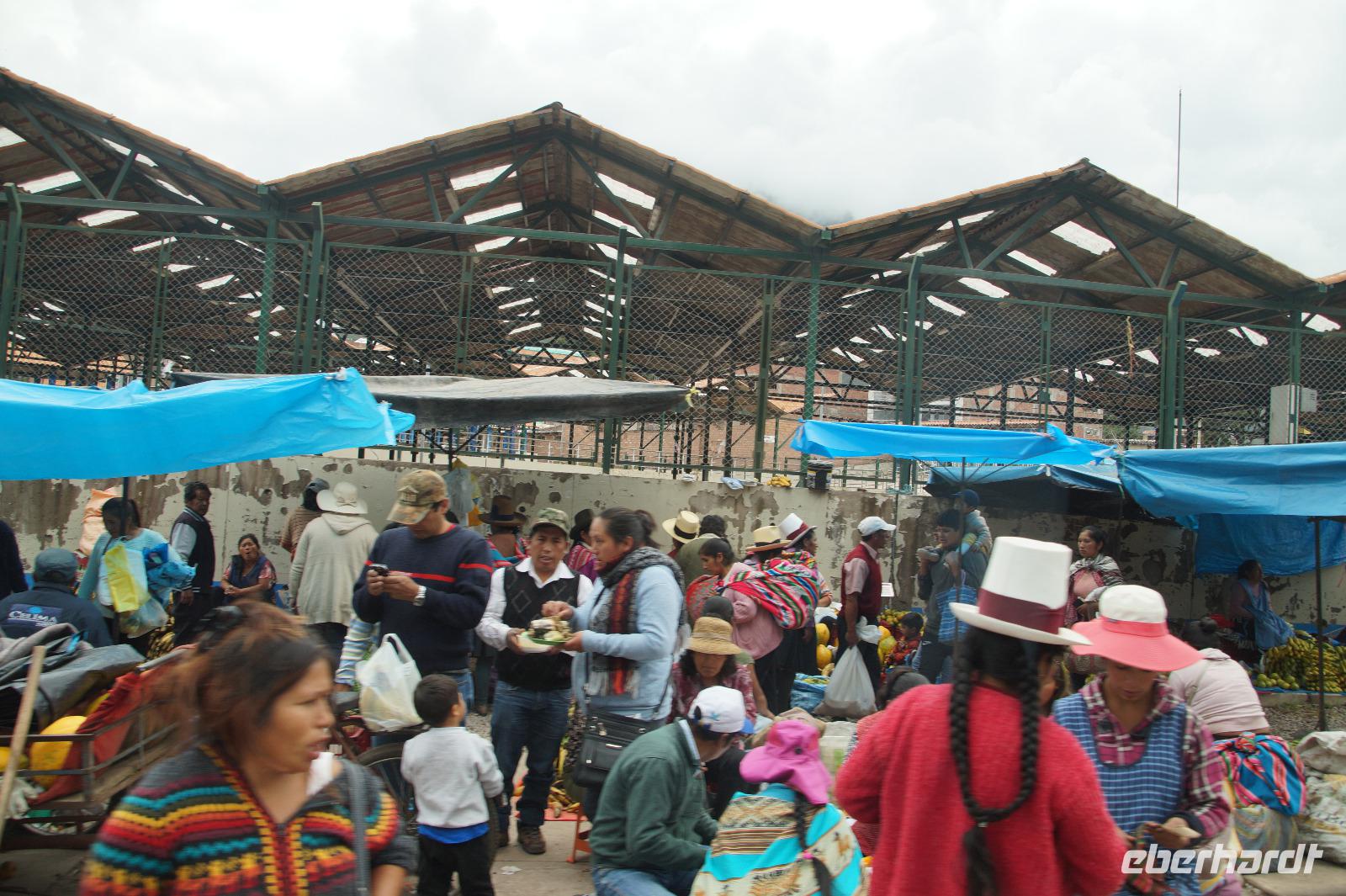 Zunächst begehen wir also die Ruinen von Chinchero, sehen das feine Inkamauerwerk der Terrassierung, einige Opferplattformen, die wohl Sonne, Mond oder einem verschneiten Gipfel galten. Auf dem Hauptplatz, verrät uns Mijaíl, würden die Bauern immer noch im Winter ihre Kartoffeln gefriertrocknen. Über Nacht würden Sie frieren und tagsüber wieder auftauen, dann würden sie leicht gepresst, damit die Feuchtigkeit austrete; das ganze über einige Wochen, danach seien die Kartoffeln unendlich lange haltbar, sicher 30 oder 40 Jahre. Als wir zur Kirche kommen, sitzen einige Einheimische vorm Eingang, ein Bediensteter erklärt uns, heute würde Hochzeit gefeiert, aber wir dürften noch reingehen. Wir gehen also rein und sind noch gar nicht lange drinnen, als 25 Hochzeitspaare, z.T. mit ihren Kindern, nebst Verwandten in die Kirche strömen. Wo kommen die plötzlich alle her? Der Platz der Kirche war doch bis auf acht bis zehn Alte im Eingang leer? Wir jedenfalls stehen jetzt definitiv im Weg, können die Kirche aber auch nicht verlassen. Mijaíl nimmt sich einen Wachmann zur Hilfe, der uns einen Weg nach draußen bahnt, dass wir die Feier nicht weiter stören. Aber 25 Hochzeitspaare und zum Teil mit Kindern? Ja. Dazu muss man zwei Dinge berücksichtigen: Nicht jede der Hochzeiten war eine eigentliche Hochzeit, manche waren auch „nur“ eine Erneuerung des Ehegelübtes. Auf der anderen Seite, Katholizismus hin oder her, ist es in dieser Region der Anden üblich, es mit Schiller zu halten: „Drum prüfe, wer sich ewig bindet, Ob sich das Herz zum Herzen findet.“ Es gibt hier die Ehe auch Probe, man zieht zusammen, lebt wie ein Ehepaar und entscheidet nach drei Jahren - uneingedenk der mittlerweile gezeugten Kinder - ob das was Dauerhaftes bleiben sollte oder ob Mann sich besser etwas anderes sucht. Die Kröte an der Geschichte haben die Frauen - sollten sie in den drei Jahren Mutter geworden sein - zu schlucken: Als Mutter findet man i.d.R. keinen neuen Mann.