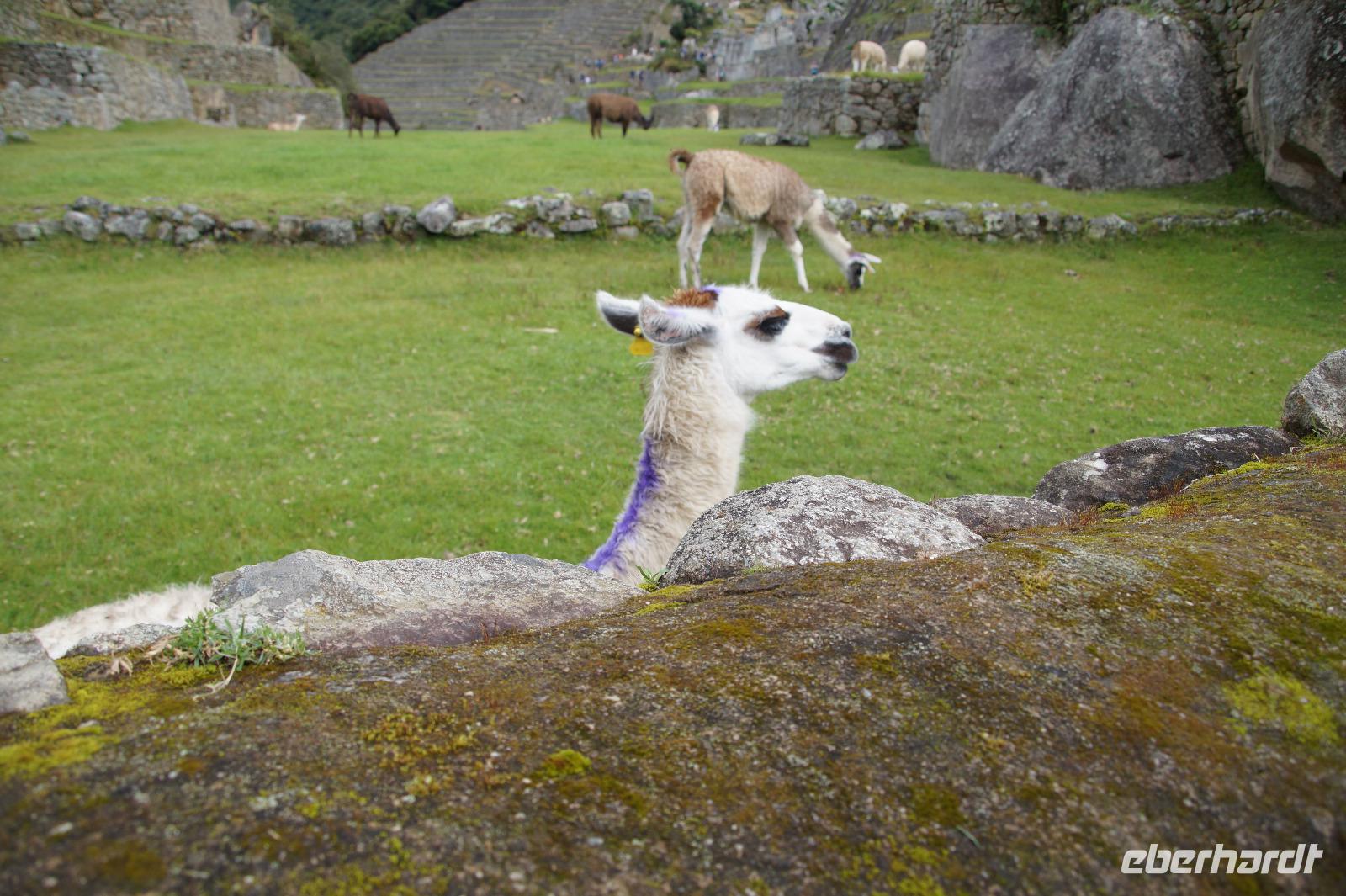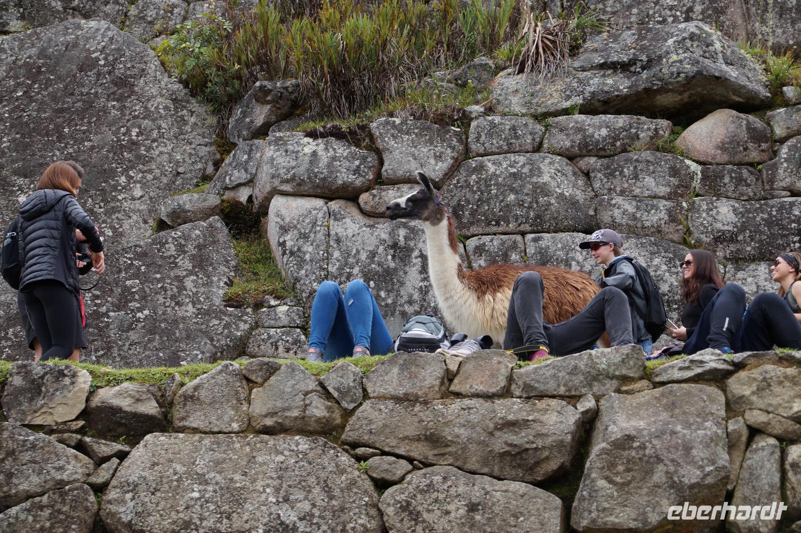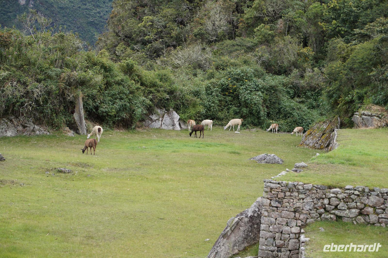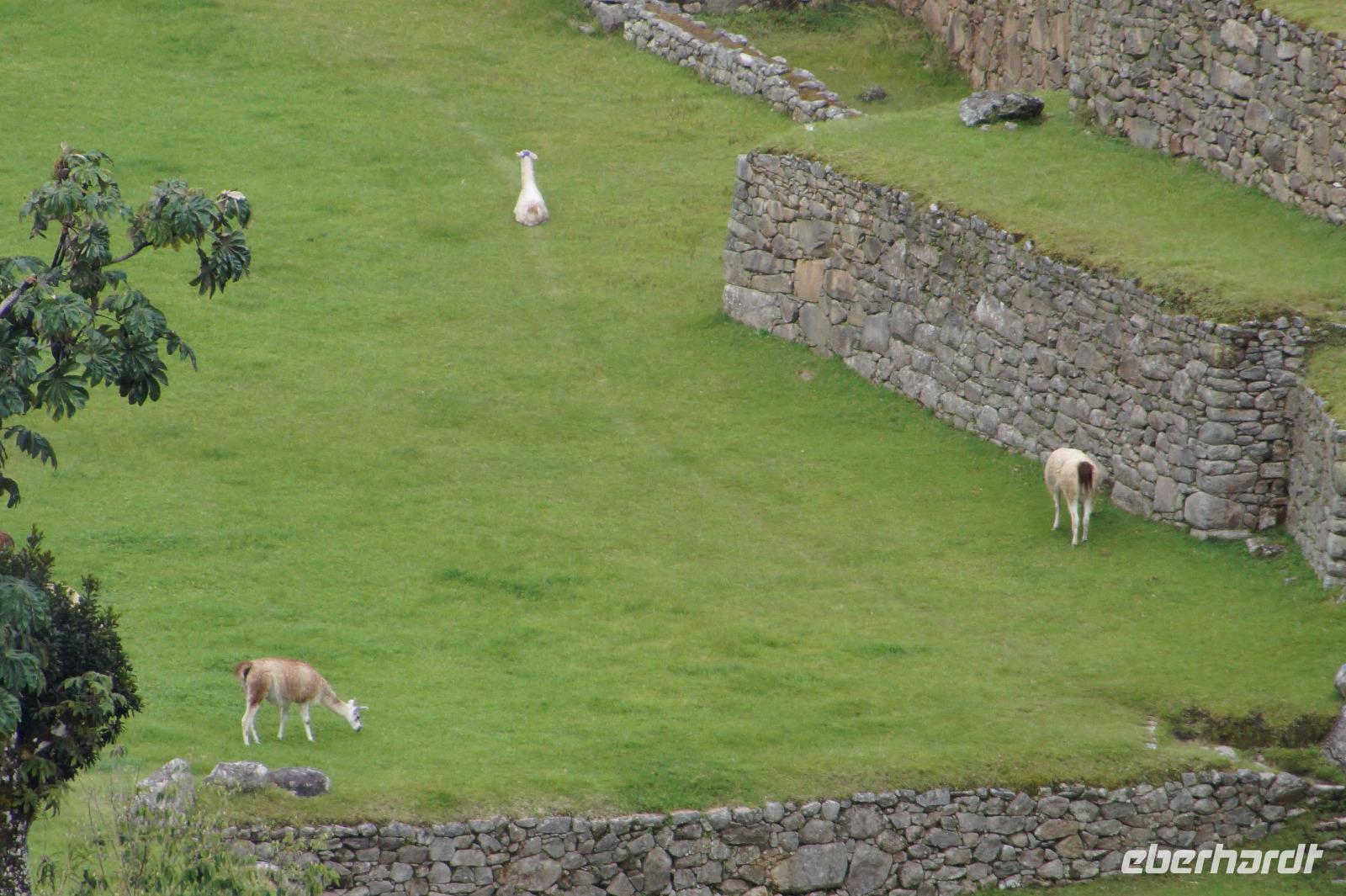 Mijaíl führt uns zunächst an den "Kühlschränken" vorbei zum sogenannten "Wächterhäuschen. Von hier aus hat man einen tollen Überblick über die Kernanlage und Mijaíl kann uns das Gelände und auch ihre Planung, wie sie mit uns Machu Picchu erfassbar machen will, erklären. Für das Rasenmähen sind in Machu Picchu im Übrigen einige Regierungslamas zuständig. Lamas und Alpacas eben zwar normalerweise im Altiplano und ernähren sich vom Ichugras, welches hier unten im Nebelwald nicht wächst, aber sie scheinen sich - abgesehen von den nervigen Touristen - hier ganz wohl zu fühlen. Die Regierung spart sich den Rasenmäher, Touristen und Natur den unvermeidlichen Lärm und die Touristen haben ein Fotomotiv mehr. Ob die Lamas das auch als Win-Win-Situation begreifen, ist nicht bekannt.