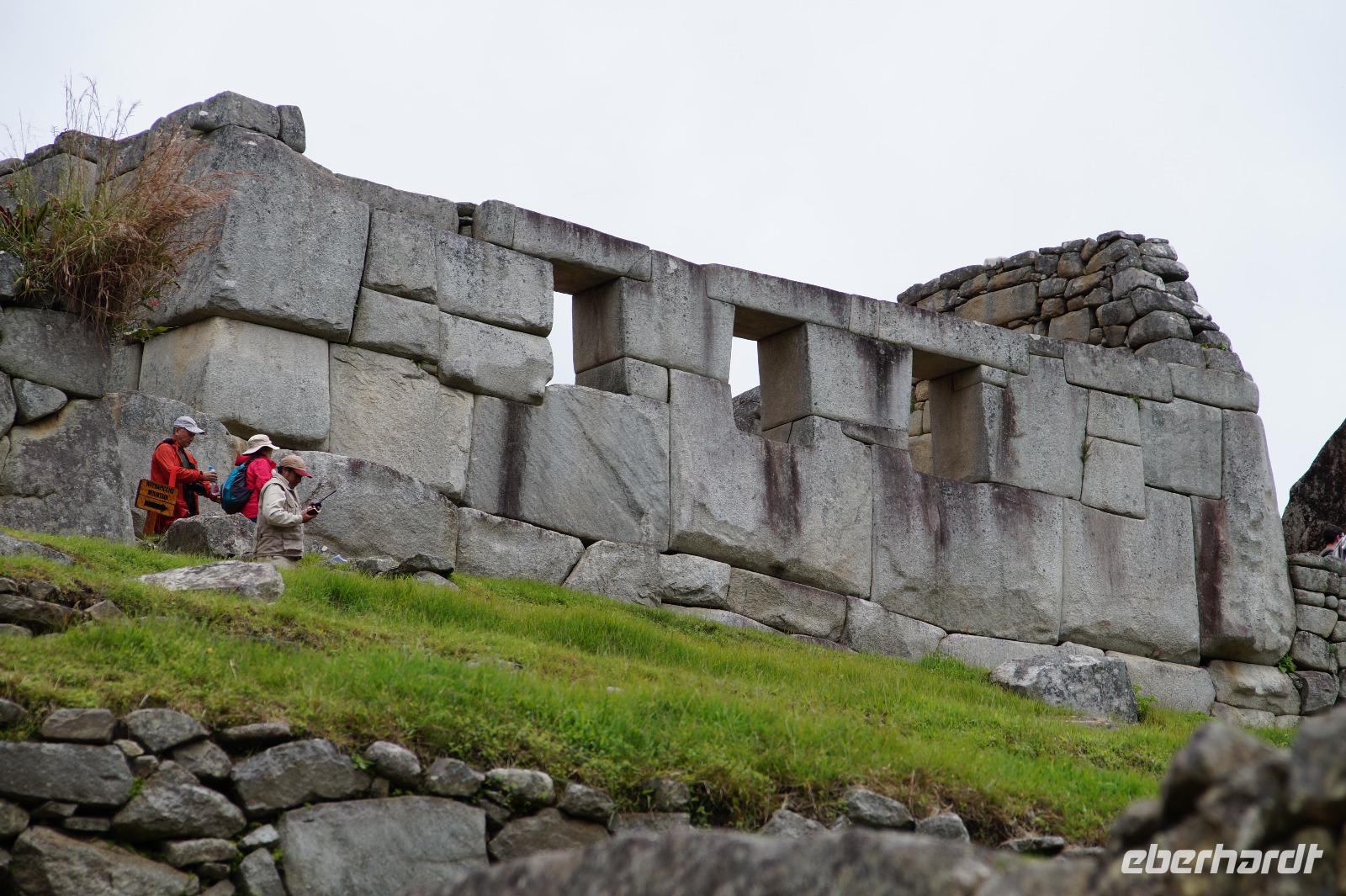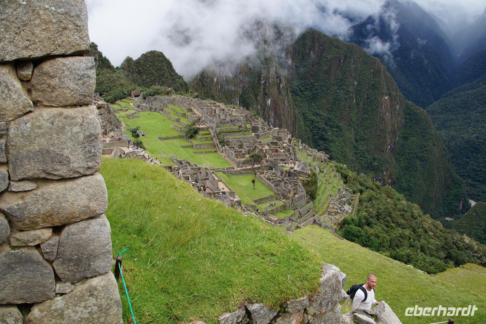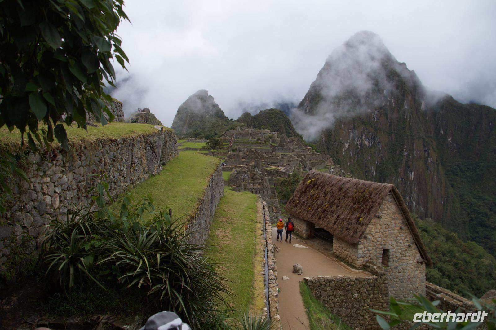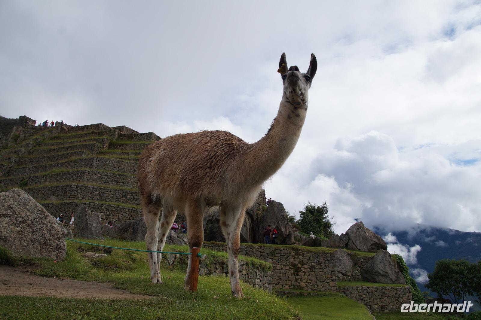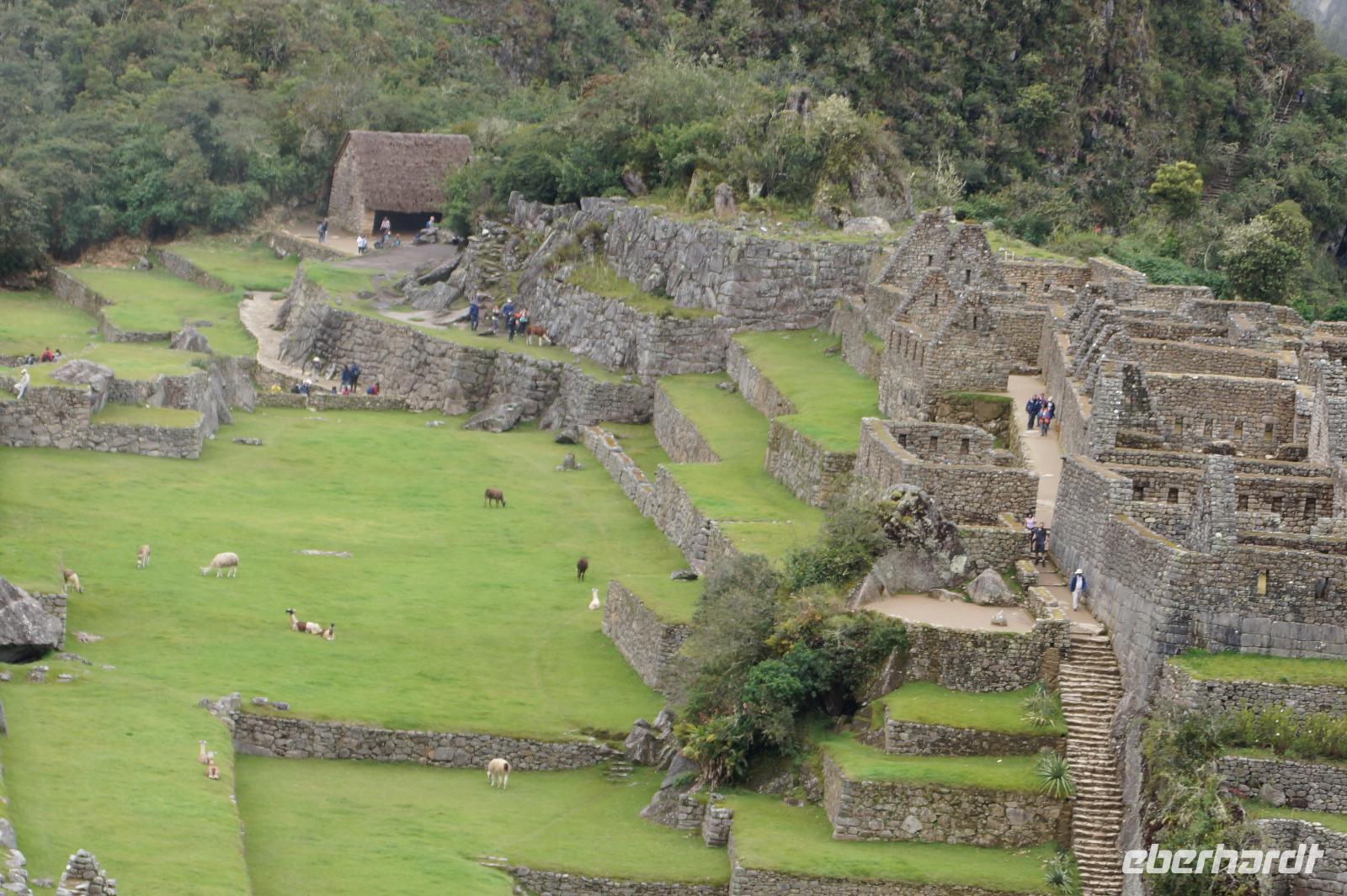 Mijaíl führt uns zunächst an den "Kühlschränken" vorbei zum sogenannten "Wächterhäuschen. Von hier aus hat man einen tollen Überblick über die Kernanlage und Mijaíl kann uns das Gelände und auch ihre Planung, wie sie mit uns Machu Picchu erfassbar machen will, erklären. Für das Rasenmähen sind in Machu Picchu im Übrigen einige Regierungslamas zuständig. Lamas und Alpacas eben zwar normalerweise im Altiplano und ernähren sich vom Ichugras, welches hier unten im Nebelwald nicht wächst, aber sie scheinen sich - abgesehen von den nervigen Touristen - hier ganz wohl zu fühlen. Die Regierung spart sich den Rasenmäher, Touristen und Natur den unvermeidlichen Lärm und die Touristen haben ein Fotomotiv mehr. Ob die Lamas das auch als Win-Win-Situation begreifen, ist nicht bekannt.