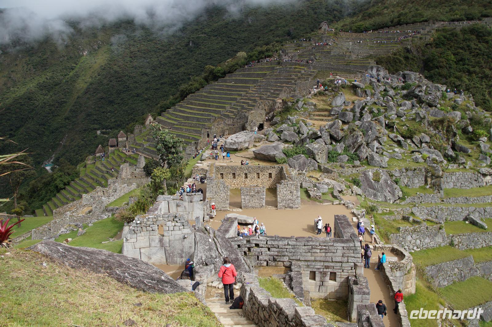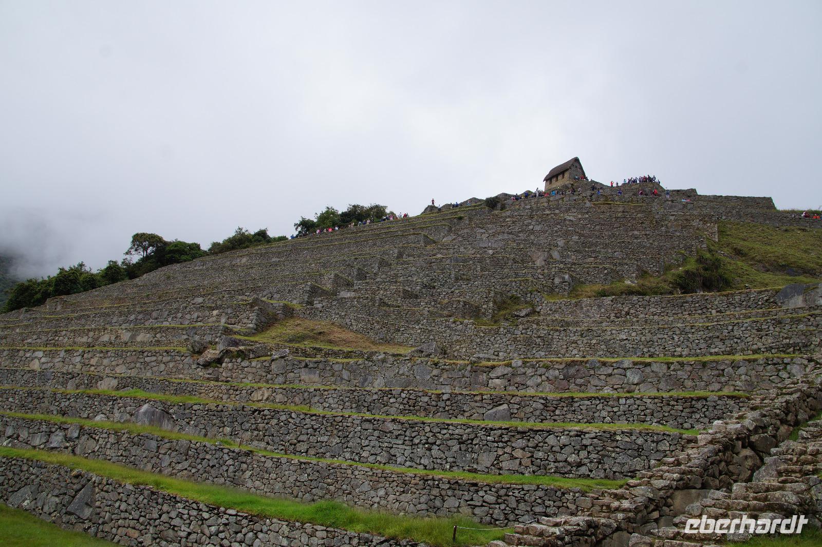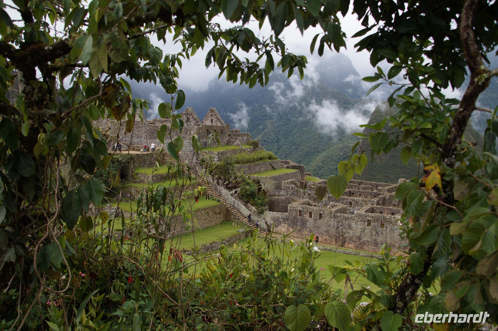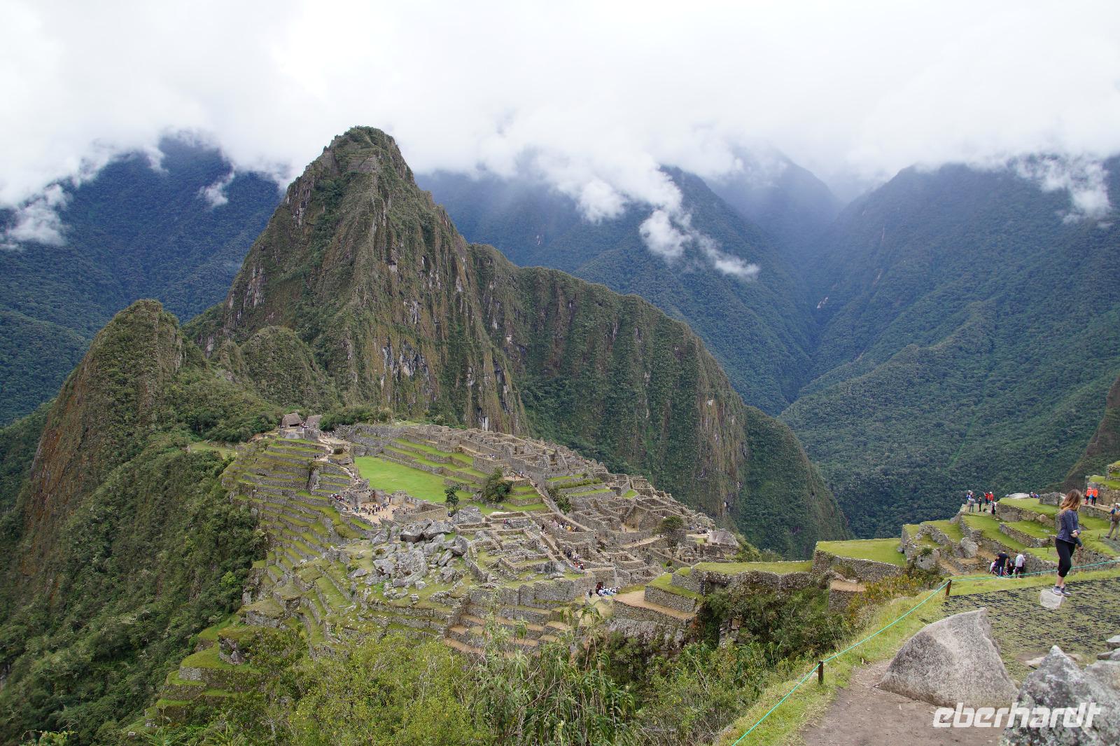 Mijaíl führt uns zunächst an den "Kühlschränken" vorbei zum sogenannten "Wächterhäuschen. Von hier aus hat man einen tollen Überblick über die Kernanlage und Mijaíl kann uns das Gelände und auch ihre Planung, wie sie mit uns Machu Picchu erfassbar machen will, erklären. Für das Rasenmähen sind in Machu Picchu im Übrigen einige Regierungslamas zuständig. Lamas und Alpacas eben zwar normalerweise im Altiplano und ernähren sich vom Ichugras, welches hier unten im Nebelwald nicht wächst, aber sie scheinen sich - abgesehen von den nervigen Touristen - hier ganz wohl zu fühlen. Die Regierung spart sich den Rasenmäher, Touristen und Natur den unvermeidlichen Lärm und die Touristen haben ein Fotomotiv mehr. Ob die Lamas das auch als Win-Win-Situation begreifen, ist nicht bekannt.