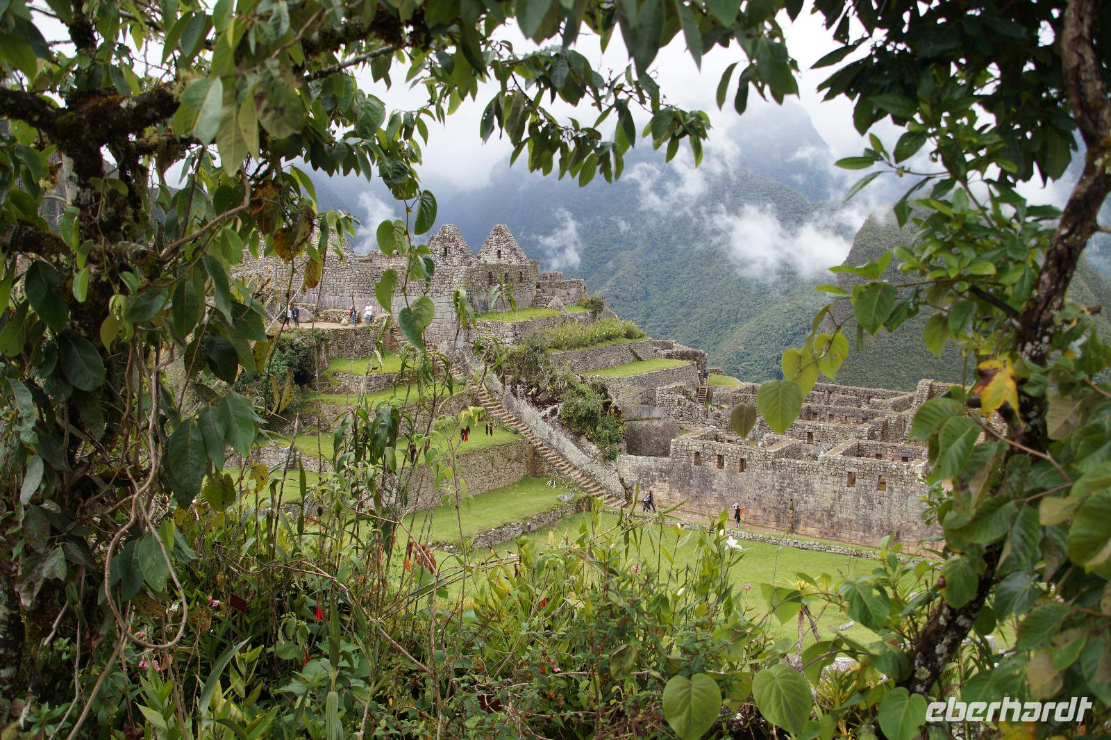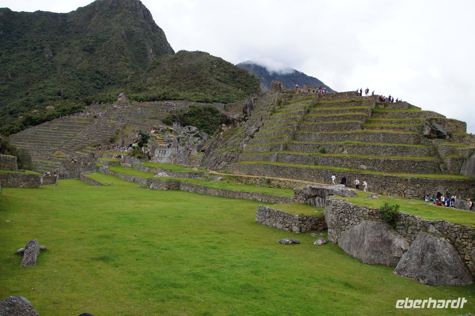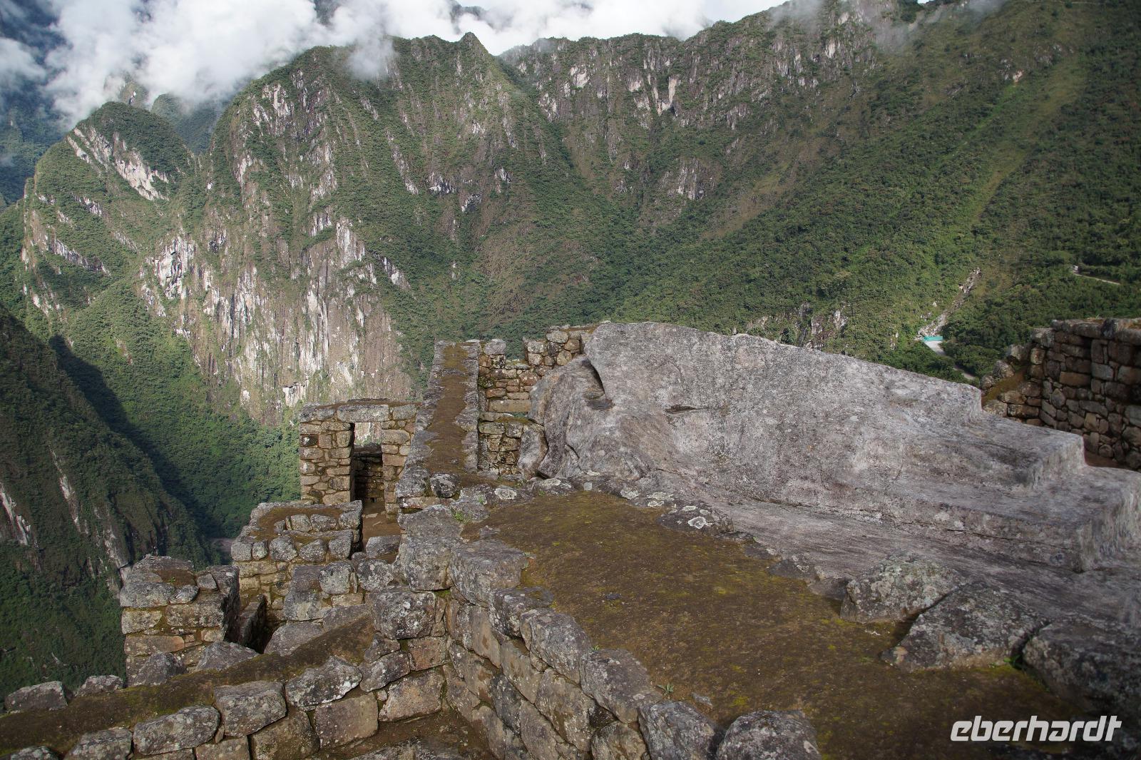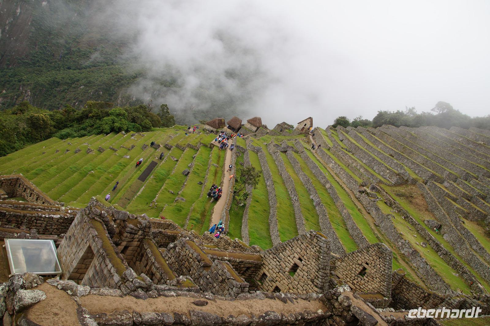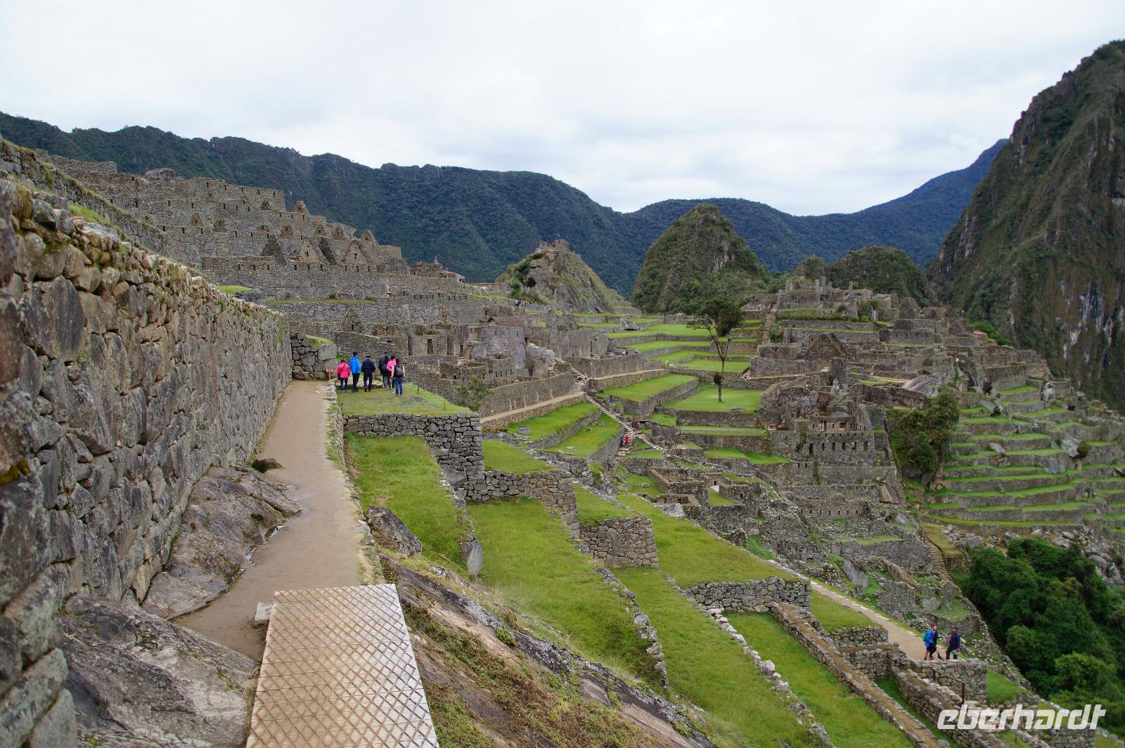 Mijaíl führt uns zunächst an den "Kühlschränken" vorbei zum sogenannten "Wächterhäuschen. Von hier aus hat man einen tollen Überblick über die Kernanlage und Mijaíl kann uns das Gelände und auch ihre Planung, wie sie mit uns Machu Picchu erfassbar machen will, erklären. Für das Rasenmähen sind in Machu Picchu im Übrigen einige Regierungslamas zuständig. Lamas und Alpacas eben zwar normalerweise im Altiplano und ernähren sich vom Ichugras, welches hier unten im Nebelwald nicht wächst, aber sie scheinen sich - abgesehen von den nervigen Touristen - hier ganz wohl zu fühlen. Die Regierung spart sich den Rasenmäher, Touristen und Natur den unvermeidlichen Lärm und die Touristen haben ein Fotomotiv mehr. Ob die Lamas das auch als Win-Win-Situation begreifen, ist nicht bekannt.