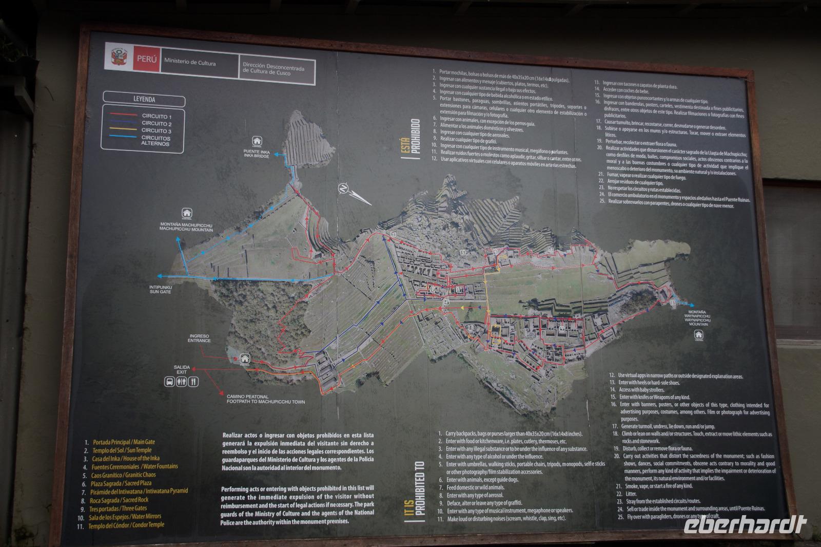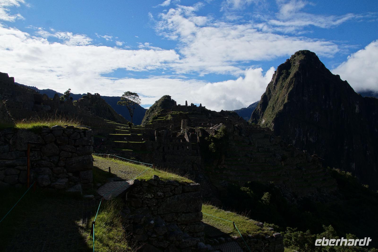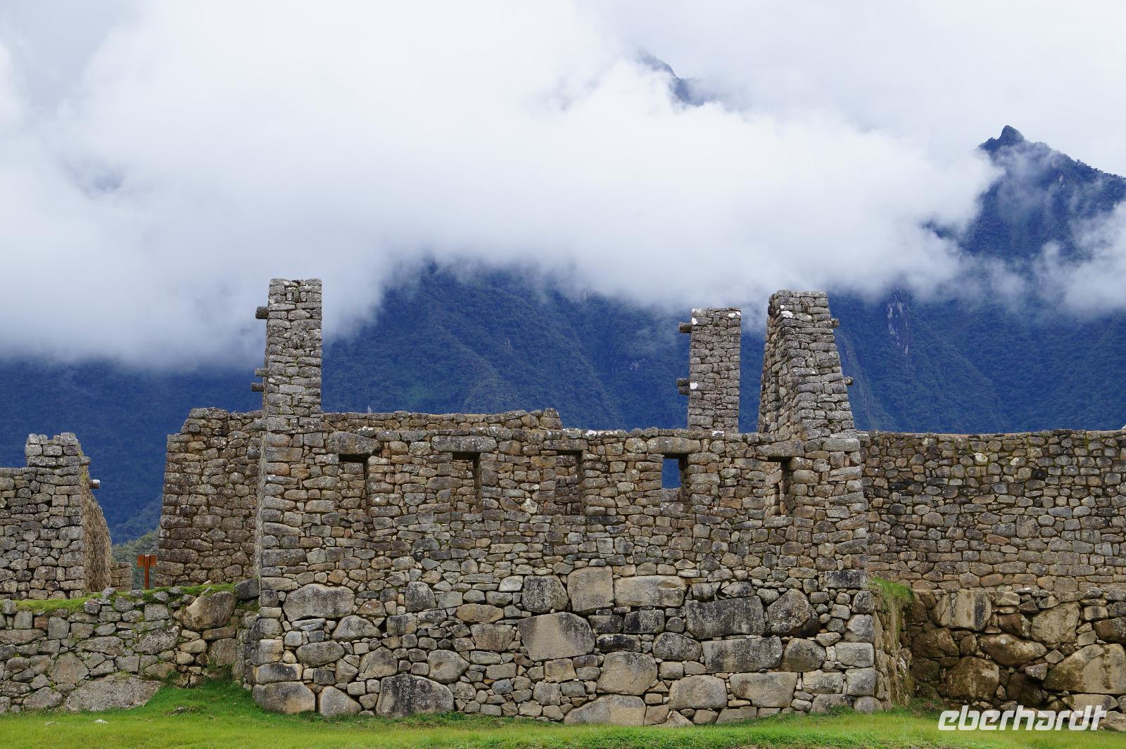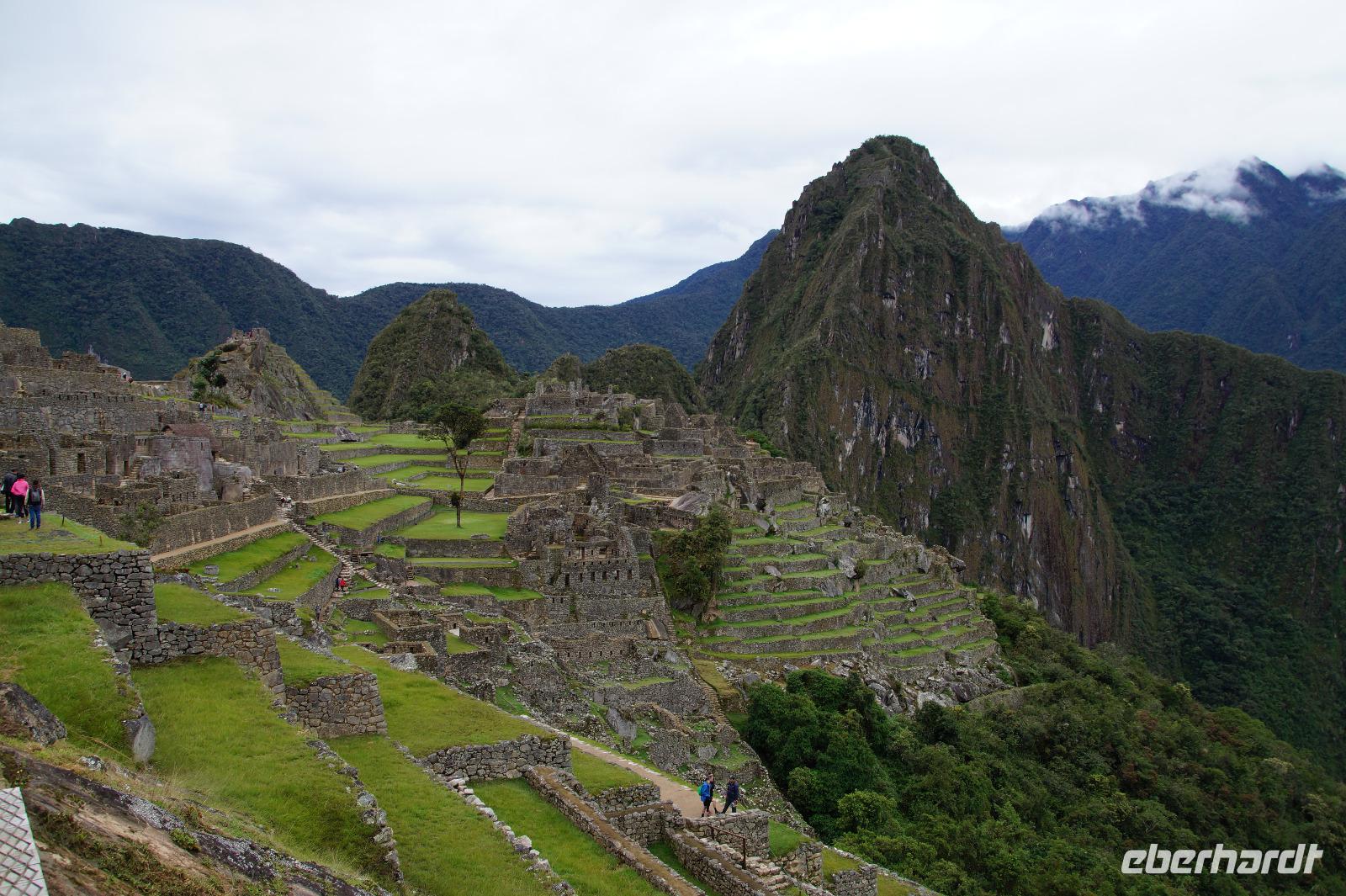 Mijaíl führt uns zunächst an den "Kühlschränken" vorbei zum sogenannten "Wächterhäuschen. Von hier aus hat man einen tollen Überblick über die Kernanlage und Mijaíl kann uns das Gelände und auch ihre Planung, wie sie mit uns Machu Picchu erfassbar machen will, erklären. Für das Rasenmähen sind in Machu Picchu im Übrigen einige Regierungslamas zuständig. Lamas und Alpacas eben zwar normalerweise im Altiplano und ernähren sich vom Ichugras, welches hier unten im Nebelwald nicht wächst, aber sie scheinen sich - abgesehen von den nervigen Touristen - hier ganz wohl zu fühlen. Die Regierung spart sich den Rasenmäher, Touristen und Natur den unvermeidlichen Lärm und die Touristen haben ein Fotomotiv mehr. Ob die Lamas das auch als Win-Win-Situation begreifen, ist nicht bekannt.