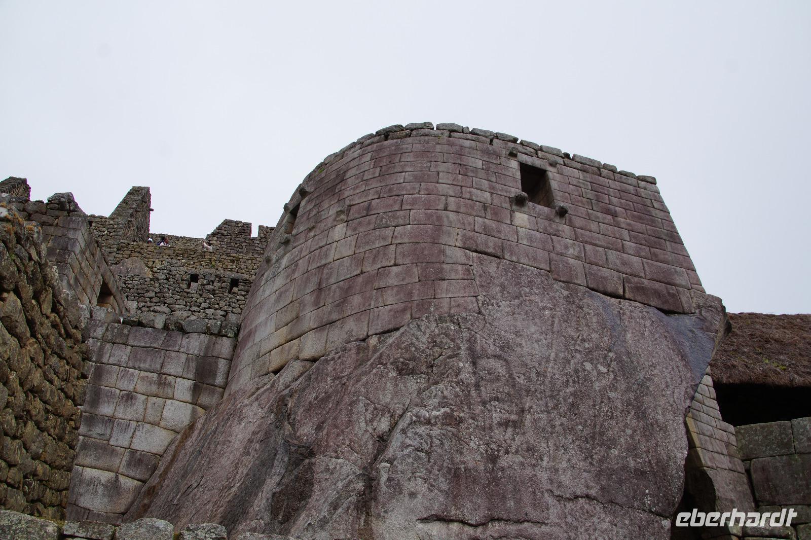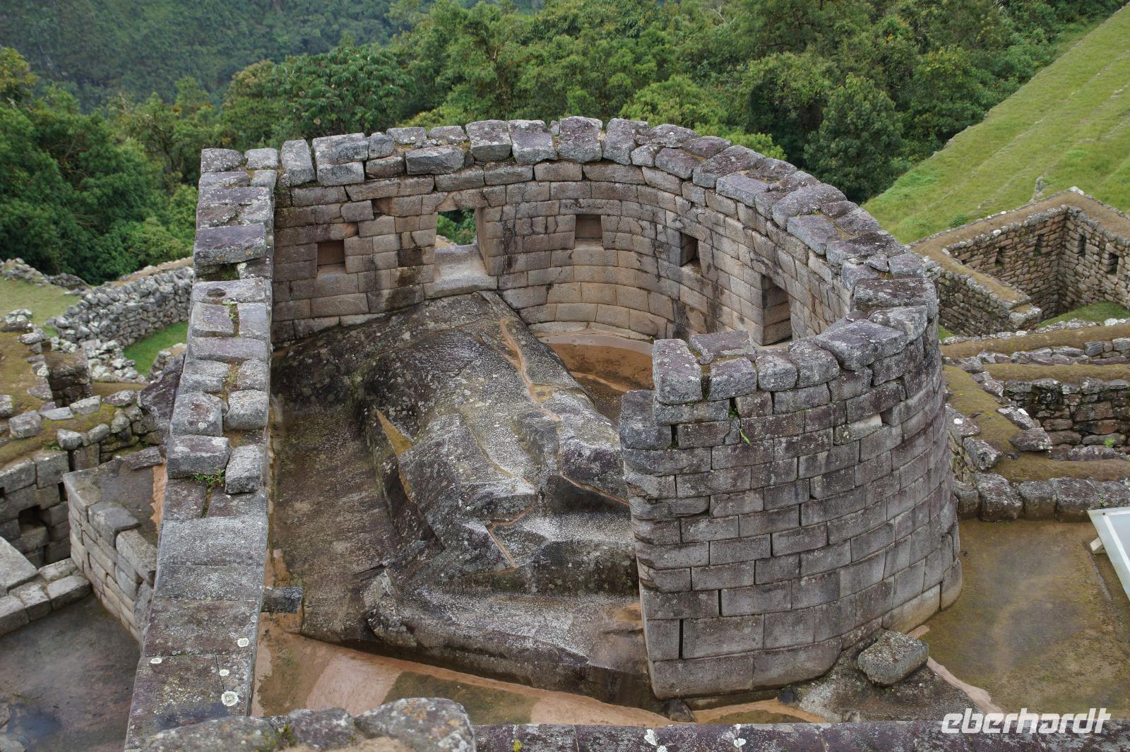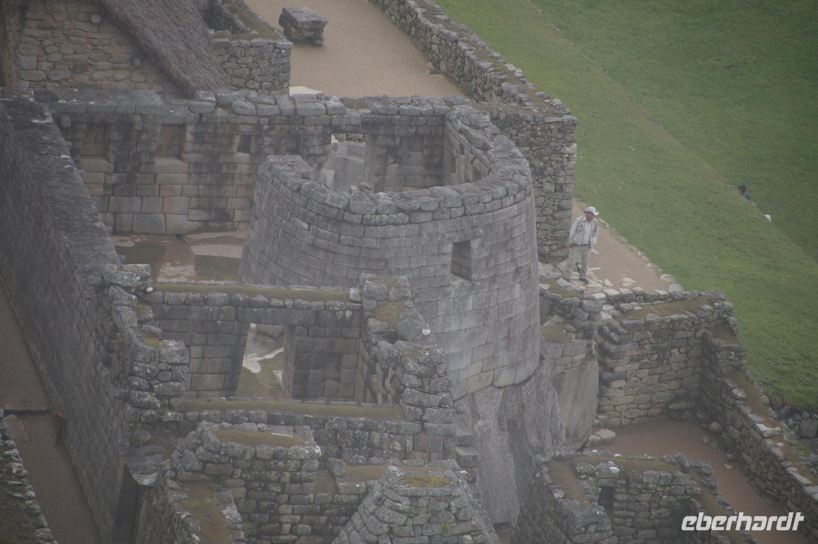 Zunächst gehen wir zum Sonnentempel, der, außer, dass er durch ein Fenster in Richtung Sonnenaufgang gekennzeichnet ist, eines der wenigen halbrunden Gebäude der Anlage darstellt, wie Mijaíl erklärt, ein typisches Charakteristikum für Sonnentempel der Inka.