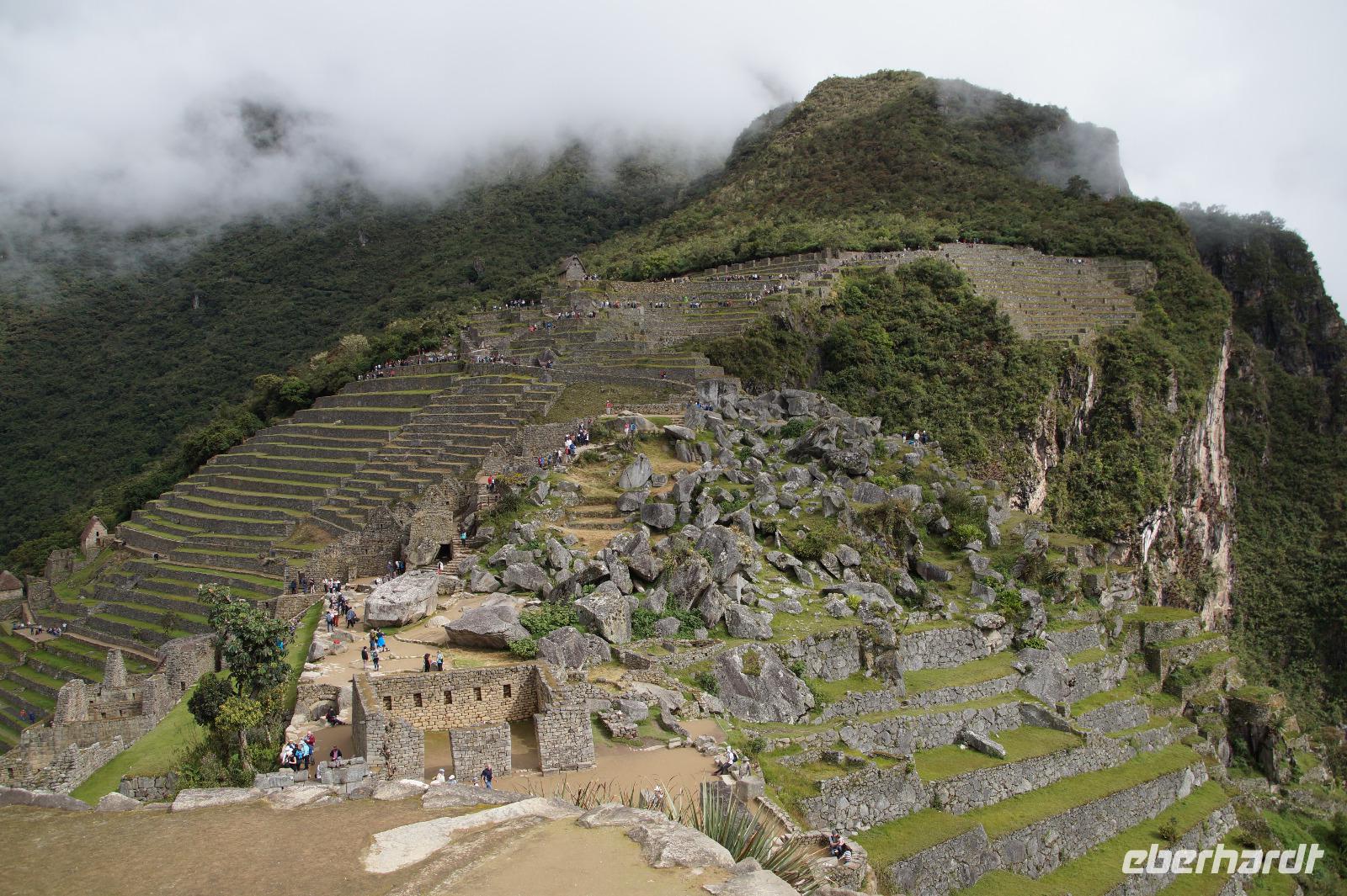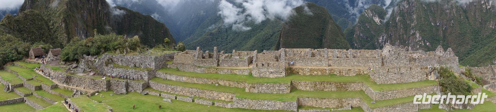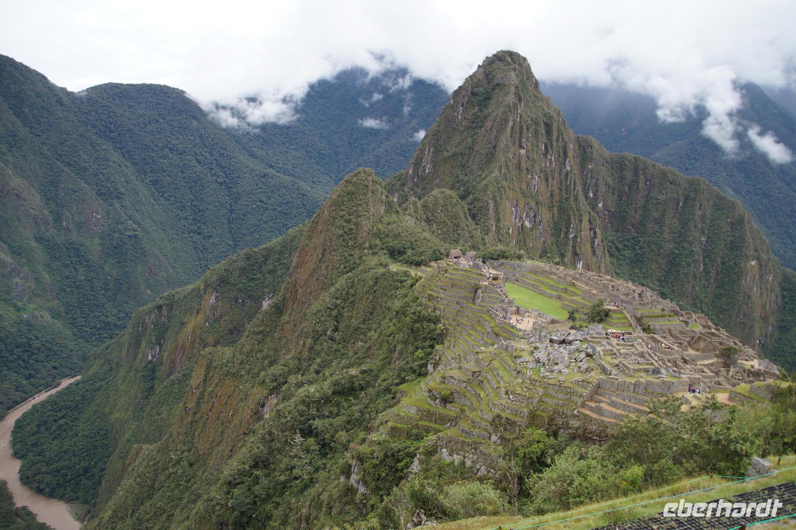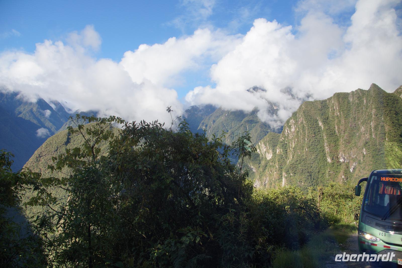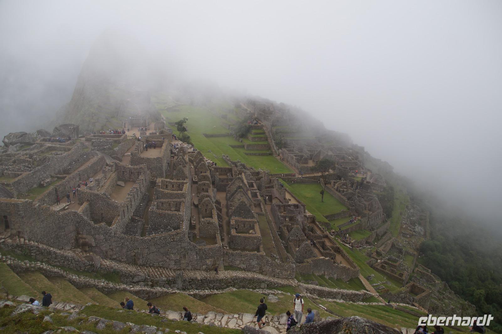 Am Bahnhof nehmen uns Bedienstete unseres Hotels unser Übernachtungsgepäck ab - wir haben vorgesorgt und wirklich nur das Gepäck für eine Nacht dabei - und wir fahren direkt hoch nach Machu Picchu. Heute ist es zwar bewölkt, aber zum Glück nicht nebelig. Obwohl der Nebel auch einen Teil der Mystik dieses Ortes ausmacht. Er hat nur den Nachteil... dass man keine Panoramafotos machen kann.