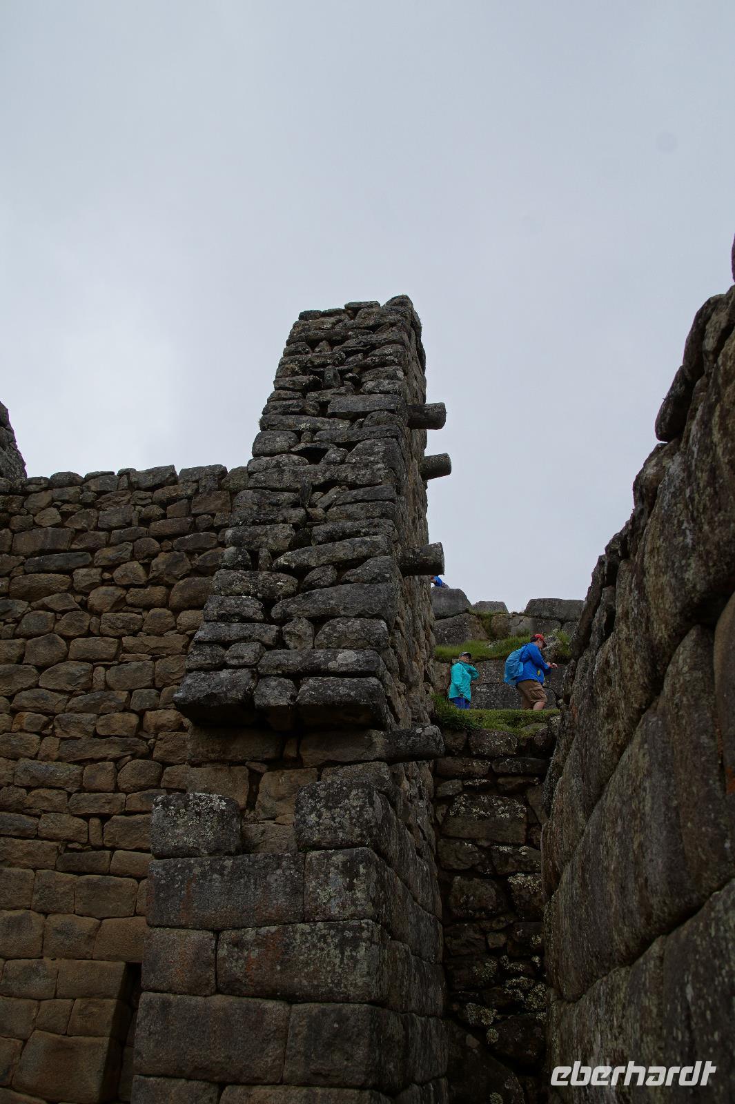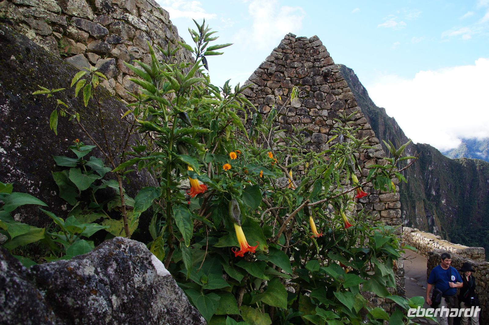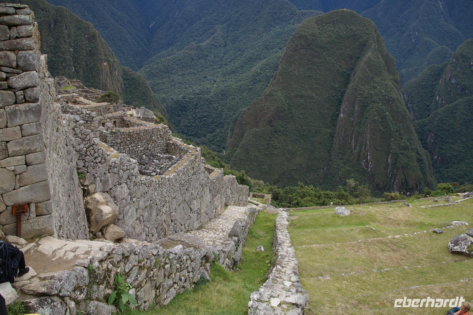 Wir kehren wieder zurück nach Machu Picchu, beim Stadttor trennen wir uns. Es ist heiß, die anderen beiden freuen sich auf ein kühles Blondes in Aguas Calientes und streben dem Ausgang zu, sie wollen nicht den Bus nach unten nehmen, sondern laufen. Das mit dem kühlen Blonden ist zwar verführerisch, aber ich will noch auf eigene Faust ein wenig durch die Inkaanlage streifen und das tue ich auch.