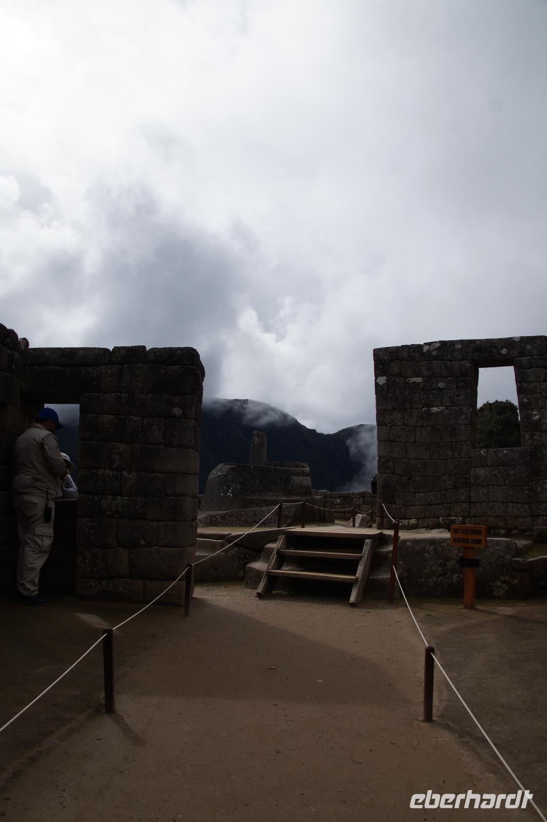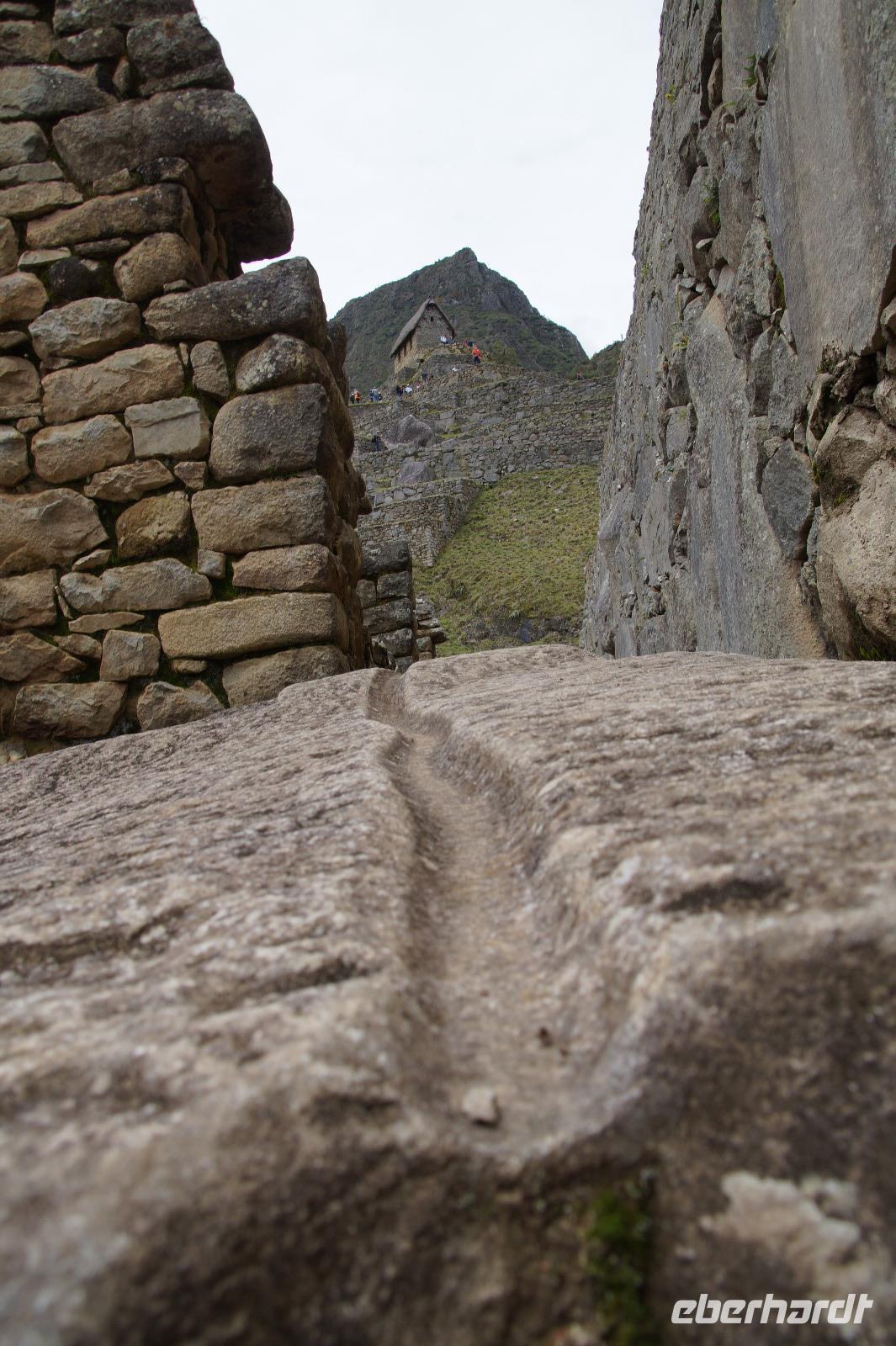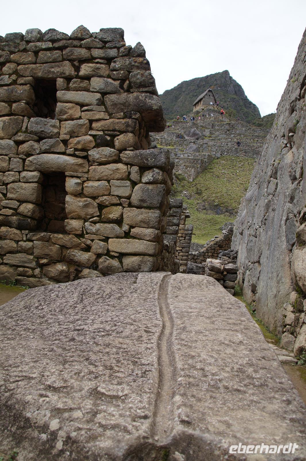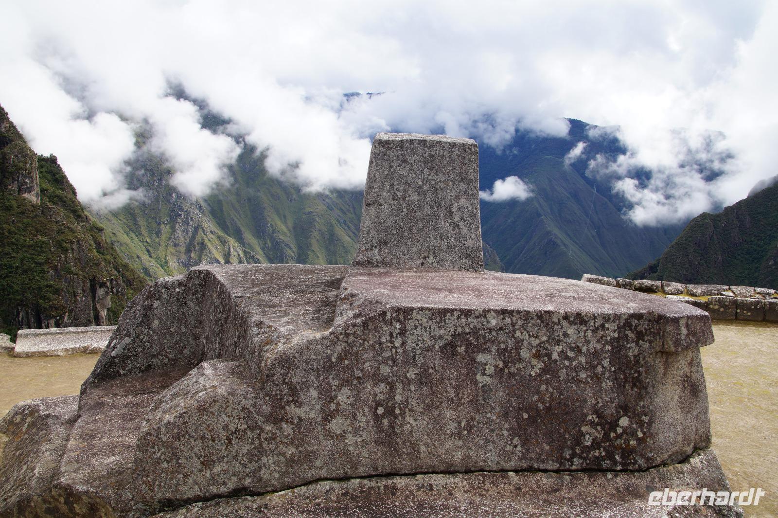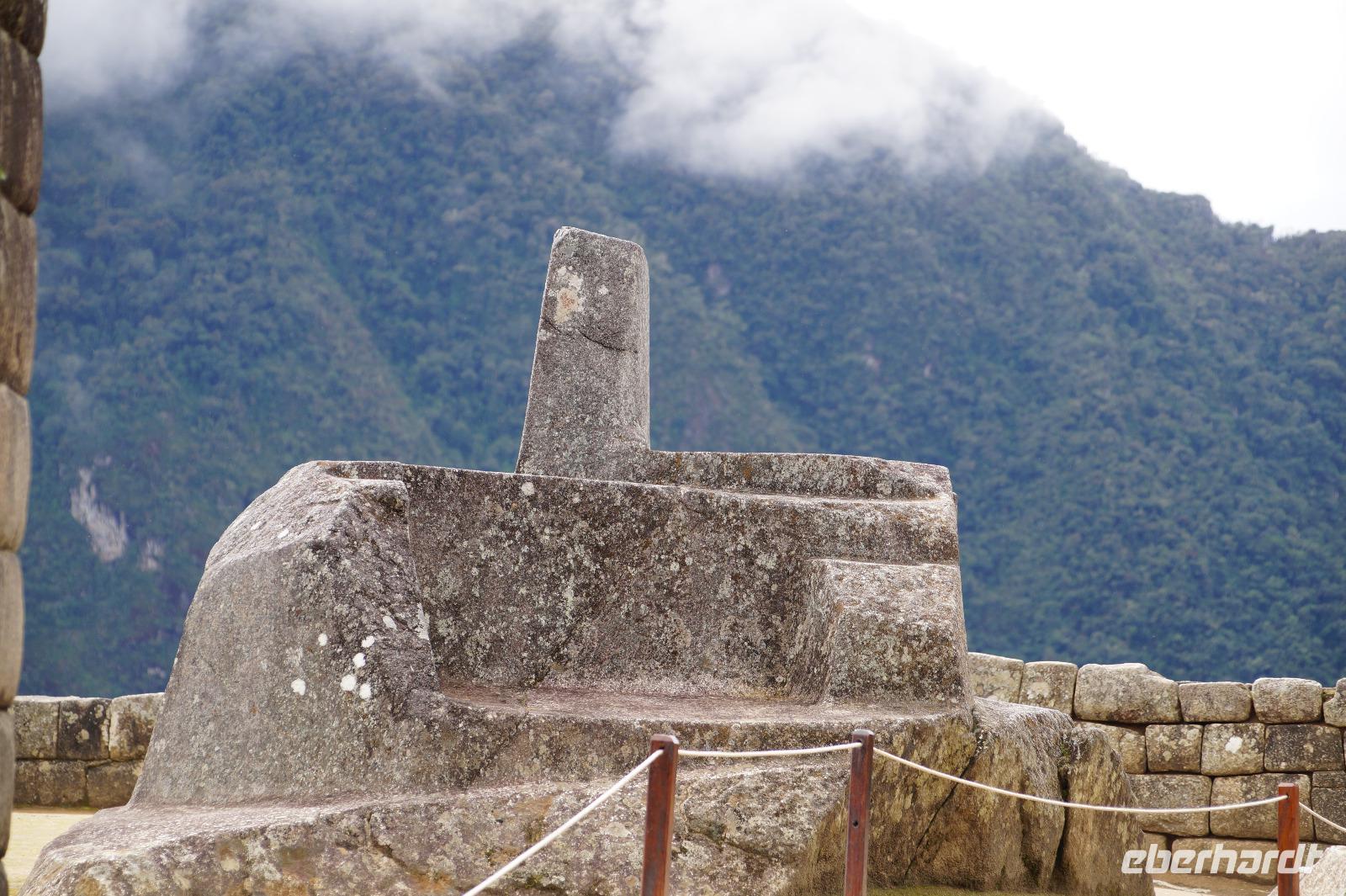 Wir steigen nun zum Intihuatana hoch. Alles, wo Inti drin steckt, hat etwas mit der Sonne zu tun. Intihuatana, gerne populär als "Sonnenuhr" bezeichnet, ist eigentlich der Ort, wo man die Sonne anbindet. Wie es heißt, hatten die Inka am kürzesten Tag des Jahres - dort der 21. Juni - Angst, dass die Sonne nicht mehr wiederkehren würde. Aus diesem Grund wollte man sie im übertragenen Sinne anbinden.
