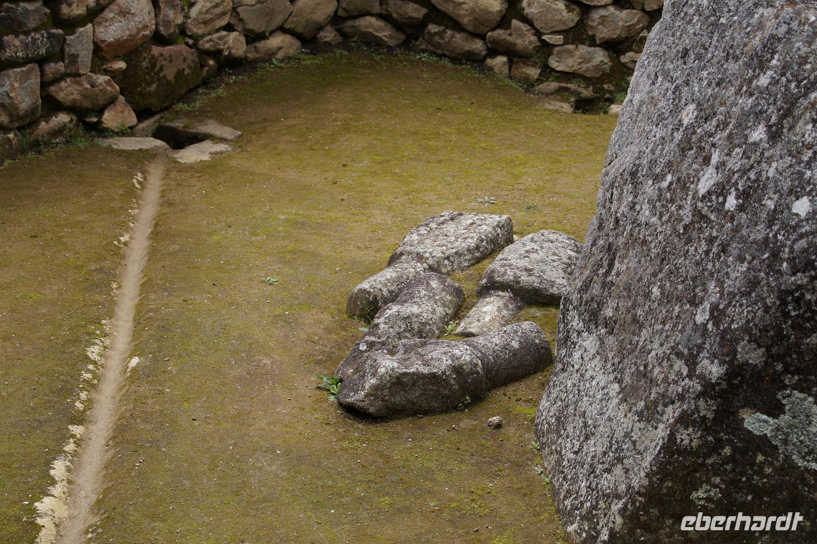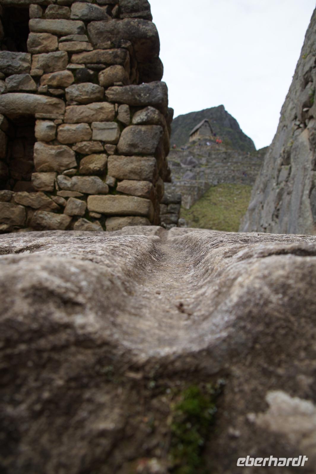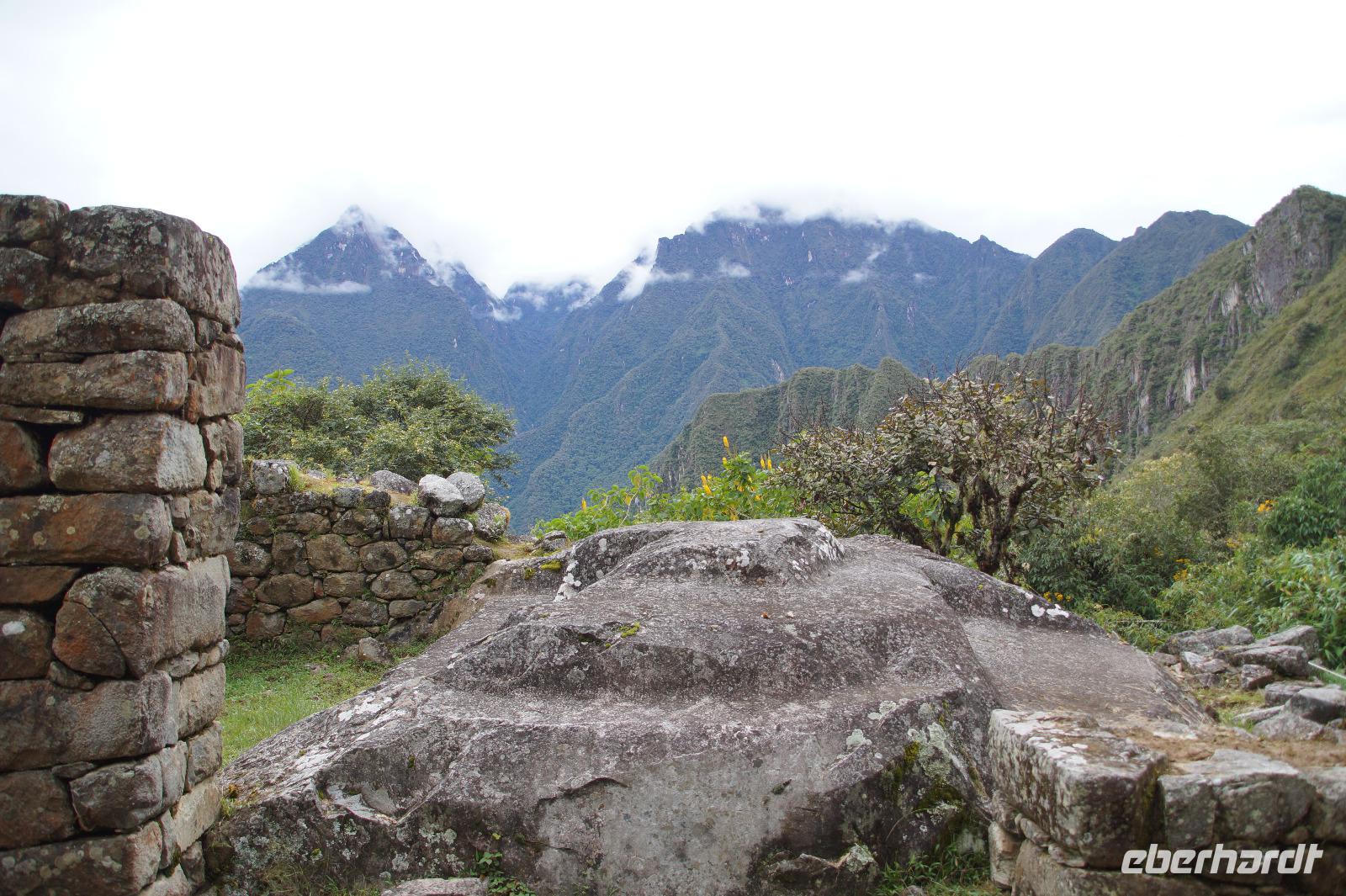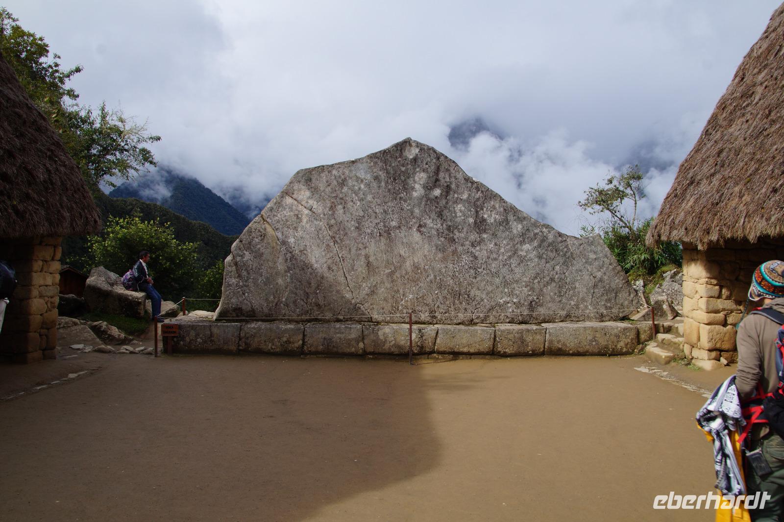 Wir steigen nun zum Intihuatana hoch. Alles, wo Inti drin steckt, hat etwas mit der Sonne zu tun. Intihuatana, gerne populär als "Sonnenuhr" bezeichnet, ist eigentlich der Ort, wo man die Sonne anbindet. Wie es heißt, hatten die Inka am kürzesten Tag des Jahres - dort der 21. Juni - Angst, dass die Sonne nicht mehr wiederkehren würde. Aus diesem Grund wollte man sie im übertragenen Sinne anbinden.
