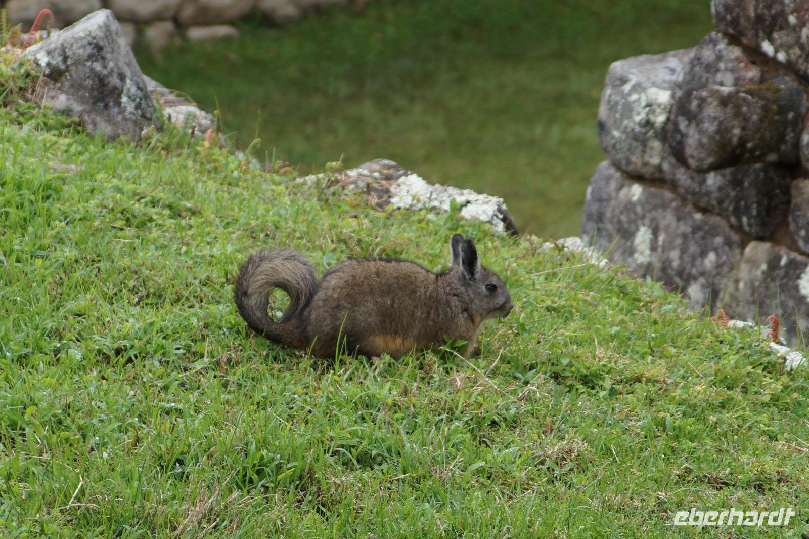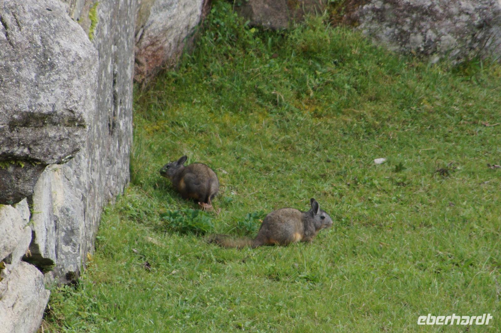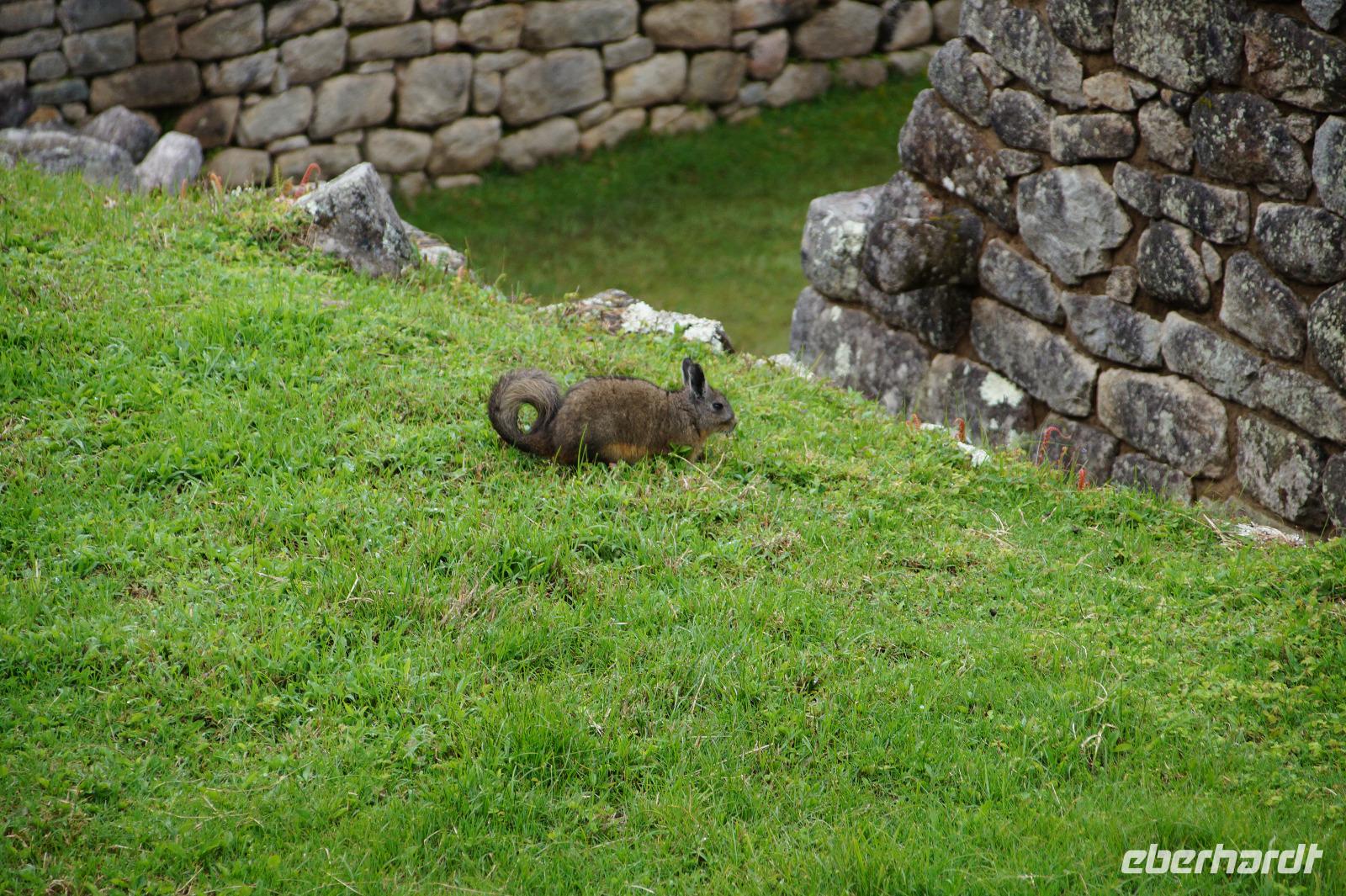 Unterstützt werden die Neuweltkamele von Hasenmäusen, den Bergviscachas, die hier in Machu Picchu zahlreich leben. Diese Tiere aus der Chinchillafamilie (aber nicht unsere handelsüblichen Zoohandlungschinchillas) sehen ein wenig so aus, als habe ein verrückter Wissenschaftler Gott gespielt und Kaninchen mit Eichhörnchen gekreuzt.